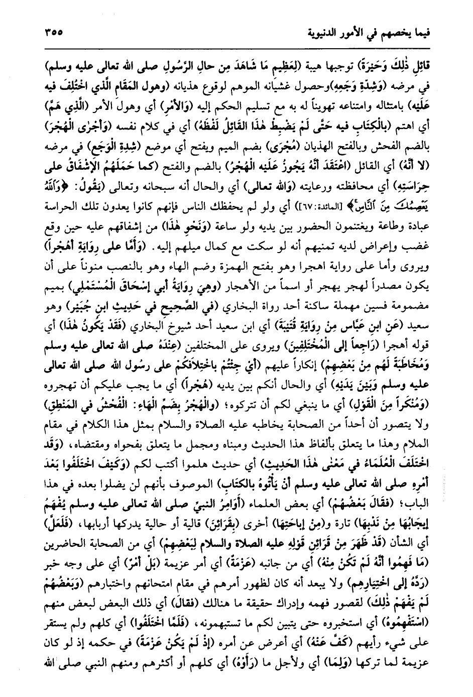 قائل ذلك وحيرة) توجبها هيبة (لِعَظِيمِ مَا شَاهَدَ مِنْ حَالِ الرَّسُولِ صَلَّى الله تعالى عليه وسلم) في مرضه (وشدّة وجعه) وحصول غشيانه الموهم لوقوع هذيانه (وهول المقام الّذي اختلف فيه عليه) بامتثاله وامتناعه تهوينا له به مع تسليم الحكم إليه (والأمر) أي وهول الأمر (الّذي همّ) أي اهتم (بِالْكِتَابِ فِيهِ حَتَّى لَمْ يَضْبِطْ هَذَا الْقَائِلُ لفظه) أي في كلام نفسه (وأجرى الهجر) بالضم الفحش وبالفتح الهذيان (مجرى) بضم الميم ويفتح أي موضع (شدة الوجع) في مرضه (لا أنّه) أي القائل (اعتقد أنّه يجوز عليه الهجر) بالضم والفتح (كما حملهم الإشفاق على حراسته) أي محافظته ورعايته (والله تعالى) أي والحال أنه سبحانه وتعالى (يقول: وَاللَّهُ يَعْصِمُكَ مِنَ النَّاسِ [المائدة: 67] ) أي ولو لم يحفظك الناس فإنهم كانوا يعدون تلك الحراسة عبادة وطاعة ويغتنمون الحضور بين يديه ولو ساعة (ونحو هذا) من إشفاقهم عليه حين وقع غضب وإعراض لديه تمنيهم أنه لو سكت مع كمال ميلهم إليه. (وأمّا على رواية أهجرا) ويروى وأما على رواية اهجرا وهو بفتح الهمزة وضم الهاء وهو بالنصب منونا على أن يكون مصدرا لهجر يهجر أو اسما من الأهجار (وهي رواية أبي إسحاق المستملي) بميم مضمومة فسين مهملة ساكنة أحد رواة البخاري (في الصّحيح في حديث ابن جبير) وهو سعيد (عن ابن عبّاس من رواية قتيبة) أي ابن سعيد أحد شيوخ البخاري (فقد يكون هذا) أي قوله أهجرا (راجعا إلى المختلفين) ويروى على المختلفين (عنده صلى الله تعالى عليه وسلم ومخاطبة لهم من بعضهم) إنكارا عليهم (أَيْ جِئْتُمْ بِاخْتِلَافِكُمْ عَلَى رَسُولِ اللَّهِ صَلَّى الله تعالى عليه وسلم وبين يديه) أي والحال أنكم بين يديه (هجرا) أي ما يجب عليكم أن تهجروه (ومنكرا من القول) أي ما ينبغي لكم أن تتركوه؛ (والهجر بضمّ الهاء: الفحش في المنطق) ولا يتصور أن أحدا من الصحابة يخاطبه عليه الصلاة والسلام بمثل هذا الكلام في مقام الملام وهذا ما يتعلق بألفاظ هذا الحديث ومبناه ومجمل ما يتعلق بفحواه ومقتضاه، (وَقَدِ اخْتَلَفَ الْعُلَمَاءُ فِي مَعْنَى هَذَا الْحَدِيثِ) أي حديث هلموا أكتب لكم (وكيف اختلفوا بعد أمره صلى الله تعالى عليه وسلم أن يأتوه بالكتاب) الموصوف بأنهم لن يضلوا بعده في هذا الباب؛ (فقال بعضهم) أي بعض العلماء (أوامر النبيّ صلى الله تعالى عليه وسلم يفهم إيجابها من ندبها) تارة و (من إباحتها) أخرى (بقرائن) قالية أو حالية يدركها أربابها، (فلعلّ) أي الشأن (قد ظهر من قرائن قوله عليه الصلاة والسلام لبعضهم) أي من الصحابة الحاضرين (ما فهموا أنّه لم تكن منه) أي من جانبه (عزمة) أي أمر عزيمة (بل أمر) أي على وجه خبر (ردّه إلى اختيارهم) ولا يبعد أنه كان لظهور أمرهم في مقام امتحانهم واختبارهم (وبعضهم لم يفهم ذلك) لقصور فهمه وإدراك حقيقة ما هنالك (فقال) أي ذلك البعض لبعض منهم (استفهموه) أي استخبروه حتى يتبين لكم ما تستبهمونه، (فلمّا اختلفوا) أي كلهم ولم يستقر على شيء رأيهم (كفّ عنه) أي أعرض عن أمره (إذ لم يكن عزمة) في حكمه إذ لو كان عزيمة لما تركها (ولما) أي ولأجل ما (رأوه) أي كلهم أو أكثرهم ومنهم النبي صلى الله