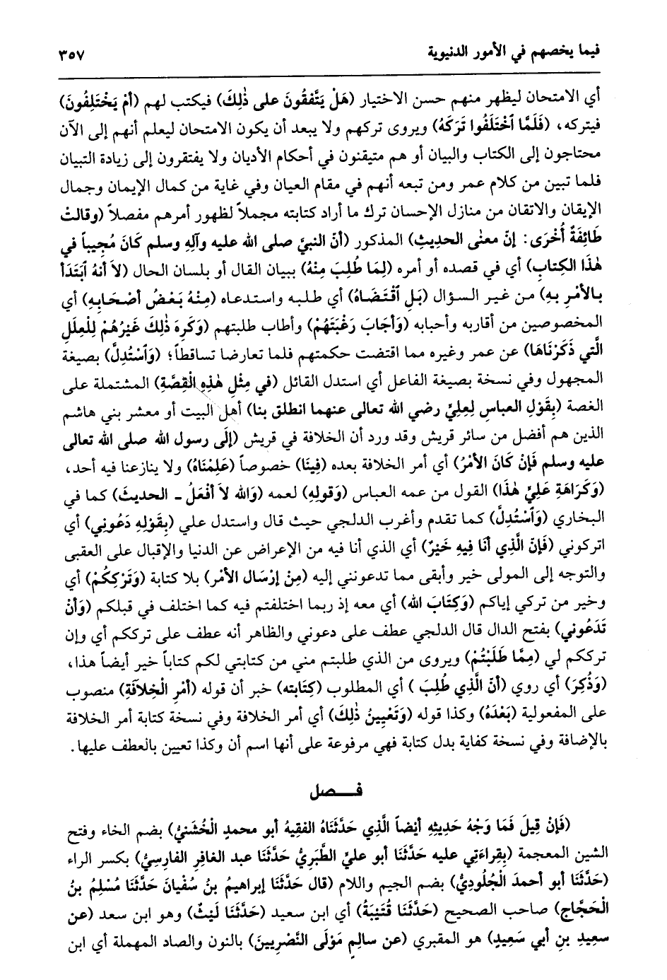 أي الامتحان ليظهر منهم حسن الاختيار (هل يتّفقون على ذلك) فيكتب لهم (أم يختلفون) فيتركه، (فلمّا اختلفوا تركه) ويروى تركهم ولا يبعد أن يكون الامتحان ليعلم أنهم إلى الآن محتاجون إلى الكتاب والبيان أو هم متيقنون في أحكام الأديان ولا يفتقرون إلى زيادة التبيان فلما تبين من كلام عمر ومن تبعه أنهم في مقام العيان وفي غاية من كمال الإيمان وجمال الإيقان والاتقان من منازل الإحسان ترك ما أراد كتابته مجملا لظهور أمرهم مفصلا (وقالت طائفة أخرى: إنّ معنى الحديث) المذكور (أنّ النبيّ صلى الله عليه وآله وسلم كان مجيبا في هذا الكتاب) أي في قصده أو أمره (لما طلب منه) ببيان القال أو بلسان الحال (لا أنه ابتدأ بالأمر به) من غير السؤال (بل اقتضاه) أي طلبه واستدعاه (منه بعض أصحابه) أي المخصوصين من أقاربه وأحبابه (وأجاب رغبتهم) وأطاب طلبتهم (وكره ذلك غيرهم للعلل الّتي ذكرناها) عن عمر وغيره مما اقتضت حكمتهم فلما تعارضا تساقطا؛ (واستدلّ) بصيغة المجهول وفي نسخة بصيغة الفاعل أي استدل القائل (في مثل هذه القصّة) المشتملة على الغصة (بقول العباس لعليّ رضي الله تعالى عنهما انطلق بنا) أهل البيت أو معشر بني هاشم الذين هم أفضل من سائر قريش وقد ورد أن الخلافة في قريش (إلى رسول الله صلى الله تعالى عليه وسلم فإن كان الأمر) أي أمر الخلافة بعده (فينا) خصوصا (علمناه) ولا ينازعنا فيه أحد، (وكراهة عليّ هذا) القول من عمه العباس (وقوله) لعمه (والله لا أفعل- الحديث) كما في البخاري (واستدلّ) كما تقدم وأغرب الدلجي حيث قال واستدل علي (بقوله دعوني) أي اتركوني (فَإِنَّ الَّذِي أَنَا فِيهِ خَيْرٌ) أَيِ الَّذِي أنا فيه من الإعراض عن الدنيا والإقبال على العقبى والتوجه إلى المولى خير وأبقى مما تدعونني إليه (من إرسال الأمر) بلا كتابة (وترككم) أي وخير من تركي إياكم (وكتاب الله) أي معه إذ ربما اختلفتم فيه كما اختلف في قبلكم (وأن تدعوني) بفتح الدال قال الدلجي عطف على دعوني والظاهر أنه عطف على ترككم أي وإن ترككم لي (ممّا طلبتم) ويروى من الذي طلبتم مني من كتابتي لكم كتابا خير أيضا هذا، (وذكر) أي روي (أنّ الّذي طلب) أي المطلوب (كتابته) خبر أن قوله (أمر الخلافة) منصوب على المفعولية (بعده) وكذا قوله (وتعيين ذلك) أي أمر الخلافة وفي نسخة كتابة أمر الخلافة بالإضافة وفي نسخة كفاية بدل كتابة فهي مرفوعة على أنها اسم أن وكذا تعيين بالعطف عليها.