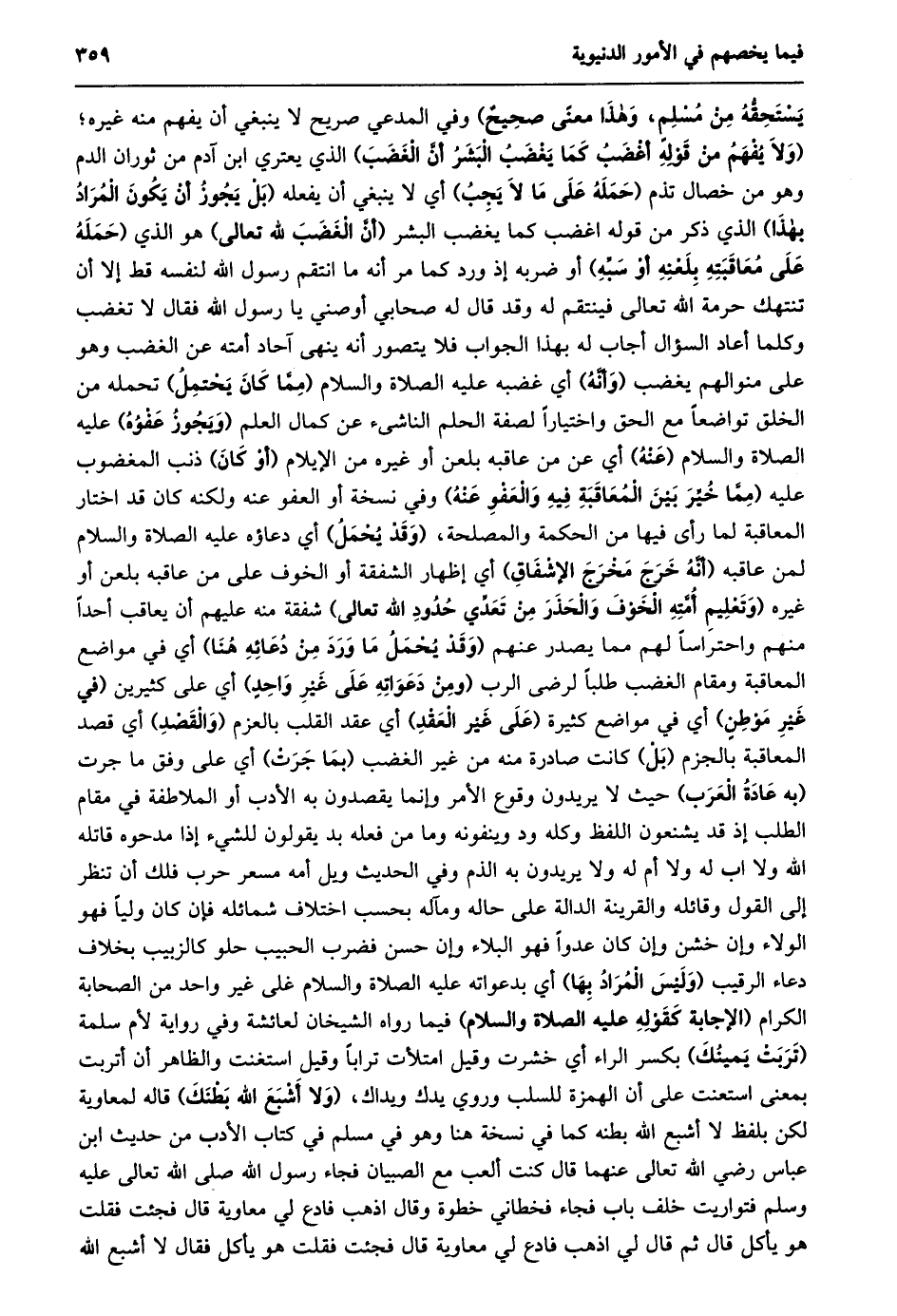 يستحقّه من مسلم، وهذا معنى صحيح) وفي المدعي صريح لا ينبغي أن يفهم منه غيره؛ (وَلَا يُفْهَمُ مِنْ قَوْلِهِ أَغْضَبُ كَمَا يَغْضَبُ البشر أنّ الغضب) الذي يعتري ابن آدم من ثوران الدم وهو من خصال تذم (حمله على ما لا يجب) أي لا ينبغي أن يفعله (بل يجوز أن يكون المراد بهذا) الذي ذكر مِنْ قَوْلِهِ أَغْضَبُ كَمَا يَغْضَبُ الْبَشَرُ (أَنَّ الغضب لله تعالى) هو الذي (حمله على معاقبته بلعنه أو سبّه) أو ضربه إذ ورد كما مر أنه ما انتقم رسول الله لنفسه قط إِلَّا أَنْ تُنْتَهَكَ حُرْمَةُ اللَّهِ تَعَالَى فَيَنْتَقِمُ له وقد قال له صحابي أوصني يا رسول الله فقال لا تغضب وكلما أعاد السؤال أجاب له بهذا الجواب فلا يتصور أنه ينهى آحاد أمته عن الغضب وهو على منوالهم يغضب (وأنّه) أي غضبه عليه الصلاة والسلام (ممّا كان يحتمل) تحمله من الخلق تواضعا مع الحق واختيارا لصفة الحلم الناشىء عن كمال العلم (ويجوز عفوه) عليه الصلاة والسلام (عنه) أي عن من عاقبه بلعن أو غيره من الإيلام (أو كان) ذنب المغضوب عليه (مِمَّا خُيِّرَ بَيْنَ الْمُعَاقَبَةِ فِيهِ وَالْعَفْوِ عَنْهُ) وفي نسخة أو العفو عنه ولكنه كان قد اختار المعاقبة لما رأى فيها من الحكمة والمصلحة، (وقد يحمل) أي دعاؤه عليه الصلاة والسلام لمن عاقبه (أنّه خرج مخرج الإشفاق) أي إظهار الشفقة أو الخوف على من عاقبه بلعن أو غيره (وَتَعْلِيمِ أُمَّتِهِ الْخَوْفَ وَالْحَذَرَ مِنْ تَعَدِّي حُدُودِ الله تعالى) شفقة منه عليهم أن يعاقب أحدا منهم واحتراسا لهم مما يصدر عنهم (وَقَدْ يُحْمَلُ مَا وَرَدَ مِنْ دُعَائِهِ هُنَا) أي في مواضع المعاقبة ومقام الغضب طلبا لرضى الرب (ومن دعواته على غير واحد) أي على كثيرين (في غير موطن) أي في مواضع كثيرة (على غير العقد) أي عقد القلب بالعزم (والقصد) أي قصد المعاقبة بالجزم (بل) كانت صادرة منه من غير الغضب (بما جرت) أي على وفق ما جرت (به عادة العرب) حيث لا يريدون وقوع الأمر وإنما يقصدون به الأدب أو الملاطفة في مقام الطلب إذ قد يشنعون اللفظ وكله ود وينفونه وما من فعله بد يقولون للشيء إذا مدحوه قاتله الله ولا اب له ولا أم له ولا يريدون به الذم وفي الحديث ويل أمه مسعر حرب فلك أن تنظر إلى القول وقائله والقرينة الدالة على حاله ومآله بحسب اختلاف شمائله فإن كان وليا فهو الولاء وإن خشن وإن كان عدوا فهو البلاء وإن حسن فضرب الحبيب حلو كالزبيب بخلاف دعاء الرقيب (وليس المراد بها) أي بدعواته عليه الصلاة والسلام غلى غير واحد من الصحابة الكرام (الإجابة كقوله عليه الصلاة والسلام) فيما رواه الشيخان لعائشة وفي رواية لأم سلمة (تربت يمينك) بكسر الراء أي خشرت وقيل امتلأت ترابا وقيل استغنت والظاهر أن أتربت بمعنى استعنت على أن الهمزة للسلب وروي يدك ويداك، (ولا أشبع الله بطنك) قاله لمعاوية لكن بلفظ لا أشبع الله بطنه كما في نسخة هنا وهو في مسلم في كتاب الأدب من حديث ابن عباس رضي الله تعالى عنهما قال كنت ألعب مع الصبيان فجاء رسول الله صلى الله تعالى عليه وسلم فتواريت خلف باب فجاء فخطاني خطوة وقال اذهب فادع لي معاوية قال فجئت فقلت هو يأكل قال ثم قال لي اذهب فادع لي معاوية قال فجئت فقلت هو يأكل فقال لا أشبع الله