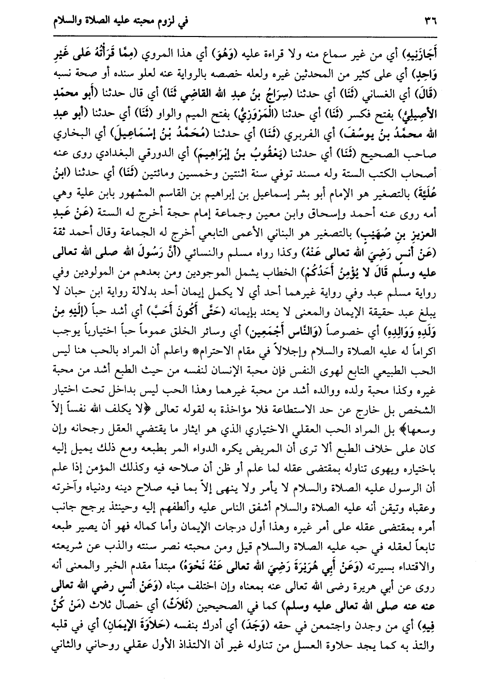أجازنيه) أي من غير سماع منه ولا قراءة عليه (وهو) أي هذا المروي (ممّا قرأته على غير واحد) أي على كثير من المحدثين غيره ولعله خصصه بالرواية عنه لعلو سنده أو صحة نسبه (قال) أي الغساني (ثنا) أي حدثنا (سراج بن عبد الله القاضي ثنا) أي قال حدثنا (أبو محمّد الأصيليّ) بفتح فكسر (ثنا) أي حدثنا (المروزي) بفتح الميم والواو (ثنا) أي حَدَّثَنَا (أَبُو عَبْدِ اللَّهِ مُحَمَّدُ بْنُ يُوسُفَ) أي الفربري (ثنا) أي حدثنا (محمّد بن إسماعيل) أي البخاري صاحب الصحيح (ثنا) أي حدثنا (يعقوب بن إبراهيم) أي الدورقي البغدادي روى عنه أصحاب الكتب الستة وله مسند توفي سنة اثنتين وخمسين ومائتين (ثنا) أي حدثنا (ابن عليّة) بالتصغير هو الإمام أبو بشر إسماعيل بن إبراهيم بن القاسم المشهور بابن علية وهي أمه روى عنه أحمد وإسحاق وابن معين وجماعة إمام حجة أخرج له الستة (عن عبد العزيز بن صهيب) بالتصغير هو البناني الأعمى التابعي أخرج له الجماعة وقال أحمد ثقة (عن أنس رضي الله تعالى عنه) وكذا رواه مسلم والنسائي (أنّ رسول الله صلى الله تعالى عليه وسلم قال لا يؤمن أحدكم) الخطاب يشمل الموجودين ومن بعدهم من المولودين وفي رواية مسلم عبد وفي رواية غيرهما أحد أي لا يكمل إيمان أحد بدلالة رواية ابن حبان لا يبلغ عبد حقيقة الإيمان والمعنى لا يعتد بإيمانه (حتّى أكون أحبّ) أي أشد حبا (إليه من ولده ووالده) أي خصوصا (والنّاس أجمعين) أي وسائر الخلق عموما حبا اختياريا يوجب اكراما له عليه الصلاة والسلام وإجلالا في مقام الاحترام* واعلم أن المراد بالحب هنا ليس الحب الطبيعي التابع لهوى النفس فإن محبة الإنسان لنفسه من حيث الطبع أشد من محبة غيره وكذا محبة ولده ووالده أشد من محبة غيرهما وهذا الحب ليس بداخل تحت اختيار الشخص بل خارج عن حد الاستطاعة فلا مؤاخذة به لقوله تعالى لا يُكَلِّفُ اللَّهُ نَفْساً إِلَّا وُسْعَها بل المراد الحب العقلي الاختياري الذي هو ايثار ما يقتضي العقل رجحانه وإن كان على خلاف الطبع ألا ترى أن المريض يكره الدواء المر بطبعه ومع ذلك يميل إليه باختياره ويهوى تناوله بمقتضى عقله لما علم أو ظن صلاحه فيه وكذلك المؤمن إذا علم أن الرسول عليه الصلاة والسلام لا يأمر ولا ينهى إلّا بما فيه صلاح دينه ودنياه وآخرته وعقباه وتيقن أنه عليه الصلاة والسلام أشفق الناس عليه وألطفهم إليه وحينئذ يرجح جانب أمره بمقتضى عقله على أمر غيره وهذا أول درجات الإيمان وأما كماله فهو أن يصير طبعه تابعا لعقله في حبه عليه الصلاة والسلام قيل ومن محبته نصر سنته والذب عن شريعته والاقتداء بسيرته (وعن أبي هريرة رضي الله تعالى عنه نحوه) مبتدأ مقدم الخبر والمعنى أنه روى عن أبي هريرة رضى الله تعالى عنه بمعناه وإن اختلف مبناه (وعن أنس رضي الله تعالى عنه عنه صلى الله تعالى عليه وسلم) كما في الصحيحين (ثلاث) أي خصال ثلاث (من كنّ فيه) أي من وجدن واجتمعن في حقه (وجد) أي أدرك بنفسه (حلاوة الإيمان) أي في قلبه والتذ به كما يجد حلاوة العسل من تناوله غير أن الالتذاذ الأول عقلي روحاني والثاني