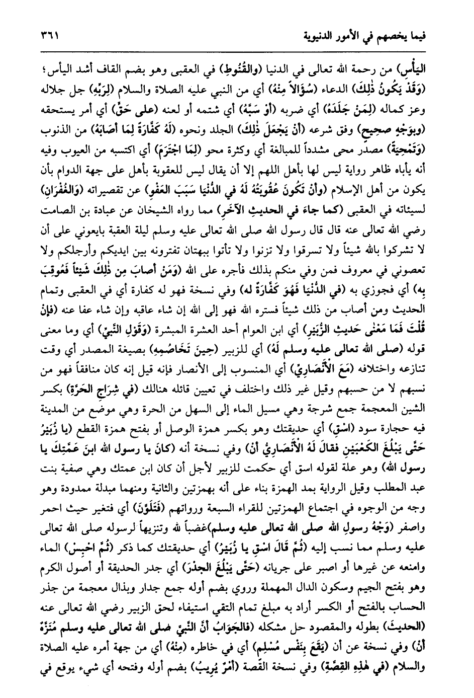 اليأس) من رحمة الله تعالى في الدنيا (والقنوط) في العقبى وهو بضم القاف أشد اليأس؛ (وقد يكون ذلك) الدعاء (سؤالا منه) أي من النبي عليه الصلاة والسلام (لربّه) جل جلاله وعز كماله (لمن جلده) أي ضربه (أو سبّه) أي شتمه أو لعنه (على حقّ) أي أمر يستحقه (وبوجه صحيح) وفق شرعه (أن يجعل ذلك) الجلد ونحوه (له كفّارة لما أصابه) من الذنوب (وتمحية) مصدر محى مشددا للمبالغة أي وكثرة محو (لما اجترم) أي اكتسبه من العيوب وفيه أنه يأباه ظاهر رواية ليس لها بأهل اللهم إلا أن يقال ليس للعقوبة بأهل على جهة الدوام بأن يكون من أهل الإسلام (وَأَنْ تَكُونَ عُقُوبَتُهُ لَهُ فِي الدُّنْيَا سَبَبَ العفو) عن تقصيراته (والغفران) لسيئاته في العقبى (كما جاء في الحديث الآخر) مما رواه الشيخان عن عبادة بن الصامت رضي الله تعالى عَنْهُ قَالَ قَالَ رَسُولُ اللَّهِ صَلَّى اللَّهُ تعالى عليه وسلم ليلة العقبة بايعوني على أن لا تشركوا بالله شيئا ولا تسرقوا ولا تزنوا ولا تأتوا ببهتان تفترونه بين ايديكم وأرجلكم ولا تعصوني في معروف فمن وفي منكم بذلك فأجره على الله (وَمَنْ أَصَابَ مِنْ ذَلِكَ شَيْئًا فَعُوقِبَ بِهِ) أي فجوزي به (في الدّنيا فهو كفّارة له) وفي نسخة فهو له كفارة أي في العقبى وتمام الحديث ومن أصاب من ذلك شيئا فستره الله فهو إلى الله إن شاء عاقبه وإن شاء عفا عنه (فإن قلت فما معنى حديث الزّبير) أي ابن العوام أحد العشرة المبشرة (وقول النّبيّ) أي وما معنى قوله (صلى الله تعالى عليه وسلم له) أي للزبير (حين تخاصمه) بصيغة المصدر أي وقت تنازعه واختلافه (مع الأنصاريّ) أي المنسوب إلى الأنصار فإنه قيل إنه كان منافقا فهو من نسبهم لا من حسبهم وقيل غير ذلك واختلف في تعيين قائله هنالك (في شراج الحرّة) بكسر الشين المعجمة جمع شرجة وهي مسيل الماء إلى السهل من الحرة وهي موضع من المدينة فيه حجارة سود (اسق) أي حديقتك وهو بكسر همزة الوصل أو بفتح همزة القطع (يَا زُبَيْرُ حَتَّى يَبْلُغَ الْكَعْبَيْنِ فَقَالَ لَهُ الأنصاريّ أن) وفي نسخة أنه (كان يا رسول الله ابن عمّتك يا رسول الله) وهو علة لقوله اسق أي حكمت للزبير لأجل أن كان ابن عمتك وهي صفية بنت عبد المطلب وقيل الرواية بمد الهمزة بناء على أنه بهمزتين والثانية ومنهما مبدلة ممدودة وهو وجه من الوجوه في اجتماع الهمزتين للقراء السبعة ورواتهم (فتلوّن) أي فتغير حيث احمر واصفر (وجه رسول الله صلى الله تعالى عليه وسلم) غضبا لله وتنزيها لرسوله صلى الله تعالى عليه وسلم مما نسب إليه (ثمّ قال اسق يا زبير) أي حديقتك كما ذكر (ثمّ احبس) الماء وامنعه عن غيرها أو اصبر على جريانه (حتّى يبلغ الجدر) أي جدر الحديقة أو أصول الكرم وهو بفتح الجيم وسكون الدال المهملة وروي بضم أوله جمع جدار وبذال معجمة من جذر الحساب بالفتح أو الكسر أراد به مبلغ تمام التقي استيفاء لحق الزبير رضي الله تعالى عنه (الحديث) بطوله والمقصود حل مشكله (فالجواب أنّ النّبيّ صلى الله تعالى عليه وسلم منزّه أن) وفي نسخة عن أن (يقع بنفس مسلم) أي في خاطره (منه) أي من جهة أمره عليه الصلاة والسلام (في هذه القصّة) وفي نسخة القصة (أمر يريب) بضم أوله وفتحه أي شيء يوقع في