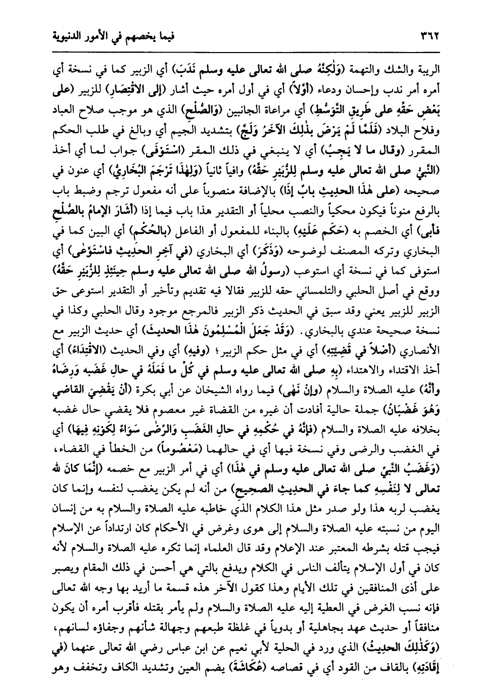 الريبة والشك والتهمة (ولكنّه صلى الله تعالى عليه وسلم ندب) أي الزبير كما في نسخة أي أمره أمر ندب وإحسان ودعاء (أوّلا) أي في أول أمره حيث أشار (إلى الاقتصار) للزبير (على بعض حقّه على طريق التّوسّط) أي مراعاة الجانبين (والصّلح) الذي هو موجب صلاح العباد وفلاح البلاد (فلمّا لم يرض بذلك الآخر ولجّ) بتشديد الجيم أي وبالغ في طلب الحكم المقرر (وقال ما لا يجب) أي لا ينبغي في ذلك المقر (استوفى) جواب لما أي أخذ (النّبيّ صلى الله تعالى عليه وسلم للزّبير حقّه) وافيا ثانيا (ولهذا ترجم البخاريّ) أي عنون في صحيحه (على هذا الحديث باب إذا) بالإضافة منصوبا على أنه مفعول ترجم وضبط باب بالرفع منونا فيكون محكيا والنصب محليا أو التقدير هذا باب فيما إذا (أشار الإمام بالصّلح فأبى) أي الخصم به (حكم عليه) بالبناء للمفعول أو الفاعل (بالحكم) أي البين كما في البخاري وتركه المصنف لوضوحه (وذكر) أي البخاري (في آخر الحديث فاستوّعى) أي استوفى كما في نسخة أي استوعب (رسول الله صلى الله تعالى عليه وسلم حينئذ للزّبير حقّه) ووقع في أصل الحلبي والتلمساني حقه للزبير فقالا فيه تقديم وتأخير أو التقدير استوعى حق الزبير للزبير يعني وقد سبق في الحديث ذكر الزبير فالمرجع موجود وقال الحلبي وكذا في نسخة صحيحة عندي بالبخاري. (وقد جعل المسلمون هذا الحديث) أي حديث الزبير مع الأنصاري (أصلا في قضيّته) أي في مثل حكم الزبير؛ (وفيه) أي وفي الحديث (الاقتداء) أي أخذ الاقتداء والاهتداء (به صلى الله تعالى عَلَيْهِ وَسَلَّمَ فِي كُلِّ مَا فَعَلَهُ فِي حال غضبه ورضاه وأنّه) عليه الصلاة والسلام (وإن نهى) فيما رواه الشيخان عن أبي بكرة (أن يقضي القاضي وهو غضبان) جملة حالية أفادت أن غيره من القضاة غير معصوم فلا يقضي حال غضبه بخلافه عليه الصلاة والسلام (فَإِنَّهُ فِي حُكْمِهِ فِي حَالِ الْغَضَبِ وَالرِّضَى سواء لكونه فيها) أي في الغضب والرضى وفي نسخة فيها أي في حالهما (معصوما) من الخطأ في القضاء، (وغضب النّبيّ صلى الله تعالى عليه وسلم في هذا) أي في أمر الزبير مع خصمه (إِنَّمَا كَانَ لِلَّهِ تَعَالَى لَا لِنَفْسِهِ كَمَا جاء في الحديث الصحيح) من أنه لم يكن يغضب لنفسه وإنما كان يغضب لربه هذا ولو صدر مثل هذا الكلام الذي خاطبه عليه الصلاة والسلام به من إنسان اليوم من نسبته عليه الصلاة والسلام إلى هوى وغرض في الأحكام كان ارتدادا عن الإسلام فيجب قتله بشرطه المعتبر عند الإعلام وقد قال العلماء إنما تكره عليه الصلاة والسلام لأنه كان في أول الإسلام يتألف الناس في الكلام ويدفع بالتي هي أحسن في ذلك المقام ويصبر على أذى المنافقين في تلك الأيام وهذا كقول الآخر هذه قسمة ما أريد بها وجه الله تعالى فإنه نسب الغرض في العطية إليه عليه الصلاة والسلام ولم يأمر بقتله فأقرب أمره أن يكون منافقا أو حديث عهد بجاهلية أو بدويا في غلظة طبعهم وجهالة شأنهم وجفاؤه لسانهم، (وكذلك الحديث) الذي ورد في الحلية لأبي نعيم عن ابن عباس رضي الله تعالى عنهما (في إقادته) بالقاف من القود أي في قصاصه (عكاشة) يضم العين وتشديد الكاف وتخفف وهو