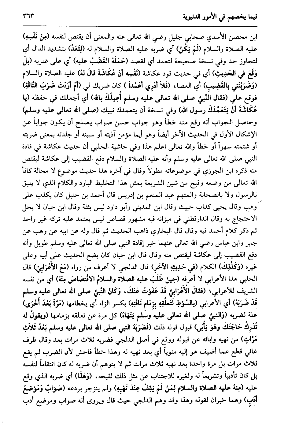 ابن محصن الأسدي صحابي جليل رضي الله تعالى عنه والمعنى أن يقتص لنفسه (من نفسه) عليه الصلاة والسلام (لم يكن) أي ضربه عليه الصلاة والسلام له (لتعدّ) بتشديد الدال أي لتجاوز حد وفي نسخة صحيحة لتعمد أي لقصد (حمله الغضب عليه) أي على ضربه (بل وقع في الحديث) أي في حديث قود عكاشة (نفسه أن عكاشة قال له) عليه الصلاة والسلام (وضربتني بالقضيب) أي العصا، (فلا أدري أعمدا) كان ضربك لي (أم أردت ضرب النّاقة) فوقع علي (فقال النّبيّ صلى الله تعالى عليه وسلم أعيذك بالله) أي أجعلك في حفظه (يا عكاشة أن يتعمّدك رسول الله) وفي نسخة أن يتعمدك نبيك (صلى الله تعالى عليه وسلم) وحاصل الجواب أنه وقع منه خطأ وهو جواب حسن صواب يصلح أن يكون جوابا عن الإشكال الأول في الحديث الآخر أيضا وهو أيما مؤمن آذيته أو سببته أو جلدته بمعنى ضربته أو شتمته سهوا أو خطأ والله تعالى اعلم هذا وفي حاشية الحلبي أن حديث عكاشة في قادة النبي صلى الله تعالى عليه وسلم وأنه عليه الصلاة والسلام دفع القضيب إلى عكاشة ليقتص منه ذكره ابن الجوزي في موضوعاته مطولا وقال في آخره هذا حديث موضوع لا محالة كافأ الله تعالى من وضعه وقبح من شين الشريعة بمثل هذا التخليط البارد والكلام الذي لا يليق بالرسول ولا بالصحابة والمتهم عبد المنعم بن إدريس قال أحمد بن حنبل كان يكذب على وهب وقال يحيى كذاب خبيث وقال ابن المديني وأبو داود ليس بثقة وقال ابن حبان لا يحل الاحتجاج به وقال الدارقطني في ميزانه فيه مشهور قصاص ليس يعتمد عليه تركه غير واحد ثم ذكر كلام أحمد فيه وقال قال البخاري ذاهب الحديث ثم قال وله عن ابيه عن وهب عن جابر وابن عباس رضي الله تعالى عنهما خبر إقادة النبي صلى الله تعالى عليه وسلم طويل وأنه دفع القضيب إلى عكاشة ليقتص منه وقال قال ابن حبان كان يضع الحديث على أبيه وعلى غيره (وكذلك) الكلام (في حديثه الآخر) قال الدلجي لا أعرف من رواه (مع الأعرابيّ) قال الحلبي هذا الأعرابي لا أعرفه (حين طلب عليه الصلاة والسلام الاقتصاص منه) أي من نفسه الشريف للأعرابي؛ (فَقَالَ الْأَعْرَابِيُّ قَدْ عَفَوْتُ عَنْكَ، وَكَانَ النَّبِيُّ صلى الله تعالى عليه وسلم قد ضربه) أي الأعرابي (بالسّوط لتعلّقه بزمام ناقته) بكسر الزاء أي يخطامها (مرّة بعد أخرى) علة لضربه (والنبيّ صلى الله تعالى عليه وسلم ينهاه) كل مرة عن تعلقه بزمامها (ويقول له تدرك حاجتك وهو يأبى) قبول قوله ذلك (فضربه النبي صلى الله تعالى عليه وسلم بعد ثلاث مرّات) من نهيه وابائه عن قبوله ووقع في أصل الدلجي فضربه ثلاث مرات بعد وقال ظرف غائي قطع عما أضيف هو إليه منويا أي بعد نهيه له وهذا خطأ فاحش لأن الضرب لم يقع ثلاث مرات بل مرة واحدة بعد نهيه ثلاث مرات ثم لا يتوهم أن ضربه له كان انتقاما لنفسه بل كان تأديبا وتشريعا له ولغيره للاجتناب عن مثل ذلك لقبحه، (وهذا) أي ضربه الذي وقع عليه (منه عليه الصلاة والسلام لمن لم يقف عند نهيه) ولم ينزجر بردعه (صواب وموضع أدب) وهما خبران لقوله وهذا وقد وهم الدلجي حيث قال ويروى أنه صواب وموضع أدب