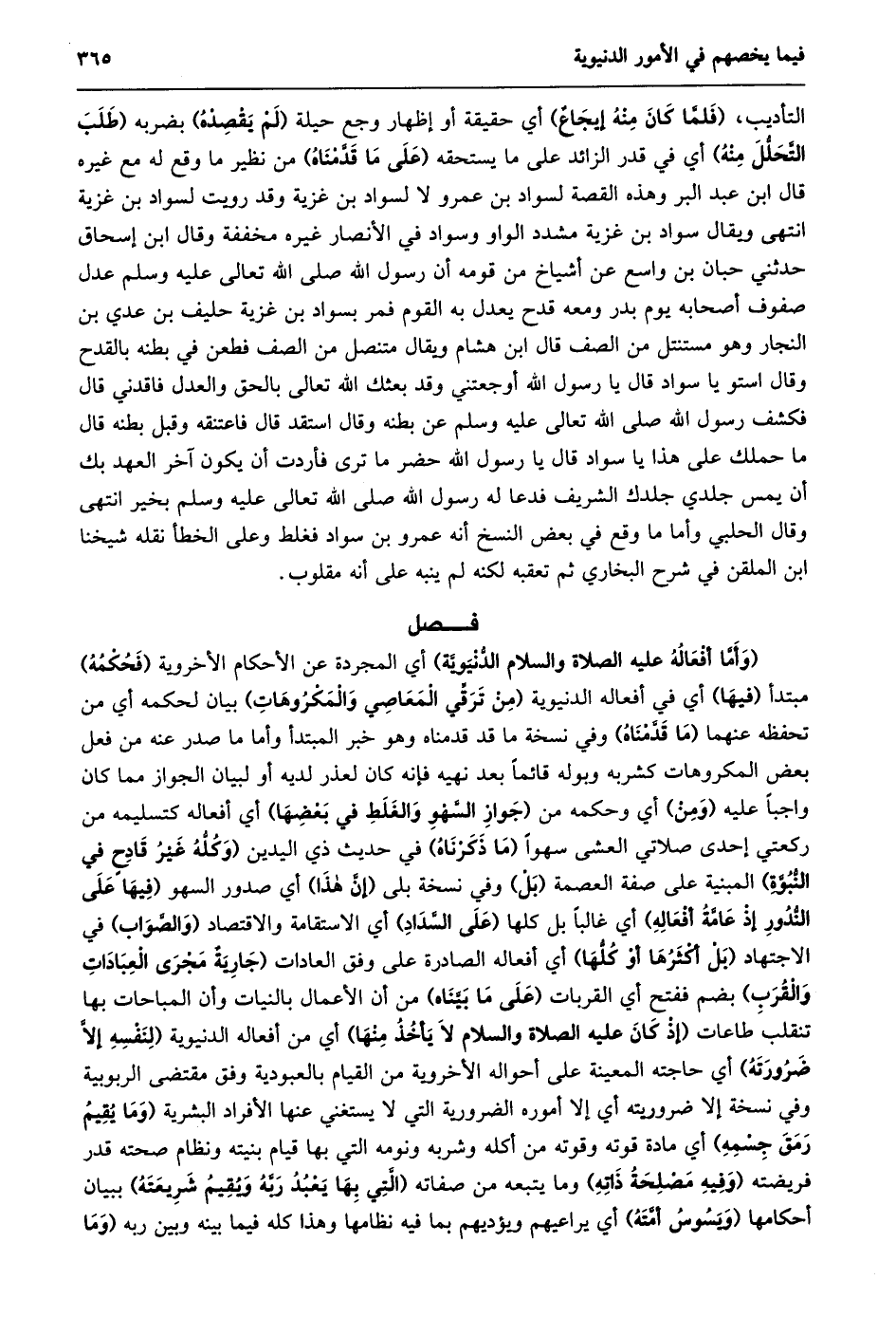 أي المجردة عن الأحكام الأخروية (فحكمه) مبتدأ (فيها) أي في أفعاله الدنيوية (من ترقّي المعاصي والمكروهات) بيان لحكمه أي من تحفظه عنهما (ما قدّمناه) وفي نسخة ما قد قدمناه وهو خبر المبتدأ وأما ما صدر عنه من فعل بعض المكروهات كشربه وبوله قائما بعد نهيه فإنه كان لعذر لديه أو لبيان الجواز مما كان واجبا عليه (ومن) أي وحكمه من (جواز السّهو والغلط في بعضها) أي أفعاله كتسليمه من ركعتي إحدى صلاتي العشى سهوا (ما ذكرناه) في حديث ذي اليدين (وكلّه غير قادح في النّبوّة) المبنية على صفة العصمة (بل) وفي نسخة بلى (إنّ هذا) أي صدور السهو (فيها على النّدور إذ عامّة أفعاله) أي غالبا بل كلها (على السّداد) أي الاستقامة والاقتصاد (والصّواب) في الاجتهاد (بل أكثرها أو كلّها) أي أفعاله الصادرة على وفق العادات (جارية مجرى العبادات والقرب) بضم ففتح أي القربات (على ما بيّناه) من أن الأعمال بالنيات وأن المباحات بها تنقلب طاعات (إذ كان عليه الصلاة والسلام لا يأخذ منها) أي من أفعاله الدنيوية (لنفسه إلّا ضرورته) أي حاجته المعينة على أحواله الأخروية من القيام بالعبودية وفق مقتضى الربوبية وفي نسخة إلا ضروريته أي إلا أموره الضرورية التي لا يستغني عنها الأفراد البشرية (وما يقيم رمق جسمه) أي مادة قوته وقوته من أكله وشربه ونومه التي بها قيام بنيته ونظام صحته قدر فريضته (وفيه مصلحة ذاته) وما يتبعه من صفاته (الّتي بها يعبد ربّه ويقيم شريعته) ببيان أحكامها (ويسوس أمّته) أي يراعيهم ويؤديهم بما فيه نظامها وهذا كله فيما بينه وبين ربه (وما