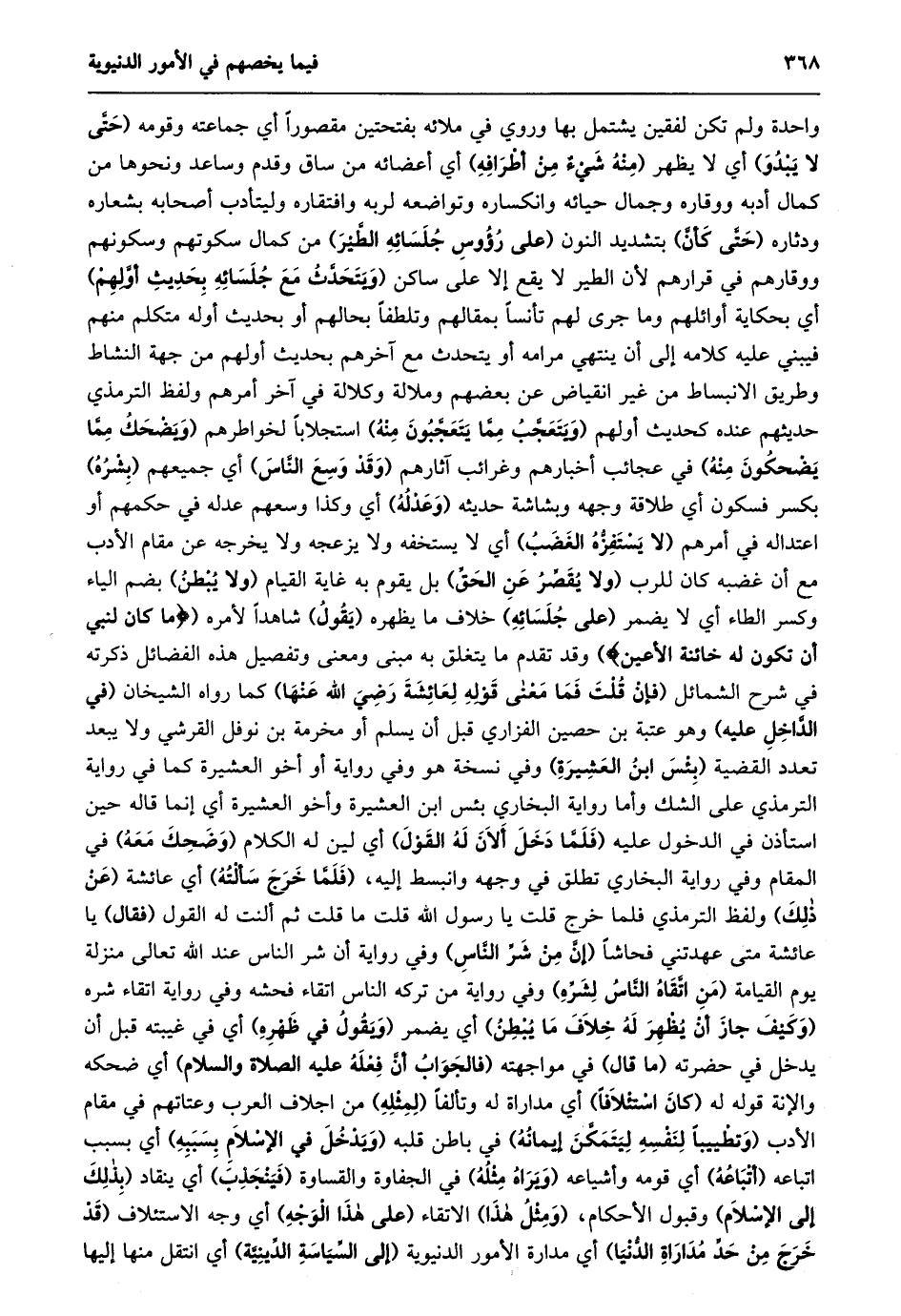 واحدة ولم تكن لفقين يشتمل بها وروي في ملائه بفتحتين مقصورا أي جماعته وقومه (حتّى لا يبدو) أي لا يظهر (منه شيء من أطرافه) أي أعضائه من ساق وقدم وساعد ونحوها من كمال أدبه ووقاره وجمال حيائه وانكساره وتواضعه لربه وافتقاره وليتأدب أصحابه بشعاره ودثاره (حتّى كأنّ) بتشديد النون (على رؤوس جلسائه الطّير) من كمال سكوتهم وسكونهم ووقارهم في قرارهم لأن الطير لا يقع إلا على ساكن (ويتحدّث مع جلسائه بحديث أوّلهم) أي بحكاية أوائلهم وما جرى لهم تأنسا بمقالهم وتلطفا بحالهم أو بحديث أوله متكلم منهم فيبني عليه كلامه إلى أن ينتهي مرامه أو يتحدث مع آخرهم بحديث أولهم من جهة النشاط وطريق الانبساط من غير انقياض عن بعضهم وملالة وكلالة في آخر أمرهم ولفظ الترمذي حديثهم عنده كحديث أولهم (ويتعجّب ممّا يتعجّبون منه) استجلابا لخواطرهم (ويضحك ممّا يضحكون منه) في عجائب أخبارهم وغرائب آثارهم (وقد وسع النّاس) أي جميعهم (بشره) بكسر فسكون أي طلاقة وجهه وبشاشة حديثه (وعدله) أي وكذا وسعهم عدله في حكمهم أو اعتداله في أمرهم (لا يستفزّه الغضب) أي لا يستخفه ولا يزعجه ولا يخرجه عن مقام الأدب مع أن غضبه كان للرب (ولا يقصّر عن الحقّ) بل يقوم به غاية القيام (ولا يبطن) بضم الياء وكسر الطاء أي لا يضمر (على جلسائه) خلاف ما يظهره (يقول) شاهدا لأمره (ما كان لنبي أن يكون له خائنة الأعين) وقد تقدم ما يتغلق به مبنى ومعنى وتفصيل هذه الفضائل ذكرته في شرح الشمائل (فَإِنْ قُلْتَ فَمَا مَعْنَى قَوْلِهِ لِعَائِشَةَ رَضِيَ الله عنها) كما رواه الشيخان (في الدّاخل عليه) وهو عتبة بن حصين الفزاري قبل أن يسلم أو مخرمة بن نوفل القرشي ولا يبعد تعدد القضية (بئس ابن العشيرة) وفي نسخة هو وفي رواية أو أخو العشيرة كما في رواية الترمذي على الشك وأما رواية البخاري بئس ابن العشيرة وأخو العشيرة أي إنما قاله حين استأذن في الدخول عليه (فلمّا دخل ألان له القول) أي لين له الكلام (وضحك معه) في المقام وفي رواية البخاري تطلق في وجهه وانبسط إليه، (فلمّا خرج سألته) أي عائشة (عن ذلك) ولفظ الترمذي فلما خرج قلت يا رسول الله قلت ما قلت ثم ألنت له القول (فقال) يا عائشة متى عهدتني فحاشا (إنّ من شرّ النّاس) وفي رواية أن شر الناس عند الله تعالى منزلة يوم القيامة (من اتّقاه النّاس لشرّه) وفي رواية من تركه الناس اتقاء فحشه وفي رواية اتقاء شره (وَكَيْفَ جَازَ أَنْ يُظْهِرَ لَهُ خِلَافَ مَا يبطن) أي يضمر (ويقول في ظهره) أي في غيبته قبل أن يدخل في حضرته (ما قال) في مواجهته (فالجواب أنّ فعله عليه الصلاة والسلام) أي ضحكه والإنة قوله له (كان استئلافا) أي مداراة له وتألفا (لمثله) من اجلاف العرب وعتاتهم في مقام الأدب (وتطييبا لنفسه ليتمكّن إيمانه) في باطن قلبه (ويدخل في الإسلام بسببه) أي بسبب اتباعه (أتباعه) أي قومه وأشياعه (ويراه مثله) في الجفاوة والقساوة (فينجذب) أي ينقاد (بذلك إلى الإسلام) وقبول الأحكام، (ومثل هذا) الاتقاء (على هذا الوجه) أي وجه الاستئلاف (قد خرج من حدّ مداراة الدّنيا) أي مدارة الأمور الدنيوية (إلى السّياسة الدّينيّة) أي انتقل منها إليها