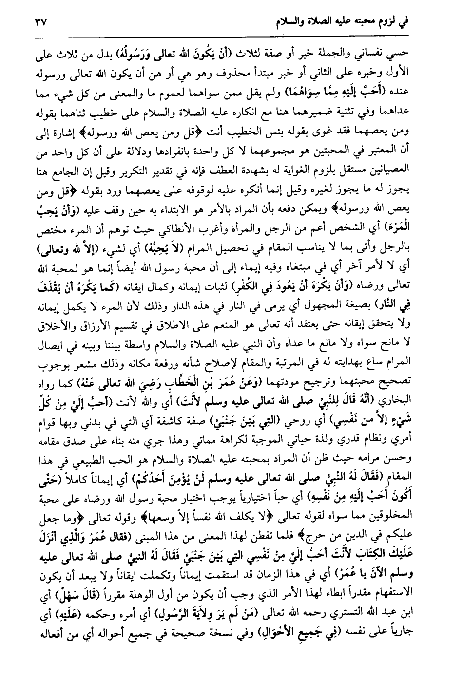 حسي نفساني والجملة خبر أو صفة لثلاث (أن يكون الله تعالى ورسوله) بدل من ثلاث على الأول وخبره على الثاني أو خبر مبتدأ محذوف وهو هي أو هن أن يكون الله تعالى ورسوله عنده (أحبّ إليه ممّا سواهما) ولم يقل ممن سواهما لعموم ما والمعنى من كل شيء مما عداهما وفي تثنية ضميرهما هنا مع انكاره عليه الصلاة والسلام على خطيب ثناهما بقوله ومن يعصهما فقد غوى بقوله بئس الخطيب أنت قل وَمَنْ يَعْصِ اللَّهَ وَرَسُولَهُ إشارة إلى أن المعتبر في المحبتين هو مجموعهما لا كل واحدة بانفرادها ودلالة على أن كل واحد من العصيانين مستقل بلزوم الغواية له بشهادة العطف فإنه في تقدير التكرير وقيل إن الجامع هنا يجوز له ما يجوز لغيره وقيل إنما أنكره عليه لوقوفه على يعصهما ورد بقوله قل وَمَنْ يَعْصِ اللَّهَ وَرَسُولَهُ ويمكن دفعه بأن المراد بالأمر هو الابتداء به حين وقف عليه (وأن يحبّ المرء) أي الشخص أعم من الرجل والمرأة وأغرب الأنطاكي حيث توهم أن المرء مختص بالرجل وأتى بما لا يناسب المقام في تحصيل المرام (لا يحبّه) أي لشيء (إلّا لله وتعالى) أي لا لأمر آخر أي في مبتغاه وفيه إيماء إلى أن محبة رسول الله أيضا إنما هو لمحبة الله تعالى ورضاه (وأن يكره أن يعود في الكفر) لثبات إيمانه وكمال ايقانه (كما يكره أن يقذف في النّار) بصيغة المجهول أي يرمى في النار في هذه الدار وذلك لأن المرء لا يكمل إيمانه ولا يتحقق إيقانه حتى يعتقد أنه تعالى هو المنعم على الاطلاق في تقسيم الأرزاق والأخلاق لا مانح سواه ولا مانع ما عداه وأن النبي عليه الصلاة والسلام واسطة بيننا وبينه في ايصال المرام ساع بهدايته له في المرتبة والمقام لإصلاح شأنه ورفعة مكانه وذلك مشعر بوجوب تصحيح محبتهما وترجيح مودتهما (وعن عمر بن الخطّاب رضي الله تعالى عنه) كما رواه البخاري (أنّه قال للنّبيّ صلى الله تعالى عليه وسلم لأنت) أي والله لَأَنْتَ (أَحَبُّ إِلَيَّ مِنْ كُلِّ شَيْءٍ إِلَّا من نفسي) أي روحي (التي بين جنبيّ) صفة كاشفة أي التي في بدني وبها قوام أمري ونظام قدري ولذة حياتي الموجبة لكراهة مماتي وهذا جري منه بناء على صدق مقامه وحسن مرامه حيث ظن أن المراد بمحبته عليه الصلاة والسلام هو الحب الطبيعي في هذا المقام (فقال له النّبيّ صلى الله تعالى عليه وسلم لن يؤمن أحدكم) أي إيمانا كاملا (حتّى أكون أحبّ إليه من نفسه) أي حبا اختياريا يوجب اختيار محبة رسول الله ورضاه على محبة المخلوقين مما سواه لقوله تعالى لا يُكَلِّفُ اللَّهُ نَفْساً إِلَّا وُسْعَها وقوله تعالى وَما جَعَلَ عَلَيْكُمْ فِي الدِّينِ مِنْ حَرَجٍ فلما تفطن لهذا المعنى من هذا المبنى (فَقَالَ عُمَرُ وَالَّذِي أَنْزَلَ عَلَيْكَ الْكِتَابَ لَأَنْتَ أَحَبُّ إِلَيَّ مِنْ نَفْسِي الَّتِي بَيْنَ جَنْبَيَّ فقال له النبيّ صلى الله تعالى عليه وسلم الآن يا عمر) أي في هذا الزمان قد استقمت إيمانا وتكملت ايقانا ولا يبعد أن يكون الاستفهام مقدرا ابطاء لهذا الأمر الذي وجب أن يكون من أول الوهلة مقررا (قال سهل) أي ابن عبد الله التستري رحمه الله تعالى (من لم ير ولاية الرّسول) أي أمره وحكمه (عليه) أي جاريا على نفسه (في جميع الأحوال) وفي نسخة صحيحة في جميع أحواله أي من أفعاله