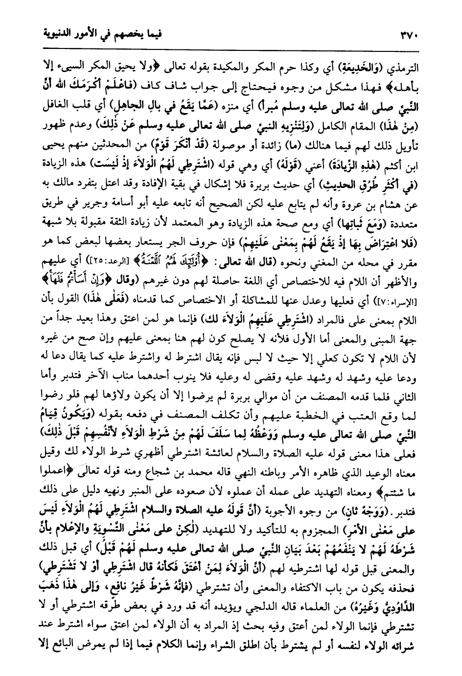 الترمذي (والخديعة) أي وكذا حرم المكر والمكيدة بقوله تعالى وَلا يَحِيقُ الْمَكْرُ السَّيِّئُ إِلَّا بِأَهْلِهِ فهذا مشكل من وجوه فيحتاج إلى جواب شاف كاف (فَاعْلَمْ أَكْرَمَكَ اللَّهُ أَنَّ النَّبِيَّ صَلَّى اللَّهُ تعالى عليه وسلم مبرأ) أي منزه (عمّا يقع في بال الجاهل) أي قلب الغافل (من هذا) المقام الكامل (ولتنزيه النبيّ صلى الله تعالى عليه وسلم عن ذلك) وعدم ظهور تأويل ذلك لهم فيما هنالك (ما) زائدة أو موصولة (قد أنكر قوم) من المحدثين منهم يحيى ابن أكثم (هذه الزّيادة) أعني (قوله) أي وهي قوله (اشترطي لهم الولاء إذ ليست) هذه الزيادة (في أكثر طرق الحديث) أي حديث بريرة فلا إشكال في بقية الإفادة وقد اعتل بتفرد مالك به عن هشام بن عروة وأنه لم يتابع عليه لكن الصحيح أنه تابعه عليه أبو أسامة وجرير في طريق متعددة (ومع ثباتها) أي ومع صحة هذه الزيادة وهو المعتمد لأن زيادة الثقة مقبولة بلا شبهة (فَلَا اعْتِرَاضَ بِهَا إِذْ يَقَعُ لَهُمْ بِمَعْنَى عليهم) فإن حروف الجر يستعار بعضها لبعض كما هو مقرر في محله من المغني ونحوه (قَالَ اللَّهُ تَعَالَى: أُولئِكَ لَهُمُ اللَّعْنَةُ [الرَّعْدِ: 25] ) أي عليهم والأظهر أن اللام فيه للاختصاص أي اللغة حاصلة لهم دون غيرهم (وقال وَإِنْ أَسَأْتُمْ فَلَها [الإسراء: 7] ) أي فعليها وعدل عنها للمشاكلة أو الاختصاص كما قدمناه (فعلى هذا) القول بأن اللام بمعنى على فالمراد (اشترطي عليهم الولاء لك) فإنما هو لمن اعتق وهذا بعيد جدا من جهة المبنى والمعنى أما الأول فلأنه لا يصلح كون لهم هنا بمعنى عليهم وإن صح من غيره لأن اللام لا تكون كعلي إلا حيث لا لبس فإنه يقال اشترط له واشترط عليه كما يقال دعا له ودعا عليه وشهد له وشهد عليه وقضى له وعليه فلا ينوب أحدهما مناب الآخر فتدبر وأما الثاني فلما قدمه المصنف من أن موالي بربرة لم يرضوا إلا أن يكون ولاؤها لهم فلو رضوا لما وقع العتب في الخطبة عليهم وأن تكلف المصنف في دفعه بقوله (ويكون قيام النّبيّ صلى الله تعالى عليه وسلم ووعظه لما سلف لهم من شرط الولاء لأنفسهم قبل ذلك) فعلى هذا معنى قوله عليه الصلاة والسلام لعائشة اشترطي أظهري شرط الولاء لك وقيل معناه الوعيد الذي ظاهره الأمر وباطنه النهي قاله محمد بن شجاع ومنه قوله تعالى اعْمَلُوا ما شِئْتُمْ ومعناه التهديد على عمله أن عملوه لأن صعوده على المنبر ونهيه دليل على ذلك فتدبر. (ووجه ثان) من وجوه الأجوبة (أنّ قوله عليه الصلاة والسلام اشْتَرِطِي لَهُمُ الْوَلَاءَ لَيْسَ عَلَى مَعْنَى الْأَمْرِ) المجزوم به للتأكيد ولا للتهديد (لَكِنْ عَلَى مَعْنَى التَّسْوِيَةِ وَالْإِعْلَامُ بِأَنَّ شَرْطَهُ لَهُمْ لَا يَنْفَعُهُمْ بَعْدَ بَيَانِ النَّبِيِّ صَلَّى الله تعالى عليه وسلم لهم قبل) أي قبل ذلك والمعنى قبل قوله لها اشترطيه لهم (أَنَّ الْوَلَاءَ لِمَنْ أَعْتَقَ فَكَأَنَّهُ قَالَ اشْتَرِطِي أو لا تشترطي) فحذفه يكون من باب الاكتفاء والمعنى وأن تَشْتَرِطِي (فَإِنَّهُ شَرْطٌ غَيْرُ نَافِعٍ، وَإِلَى هَذَا ذهب الدّاوديّ وغيره) من العلماء قاله الدلجي ويؤيده أنه قد ورد في بعض طرقه اشترطي أو لا تشترطي فإنما الولاء لمن أعتق وفيه بحث إذ المراد به أن الولاء لمن اعتق سواء اشترط عند شرائه الولاء لنفسه أو لم يشترط بأن اطلق الشراء وإنما الكلام فيما إذا لم يمرض البائع إلا