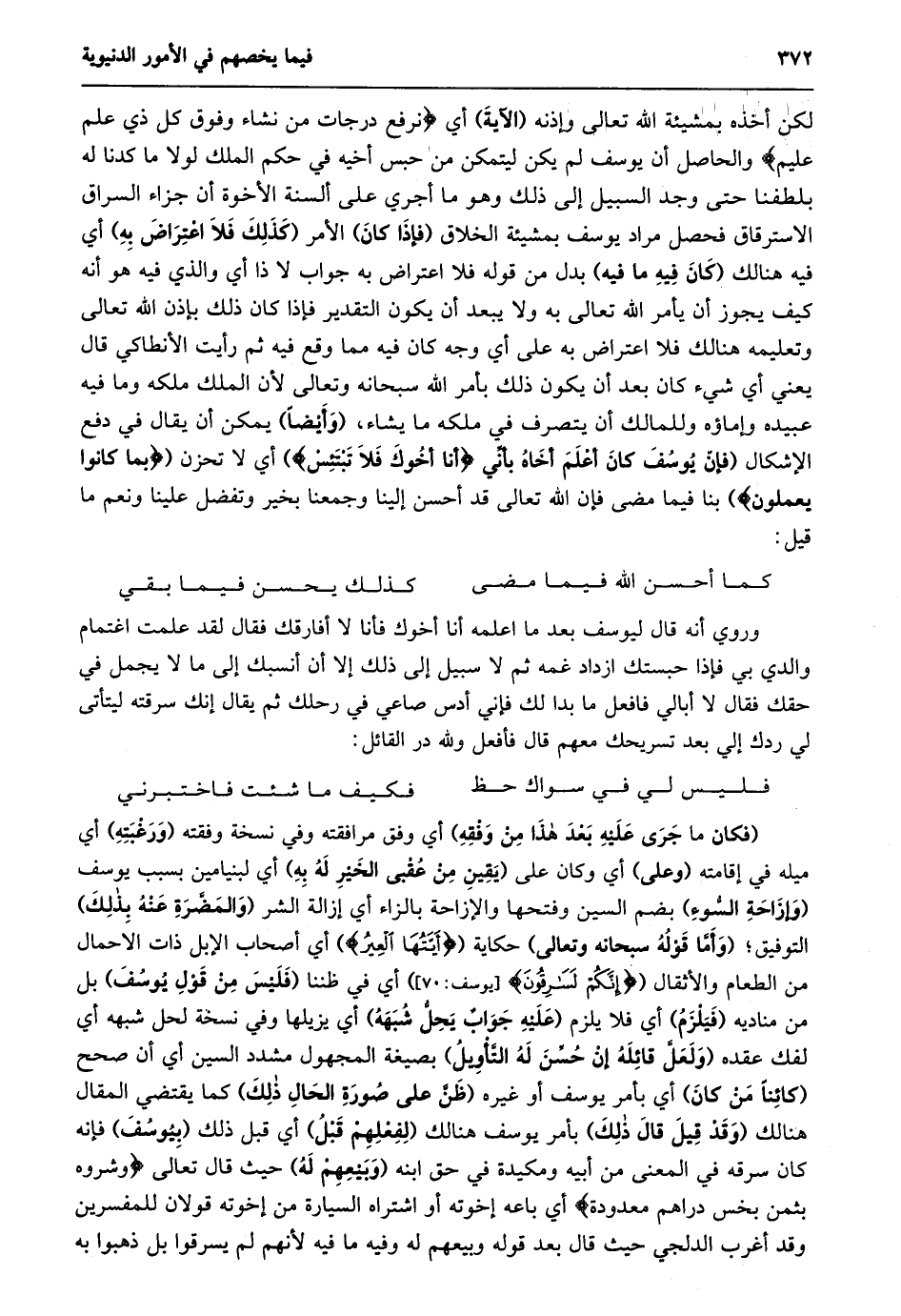 لكن أخذه بمشيئة الله تعالى وإذنه (الآية) أي نَرْفَعُ دَرَجاتٍ مَنْ نَشاءُ وَفَوْقَ كُلِّ ذِي عِلْمٍ عَلِيمٌ والحاصل أن يوسف لم يكن ليتمكن من حبس أخيه في حكم الملك لولا ما كدنا له بلطفنا حتى وجد السبيل إلى ذلك وهو ما أجري على ألسنة الأخوة أن جزاء السراق الاسترقاق فحصل مراد يوسف بمشيئة الخلاق (فإذا كان) الأمر (كذلك فلا اعتراض به) أي فيه هنالك (كان فيه ما فيه) بدل من قوله فلا اعتراض به جواب لا ذا أي والذي فيه هو أنه كيف يجوز أن يأمر الله تعالى به ولا يبعد أن يكون التقدير فإذا كان ذلك بإذن الله تعالى وتعليمه هنالك فلا اعتراض به على أي وجه كان فيه مما وقع فيه ثم رأيت الأنطاكي قال يعني أي شيء كان بعد أن يكون ذلك بأمر الله سبحانه وتعالى لأن الملك ملكه وما فيه عبيده وإماؤه وللمالك أن يتصرف في ملكه ما يشاء، (وأيضا) يمكن أن يقال في دفع الإشكال (فَإِنَّ يُوسُفَ كَانَ أَعْلَمَ أَخَاهُ بِأَنِّي أَنَا أَخُوكَ فَلا تَبْتَئِسْ) أي لا تحزن (بِما كانُوا يَعْمَلُونَ) بنا فيما مضى فإن الله تعالى قد أحسن إلينا وجمعنا بخير وتفضل علينا ونعم ما قيل: