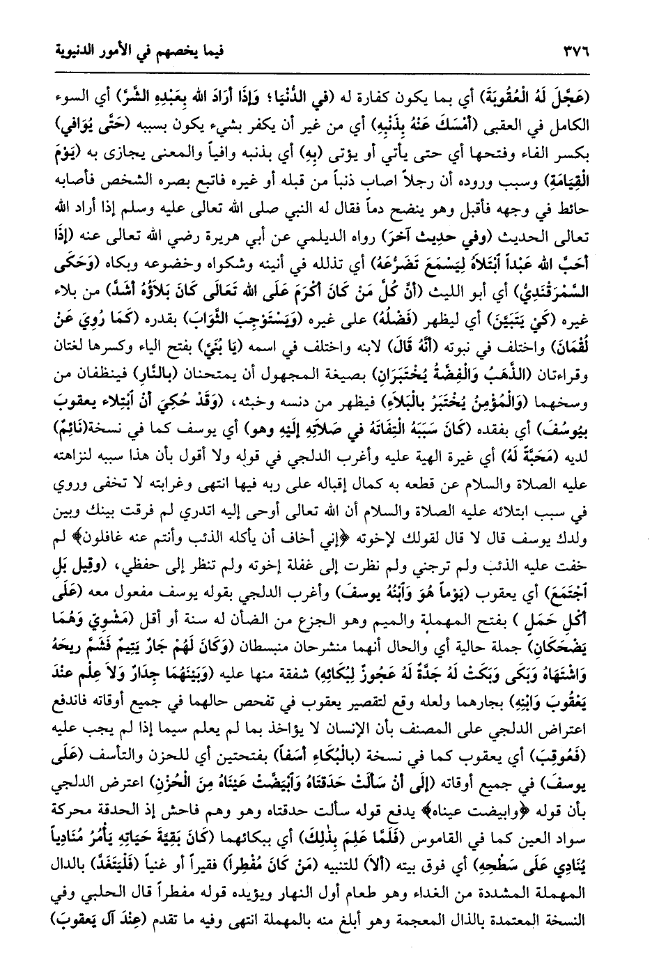 (عجّل له العقوبة) أي بما يكون كفارة له (فِي الدُّنْيَا؛ وَإِذَا أَرَادَ اللَّهُ بِعَبْدِهِ الشَّرَّ) أي السوء الكامل في العقبى (أمسك عنه بذنبه) أي من غير أن يكفر بشيء يكون بسببه (حتّى يوافي) بكسر الفاء وفتحها أي حتى يأتي أو يؤتى (به) أي بذنبه وافيا والمعنى يجازى به (يوم القيامة) وسبب وروده أن رجلا اصاب ذنبا من قبله أو غيره فاتبع بصره الشخص فأصابه حائط في وجهه فأقبل وهو ينضح دما فقال له النبي صلى الله تعالى عليه وسلم إذا أراد الله تعالى الحديث (وفي حديث آخر) رواه الديلمي عن أبي هريرة رضي الله تعالى عنه (إِذَا أَحَبَّ اللَّهُ عَبْدًا ابْتَلَاهُ لِيَسْمَعَ تَضَرُّعَهُ) أي تذلله في أنينه وشكواه وخضوعه وبكاه (وحكى السّمرقنديّ) أي أبو الليث (أَنَّ كُلَّ مَنْ كَانَ أَكْرَمَ عَلَى اللَّهِ تعالى كان بلاؤه أشدّ) من بلاء غيره (كي يتبيّن) أي ليظهر (فضله) على غيره (ويستوجب الثّواب) بقدره (كما روي عن لقمان) واختلف في نبوته (أنّه قال) لابنه واختلف في اسمه (يا بنيّ) بفتح الياء وكسرها لغتان وقراءتان (الذّهب والفضّة يختبران) بصيغة المجهول أن يمتحنان (بالنّار) فينظفان من وسخهما (والمؤمن يختبر بالبلاء) فيظهر من دنسه وخبثه، (وقد حكي أن ابتلاء يعقوب بيوسف) أي بفقده (كان سببه التفاته في صلاته إليه وهو) أي يوسف كما في نسخة (نائم) لديه (محبّة له) أي غيرة الهية عليه وأغرب الدلجي في قوله ولا أقول بأن هذا سببه لنزاهته عليه الصلاة والسلام عن قطعه به كمال إقباله على ربه فيها انتهى وغرابته لا تخفى وروي في سبب ابتلائه عليه الصلاة والسلام أن الله تعالى أوحى إليه اتدري لم فرقت بينك وبين ولدك يوسف قال لا قال لقولك لإخوته أَخافُ أَنْ يَأْكُلَهُ الذِّئْبُ وَأَنْتُمْ عَنْهُ غافِلُونَ لم خفت عليه الذئب ولم ترجني ولم نظرت إلى غفلة إخوته ولم تنظر إلى حفظي، (وقيل بل اجتمع) أي يعقوب (يوما هو وابنه يوسف) وأغرب الدلجي بقوله يوسف مفعول معه (على أكل حمل) بفتح المهملة والميم وهو الجزع من الضأن له سنة أو أقل (مشويّ وهما يضحكان) جملة حالية أي والحال أنهما منشرحان منبسطان (وَكَانَ لَهُمْ جَارٌ يَتِيمٌ فَشَمَّ رِيحَهُ وَاشْتَهَاهُ وَبَكَى وَبَكَتْ لَهُ جَدَّةٌ لَهُ عَجُوزٌ لِبُكَائِهِ) شفقة منها عليه (وَبَيْنَهُمَا جِدَارٌ وَلَا عِلْمَ عِنْدَ يَعْقُوبَ وَابْنِهِ) بجارهما ولعله وقع لتقصير يعقوب في تفحص حالهما في جميع أوقاته فاندفع اعتراض الدلجي على المصنف بأن الإنسان لا يؤاخذ بما لم يعلم سيما إذا لم يجب عليه (فعوقب) أي يعقوب كما في نسخة (بالبكاء أسفا) بفتحتين أي للحزن والتأسف (على يوسف) في جميع أوقاته (إِلَى أَنْ سَالَتْ حَدَقَتَاهُ وَابْيَضَّتْ عَيْنَاهُ مِنَ الحزن) اعترض الدلجي بأن قوله وَابْيَضَّتْ عَيْناهُ يدفع قوله سألت حدقتاه وهو وهم فاحش إذ الحدقة محركة سواد العين كما في القاموس (فلمّا علم بذلك) أي ببكائهما (كَانَ بَقِيَّةَ حَيَاتِهِ يَأْمُرُ مُنَادِيًا يُنَادِي عَلَى سطحه) أي فوق بيته (ألا) للتنبيه (من كان مفطرا) فقيرا أو غنيا (فليتغدّ) بالدال المهملة المشددة من الغداء وهو طعام أول النهار ويؤيده قوله مفطرا قال الحلبي وفي النسخة المعتمدة بالذال المعجمة وهو أبلغ منه بالمهملة انتهى وفيه ما تقدم (عند آل يعقوب)