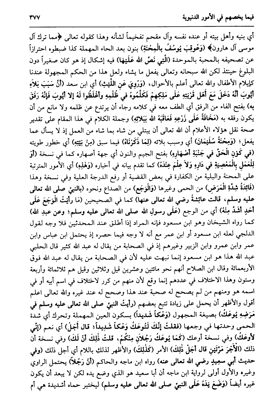أي بنيه وأهل بيته أو عنده نفسه وآل مقحم تفخيما لشأنه وهذا كقوله تعالى مِمَّا تَرَكَ آلُ مُوسى وَآلُ هارُونَ (وعوقب يوسف بالمحنة) بنون بعد الحاء المهملة كذا ضبطوه احترازا عن تصحيفه بالمحبة بالموحدة (الّتي نصّ الله عليها) فيه إشكال إذ هو كان صغيرا دون البلوغ حينئذ لكن الله سبحانه وتعالى يفعل ما يشاء ولعل هذا من الحكم المجهولة عندنا كإيلام الأطفال والله تعالى أعلم بالأحوال، (وروي عن اللّيث) أي ابن سعد (أَنَّ سَبَبَ بَلَاءِ أَيُّوبَ أَنَّهُ دَخَلَ مَعَ أَهْلِ قَرْيَتِهِ عَلَى مَلِكِهِمْ فَكَلَّمُوهُ فِي ظُلْمِهِ وَأَغْلَظُوا لَهُ إِلَّا أَيُّوبَ فَإِنَّهُ رَفَقَ بِهِ) بفتح الفاء من الرفق أي الطف معه في كلامه رجاء أن يرتدع عن ظلمه ولا مانع من أن يكون رفقه بِهِ (مَخَافَةً عَلَى زَرْعِهِ فَعَاقَبَهُ اللَّهُ بِبَلَائِهِ) وجملة الكلام في هذا المقام على تقدير صحة نقل هؤلاء الأعلام أن الله تعالى أن يبتلي من شاء بما شاء من العمل إذ لا يسأل عما يفعل؛ (ومحنة سليمان) أي وسبب بلائه (لما ذكرناه) فيما سبق (من نيّته) أي خطور طويته (في كون الحقّ في جنبة أصهاره) بفتح الجيم والنون أي جهة أصهاره كما في نسخة (أَوْ لِلْعَمَلِ بِالْمَعْصِيَةِ فِي دَارِهِ وَلَا عِلْمَ عنده) كما تقدم بيانه في أخباره (وهذه) أي الأمور المترتبة على المحنة والبلية من الكفارة في بعض القضية أو رفع الدرجة العلية وفي نسخة وهذا (فائدة شدّة المرض) من الحمى وغيرها (والوجع) من الصداع ونحوه (بالنبيّ صلى الله تعالى عليه وسلم، قالت عائشة رضي الله تعالى عنها) كما في الصحيحين (مَا رَأَيْتُ الْوَجَعَ عَلَى أَحَدٍ أَشَدَّ مِنْهُ) أي من الوجع (على رسول الله صلى الله تعالى عليه وسلم؛ وعن عبد الله) كما رواه الشيخان وهو ابن مسعود فإنه المراد إذا أطلق عند المحدثين فلا وجه لقول الدلجي لعله ابن مسعود أو ابن عمر مع أنه لا وجه فيما حصره إذ يحتمل ابن عباس وابن عمر وابن عمرو وابن الزبير وغيرهم إذ في الصحابة من يقال له عبد الله كثير قال الحلبي عبد الله هذا هو ابن مسعود إنما نبهت عليه لأن في الصحابة من يقال له عبد الله فوق الأربعمائة وقال ابن الصلاح أنهم نحو مائتين وعشرين قيل وثلاثين وقيل هم ثلاثمائة وأربعة وستون وهذا الاختلاف في عددهم إنما وقع لأن منهم من كرر لاختلاف في اسم أبيه أو في اسمه هو ومنهم من لم يصحح له صحبة عند هذا وصحح له عند غيره والله تعالى اعلم أقول والأظهر أن يحمل على زيادة تتبع بعضهم (رأيت النبيّ صلى الله تعالى عليه وسلم في مرضه يوعك) بصيغة المجهول (وعكا شديدا) بسكون العين المهملة وتحرك أي شدة الحمى وحدتها في وجعها (فقلت إنّك لتوعك وعكا شديدا؛ قال أجل) أي نعم (إنّي لأوعك) وفي نسخة أُوعَكُ (كَمَا يُوعَكُ رَجُلَانِ مِنْكُمْ، قُلْتُ ذَلِكَ أنّ لك) وفي نسخة أن ذلك (الأجر مرّتين قال أجل ذلك) الأمر (كذلك) والأظهر لذلك باللام أي أجل ذلك (وفي حديث أبي سعيد رضي الله تعالى عنه) رواه ابن ماجه والحاكم (أنّ رجلا) يحتمل الراوي وغيره والأول أولى لرواية ابن ماجه أن أبا سعيد هو الذي وضع يده لكن لا يبعد أن يكون غيره أيضا (وضع يده على النبيّ صلى الله تعالى عليه وسلم) ليختبر حماه أشديدة هي أم
