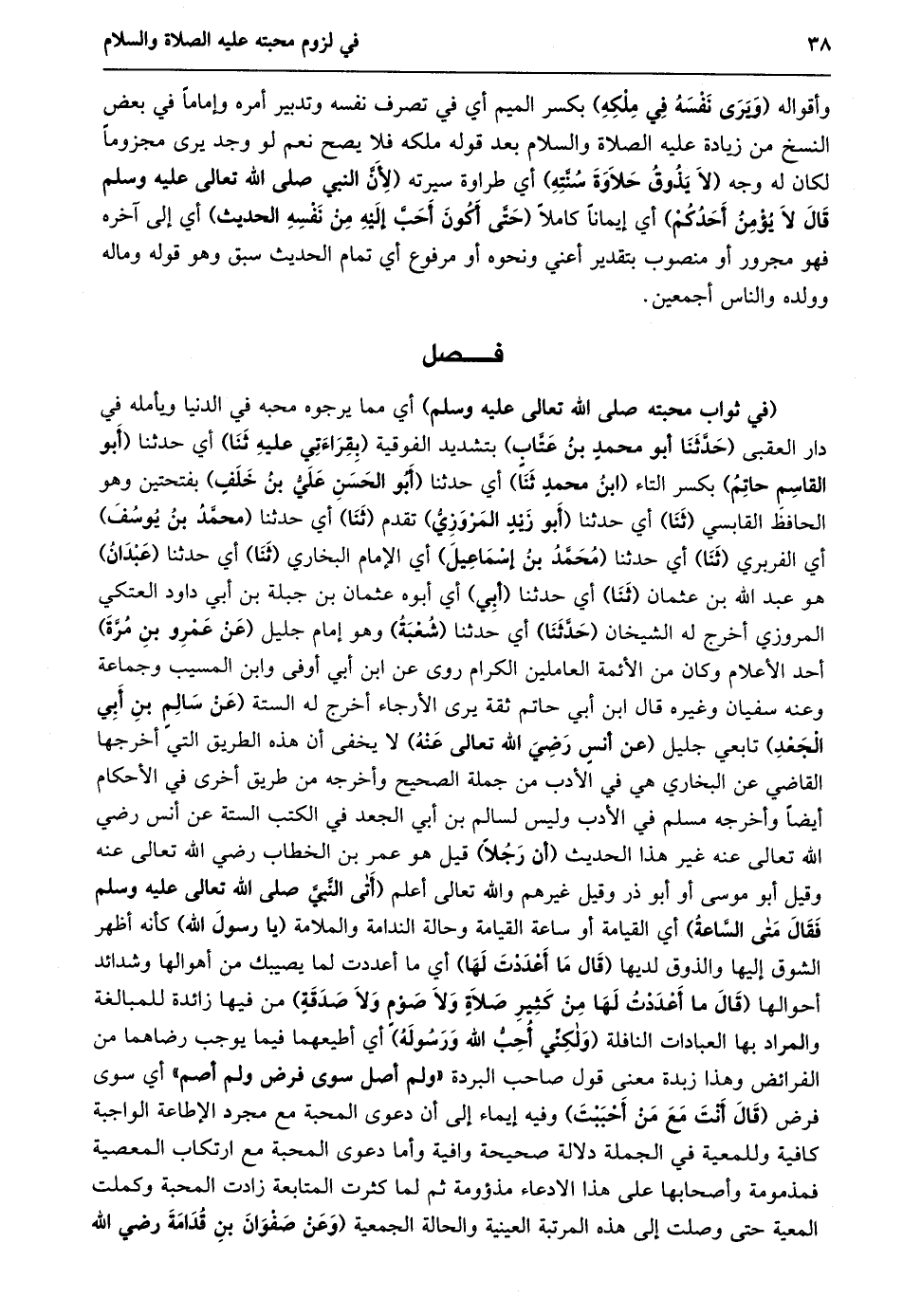 (في ثواب محبته صلى الله تعالى عليه وسلم) أي مما يرجوه محبه في الدنيا ويأمله في دار العقبى (حدّثنا أبو محمد بن عتّاب) بتشديد الفوقية (بقراءتي عليه ثنا) أي حدثنا (أبو القاسم حاتم) بكسر التاء (ابن محمد ثنا) أي حدثنا (أبو الحسن عليّ بن خلف) بفتحتين وهو الحافظ القابسي (ثنا) أي حدثنا (أبو زيد المروزيّ) تقدم (ثنا) أي حدثنا (محمّد بن يوسف) أي الفربري (ثنا) أي حدثنا (محمّد بن إسماعيل) أي الإمام البخاري (ثنا) أي حدثنا (عبدان) هو عبد الله بن عثمان (ثنا) أي حدثنا (أبي) أي أبوه عثمان بن جبلة بن أبي داود العتكي المروزي أخرج له الشيخان (حدّثنا) أي حدثنا (شعبة) وهو إمام جليل (عن عمرو بن مرّة) أحد الأعلام وكان من الأئمة العاملين الكرام روى عن ابن أبي أوفى وابن المسيب وجماعة وعنه سفيان وغيره قال ابن أبي حاتم ثقة يرى الأرجاء أخرج له الستة (عن سالم بن أبي الجعد) تابعي جليل (عن أنس رضي الله تعالى عنه) لا يخفى أن هذه الطريق التي أخرجها القاضي عن البخاري هي في الأدب من جملة الصحيح وأخرجه من طريق أخرى في الأحكام أيضا وأخرجه مسلم في الأدب وليس لسالم بن أبي الجعد في الكتب الستة عن أنس رضي الله تعالى عنه غير هذا الحديث (أن رجلا) قيل هو عمر بن الخطاب رضي الله تعالى عنه وقيل أبو موسى أو أبو ذر وقيل غيرهم والله تعالى أعلم (أتى النّبيّ صلى الله تعالى عليه وسلم فقال متى السّاعة) أي القيامة أو ساعة القيامة وحالة الندامة والملامة (يا رسول الله) كأنه أظهر الشوق إليها والذوق لديها (قال ما أعددت لها) أي ما أعددت لما يصيبك من أهوالها وشدائد أحوالها (قَالَ مَا أَعْدَدْتُ لَهَا مِنْ كَثِيرِ صَلَاةٍ ولا صوم ولا صدقة) من فيها زائدة للمبالغة والمراد بها العبادات النافلة (ولكنّي أحبّ الله ورسوله) أي أطيعهما فيما يوجب رضاهما من الفرائض وهذا زبدة معنى قول صاحب البردة «ولم أصل سوى فرض ولم أصم» أي سوى فرض (قال أنت مع من أحببت) وفيه إيماء إلى أن دعوى المحبة مع مجرد الإطاعة الواجبة كافية وللمعية في الجملة دلالة صحيحة وافية وأما دعوى المحبة مع ارتكاب المعصية فمذمومة وأصحابها على هذا الادعاء مذؤومة ثم لما كثرت المتابعة زادت المحبة وكملت المعية حتى وصلت إلى هذه المرتبة العينية والحالة الجمعية (وعن صفوان بن قدامة رضي الله