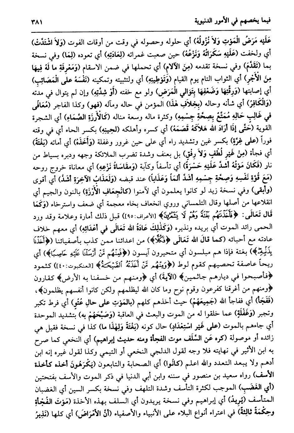 عليه مرض الموت ولا نزوله) أي حلوله وحصوله في وقت من أوقات الفوت (ولا اشتدّت) أي ولخفت (عليه سكراته ونزعه) حين صعبت غمراته (لعادته) أي تعوده (لما) وفي نسخة بما (تقدّم) وفي نسخة تقدمه (من الآلام) أي تحملها في ضمن الاسقام (ومعرفة ما له فيها من الأجر) أي الثواب التام يوم القيام (وتوطينه) أي ولتثبيته وتمكينه (نفسه على المصائب) أي إصابتها (ورقّتها وضعفها بتوالي المرض) ولو مع خفته (أو شدّته) وإن لم يتوال في مدته (والكافر) أي شأنه وحاله (بخلاف هذا) المؤمن في حاله ومآله (فهو) وكذا الفاجر (مُعَافًى فِي غَالِبِ حَالِهِ مُمَتَّعٌ بِصِحَّةِ جِسْمِهِ) وكثرة ماله وسعة مناله (كالأرزة الصّماء) أي الشجرة القوية (حتّى إذا أراد الله هلاكه قصمه) أي كسره وأهلكه (لحينه) بكسر الحاء أي في وقته فورا (على غرّة) بكسر غين وتشديد راء أي على حين غرور وغفلة (وأخذه) أي أماته (بغتة) أي فجأة (من غير لطف ولا رفق) بل بعنف وشدة تضرب الملائكة وجهه ودبره بسياط من نار (فكان موته أشدّ عليه حسرة) أي تأسفا وكآبة (ومقاساة نزعه) أي معاناة خروج روحه (مَعَ قُوَّةِ نَفْسِهِ وَصِحَّةِ جِسْمِهِ أَشَدَّ أَلَمًا وعذابا) عند قبضه (ولعذاب الآخرة أشدّ) أي أقوى (وأبقى) وفي نسخة زيد لو كانوا يعلمون أي لآمنوا (كانجعاف الأرزة) بالنون والجيم أي انقلاعها من أصلها وقال التلمساني وروي انخعاف بخاء معجمة أي ضعف واسترخاء (وَكَمَا قَالَ تَعَالَى: فَأَخَذْناهُمْ بَغْتَةً وَهُمْ لَا يَشْعُرُونَ [الأعراف: 95] ) قبل ذلك أمارة وعلامة وقد ورد الحمى رائد الموت أي بريده ونذيره (وكذلك عادة الله تعالى في أعدائه) أي معهم خلاف عادته مع أحبائه (كما قال الله تعالى فَكُلًّا) من اعدائنا ممن كذب بأصفيائنا (أَخَذْنا بِذَنْبِهِ) بغتة فإذا هم مبلسون أي متحيرون آيسون (فَمِنْهُمْ مَنْ أَرْسَلْنا عَلَيْهِ حاصِباً) أي ريحا عاصفة تحصيهم كقوم لوط (وَمِنْهُمْ مَنْ أَخَذَتْهُ الصَّيْحَةُ [العنكبوت: 40] ) كثمود فَأَصْبَحُوا فِي دِيارِهِمْ جاثِمِينَ (الآية) أي وَمِنْهُمْ مَنْ خَسَفْنا بِهِ الْأَرْضَ كقارون وَمِنْهُمْ مَنْ أَغْرَقْنا كفرعون وقوم نوح وَما كانَ اللَّهُ لِيَظْلِمَهُمْ وَلكِنْ كانُوا أَنْفُسَهُمْ يَظْلِمُونَ، (ففجأ) أي ففاجأ الله (جميعهم) حيث أخذهم كلهم (بالموت على حال عتو) أي فرط تكبر وتجبر (وغفلة) عما خلقوا له من الموت والبعث في العاقبة (وصبّحهم به) بتشديد الموحدة أي جاءهم بالموت (على غير استعداد) حال كونه (بغتة ولهذا ما) كذا في نسخة فقيل هي زائده أو موصولة (كره عن السّلف موت الفجأة ومنه حديث إبراهيم) أي النخعي كما صرح به ابن الأثير في نهايته فلا وجه لقول الدلجي النخعي أو التيمي وكذا لقول غيره إنه ابن أدهم ولا يبعد التعدد والله اعلم (كانوا) أي الصحابة والتابعون (يكرهون أخذه كأخذة الأسف) رواه سعيد بن منصور في سننه وابن أبي الدنيا في ذكر الموت والأسف بفتحتين (أي الغضب) الموجب لكثرة التأسف وشدة التلهف وفي نسخة بكسر السين أي الغضبان المتأسف (يريد) أي إبراهيم وفي نسخة يريدون أي السلف بهذه الأخذة (موت الفجأة وحكمة ثالثة) في اعتراء أنواع البلاء على الأنبياء والأصفياء (أنّ الأمراض) أي كلها (نذير