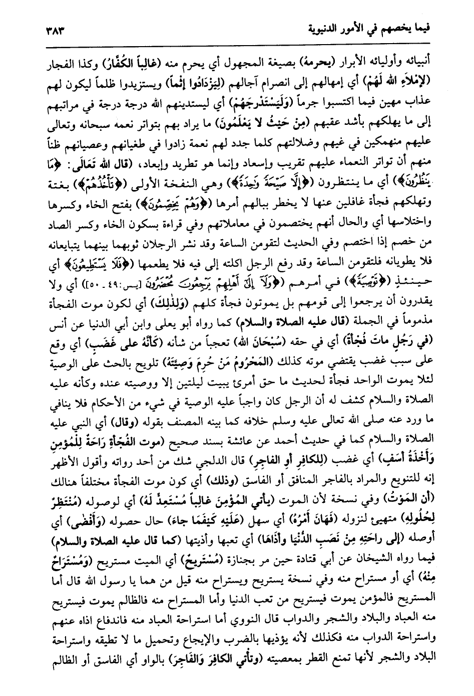 أنبيائه وأوليائه الأبرار (يحرمه) بصيغة المجهول أي يحرم منه (غالبا الكفّار) وكذا الفجار (لإملاء الله لهم) أي إمهالهم إلى انصرام آجالهم (ليزدادوا إثما) ويستزيدوا ظلما ليكون لهم عذاب مهين فيما اكتسبوا جرما (وليستدرجهم) أي ليستدينهم الله درجة درجة في مراتبهم إلى ما يهلكهم بأشد عقبهم (من حيث لا يعلمون) ما يراد بهم بتواتر نعمه سبحانه وتعالى عليهم منهمكين في غيهم وضلالتهم كلما جدد لهم نعمة زادوا في طغيانهم وعصيانهم ظنا منهم أن تواتر النعماء عليهم تقريب وإسعاد وإنما هو تطريد وإبعاد، (قال الله تعالى: ما يَنْظُرُونَ) أي ما ينتظرون (إِلَّا صَيْحَةً واحِدَةً) وهي النفخة الأولى (تَأْخُذُهُمْ) بغتة وتهلكهم فجأة غافلين عنها لا يخطر ببالهم أمرها (وَهُمْ يَخِصِّمُونَ) بفتح الخاء وكسرها واختلاسها أي والحال أنهم يختصمون في معاملاتهم وفي قراءة بسكون الخاء وكسر الصاد من خصم إذا اختصم وفي الحديث لتقومن الساعة وقد نشر الرجلان ثوبهما بينهما يتبايعانه فلا يطويانه فلتقومن الساعة وقد رفع الرجل اكلته إلى فيه فلا يطعمها (فَلا يَسْتَطِيعُونَ أي حينئذ (تَوْصِيَةً) في أمرهم (وَلا إِلى أَهْلِهِمْ يَرْجِعُونَ مُحْضَرُونَ [يس: 49- 50] ) أي ولا يقدرون أن يرجعوا إلى قومهم بل يموتون فجأة كلهم (ولذلك) أي لكون موت الفجأة مذموما في الجملة (قال عليه الصلاة والسلام) كما رواه أبو يعلى وابن أبي الدنيا عن أنس (في رجل مات فجأة) أي في حقه (سبحان الله) تعجبا من شأنه (كأنّه على غضب) أي وقع على سبب غضب يقتضي موته كذلك (المحروم من حرم وصيّته) تلويح بالحث على الوصية لئلا يموت الواحد فجأة لحديث ما حق أمرئ يبيت ليلتين إلا ووصيته عنده وكأنه عليه الصلاة والسلام كشف له أن الرجل كان واجبا عليه الوصية في شيء من الأحكام فلا ينافي ما ورد عنه صلى الله تعالى عليه وسلم خلافه كما بينه المصنف بقوله (وقال) أي النبي عليه الصلاة والسلام كما في حديث أحمد عن عائشة بسند صحيح (موت الفجّأة راحة للمؤمن وأخذة أسف) أي غضب (للكافر أو الفاجر) قال الدلجي شك من أحد رواته وأقول الأظهر إنه للتنويع والمراد بالفاجر المنافق أو الفاسق (وذلك) أي كون موت الفجأة مختلفا هنالك (أن الموت) وفي نسخة لأن الموت (يأتي المؤمن غالبا مستعدّ له) أي لوصوله (منتظر لحلوله) متهيئ لنزوله (فهان أمره) أي سهل (عليه كيفما جاء) حال حصوله (وأفضى) أي أوصله (إلى راحته من نصب الدّنيا وأذاها) أي تعبها وأذيتها (كما قال عليه الصلاة والسلام) فيما رواه الشيخان عن أبي قتادة حين مر بجنازة (مستريح) أي الميت مستريح (ومستراح منه) أي أو مستراح منه وفي نسخة يستريح ويستراح منه قيل من هما يا رسول الله قال أما المستريح فالمؤمن يموت فيستريح من تعب الدنيا وأما المستراح منه فالظالم يموت فيستريح منه العباد والبلاد والشجر والدواب قال النووي أما استراحة العباد منه فاندفاع اذاه عنهم واستراحة الدواب منه فكذلك لأنه يؤذيها بالضرب والإيجاع وتحميل ما لا تطيقه واستراحة البلاد والشجر لأنها تمنع القطر بمعصيته (وتأتي الكافر والفاجر) بالواو أي الفاسق أو الظالم
