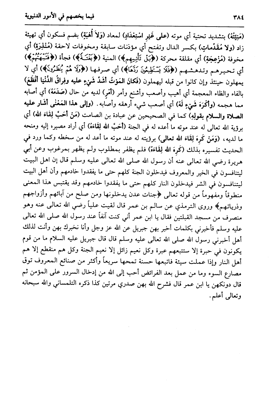 (منيّته) بتشديد تحتية أي موته (على غير استعداد) لمعاد (ولا أهبة) بضم فسكون أي تهيئة زاد (ولا مقدّمات) بكسر الدال وتفتح أي مؤذنات سابقة ومخوفات لاحقة (منذرة) أي مخوفة (مزعجة) أي مقلقة محركة (بَلْ تَأْتِيهِمْ) المنية (بَغْتَةً) فجأة (فَتَبْهَتُهُمْ) أي تحيرهم وتدهشهم (فَلا يَسْتَطِيعُونَ رَدَّها) أي صرفها (وَلا هُمْ يُنْظَرُونَ) أي لا يمهلون حينئذ وإن كانوا من قبله ليهملون (فَكَانَ الْمَوْتُ أَشَدَّ شَيْءٍ عَلَيْهِ وَفِرَاقُ الدُّنْيَا أفظع) بالفاء والظاء المعجمة أي أهيب وأصعب وأشنع وأمر (أمر) لديه من حال (صدمه) أي أصابه مما هجمه (وأكره شيء له) أي أصعب شيء أرهقه وأصابه. (وإلى هذا المعنى أشار عليه الصلاة والسلام بقوله) كما في الصحيحين عن عبادة بن الصامت (من أحبّ لقاء الله) أي برؤية الله تعالى له عند موته ما أعده له في الجنة (أحبّ الله لقاءه) أي أراد مصيره إليه ومنحه ما لديه، (ومن كره لقاء الله تعالى) برؤيته له عند موته ما أعد له من سخطه وكما ورد في الحديث تفسيره بذلك (كره الله لقاءه) فلم يظفر بمطلوب ولم يظهر بمرغوب وعن أبي هريرة رضي الله تعالى عنه أن رسول الله صلى الله تعالى عليه وسلم قال إن اهل البيت ليتنافسون في الخير والمعروف فيدخلون الجنة كلهم حتى ما يفقدوا خادمهم وأن أهل البيت ليتنافسون في الشر فيدخلون النار كلهم حتى ما يفقدوا خادمهم وقد يقتبس هذا المعنى منطوقا ومفهوما من قوله تعالى جَنَّاتُ عَدْنٍ يَدْخُلُونَها وَمَنْ صَلَحَ مِنْ آبائِهِمْ وَأَزْواجِهِمْ وَذُرِّيَّاتِهِمْ وروى الترمذي عن سالم بن عمر قال لقيت عليا رضي الله تعالى عنه وهو منصرف من مسجد القبلتين فقال يا ابن عمر أني كنت آنفا عند رسول الله صلى الله تعالى عليه وسلم فأخبرني بكلمات أخبر بهن جبريل عن الله عز وجل وأنا نخبرك بهن وأنت لذلك أهل أخبرني رسول الله صلى الله تعالى عليه وسلم قال قال جبريل عليه السلام ما من قوم يكونون في حبرة إلا ستتبعهم عبرة وكل نعيم زائل إلا نعيم الجنة وكل هم منقطع إلا هم أهل النار وإذا عملت سيئة فاتبعها حسنة تمحها سريعا وأكثر من صنائع المعروف توق مصارع السوء وما من عمل بعد الفرائض أحب إلى الله من إدخال السرور على المؤمن ثم قال دونكهن يا ابن عمر قال فشرح الله بهن صدري مرتين كذا ذكره التلمساني والله سبحانه وتعالى أعلم.