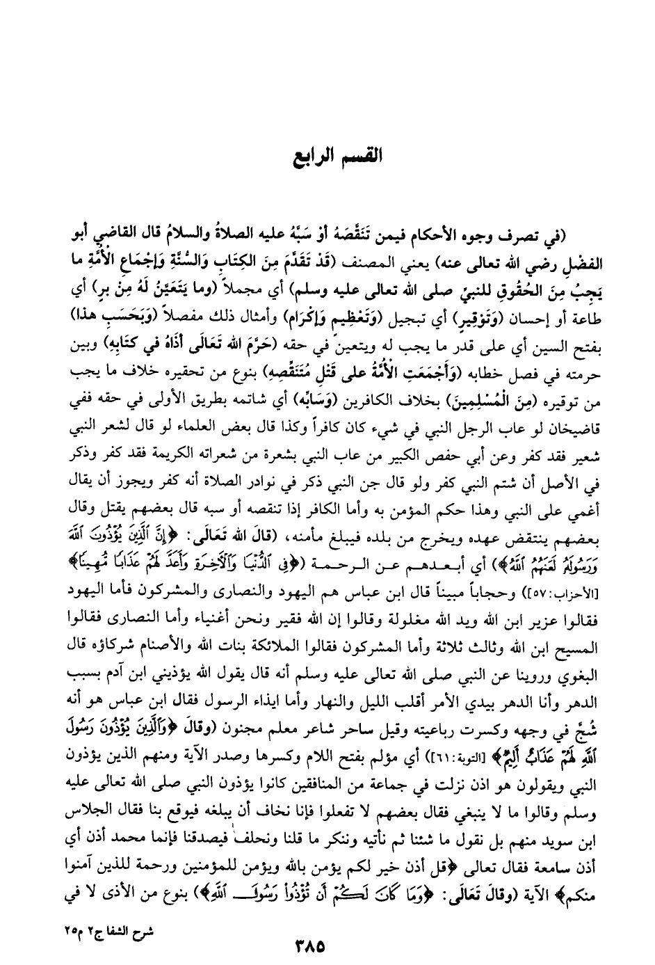 الْقِسْمُ الرَّابِعُ (فِي تَصَرُّفِ وُجُوهِ الْأَحْكَامِ فِيمَنْ تنقّصه أو سبّه عليه الصلاة والسلام