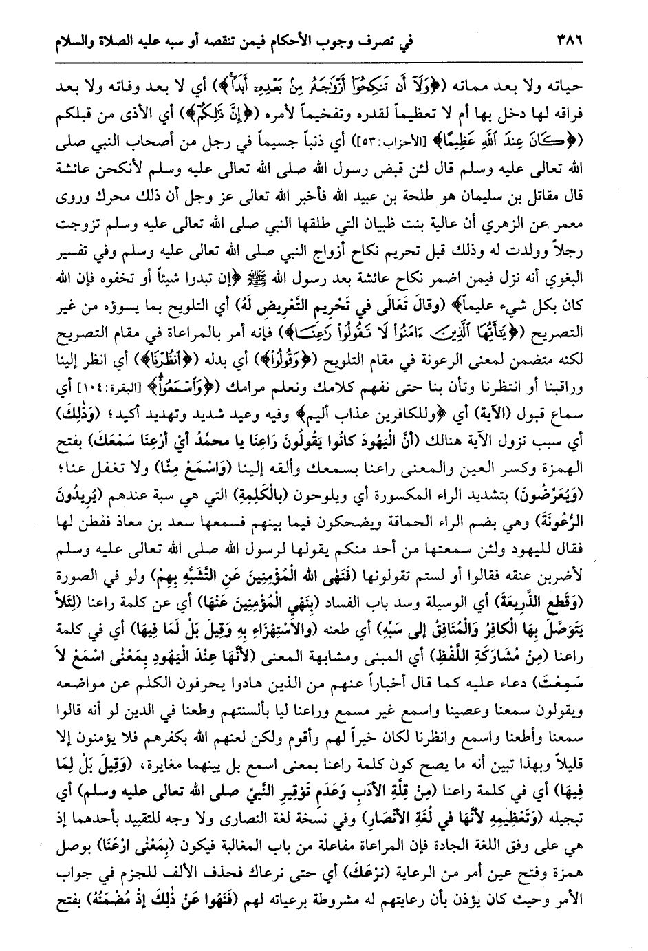 حياته ولا بعد مماته (وَلا أَنْ تَنْكِحُوا أَزْواجَهُ مِنْ بَعْدِهِ أَبَداً) أي لا بعد وفاته ولا بعد فراقه لها دخل بها أم لا تعظيما لقدره وتفخيما لأمره (إِنَّ ذلِكُمْ) أي الأذى من قبلكم (كانَ عِنْدَ اللَّهِ عَظِيماً [الأحزاب: 53] ) أي ذنبا جسيما في رجل من أصحاب النبي صلى الله تعالى عليه وسلم قال لئن قبض رسول الله صلى الله تعالى عليه وسلم لأنكحن عائشة قال مقاتل بن سليمان هو طلحة بن عبيد الله فأخبر الله تعالى عز وجل أن ذلك محرك وروى معمر عن الزهري أن عالية بنت ظبيان التي طلقها النبي صلى الله تعالى عليه وسلم تزوجت رجلا وولدت له وذلك قبل تحريم نكاح أزواج النبي صلى الله تعالى عليه وسلم وفي تفسير البغوي أنه نزل فيمن اضمر نكاح عائشة بعد رسول الله صلى الله عليه وسلم إِنْ تُبْدُوا شَيْئاً أَوْ تُخْفُوهُ فَإِنَّ اللَّهَ كانَ بِكُلِّ شَيْءٍ عَلِيماً (وقال تعالى في تحريم التّعريض له) أي التلويح بما يسوؤه من غير التصريح (يا أَيُّهَا الَّذِينَ آمَنُوا لا تَقُولُوا راعِنا) فإنه أمر بالمراعاة في مقام التصريح لكنه متضمن لمعنى الرعونة في مقام التلويح (وَقُولُوا) أي بدله (انْظُرْنا) أي انظر إلينا وراقبنا أو انتظرنا وتأن بنا حتى نفهم كلامك ونعلم مرامك (وَاسْمَعُوا [البقرة: 104] ) أي سماع قبول (الآية) أي وَلِلْكافِرِينَ عَذابٌ أَلِيمٌ وفيه وعيد شديد وتهديد أكيد؛ (وذلك) أي سبب نزول الآية هنالك (أَنَّ الْيَهُودَ كَانُوا يَقُولُونَ رَاعِنَا يَا مُحَمَّدُ أي أرعنا سمعك) بفتح الهمزة وكسر العين والمعنى راعنا بسمعك وألقه إلينا (واسمع منّا) ولا تغفل عنا؛ (ويعرّضون) بتشديد الراء المسكورة أي ويلوحون (بالكلمة) التي هي سبة عندهم (يريدون الرّعونة) وهي بضم الراء الحماقة ويضحكون فيما بينهم فسمعها سعد بن معاذ ففطن لها فقال لليهود ولئن سمعتها من أحد منكم يقولها لرسول الله صلى الله تعالى عليه وسلم لأضربن عنقه فقالوا أو لستم تقولونها (فنهى الله المؤمنين عن التّشبّه بهم) ولو في الصورة (وقطع الذّريعة) أي الوسيلة وسد باب الفساد (بنهي المؤمنين عنها) أي عن كلمة راعنا (لِئَلَّا يَتَوَصَّلَ بِهَا الْكَافِرُ وَالْمُنَافِقُ إِلَى سَبِّهِ) أي طعنه (والاستهزاء به وقيل بل لما فيها) أي في كلمة راعنا (من مشاركة اللّفظ) أي المبنى ومشابهة المعنى (لِأَنَّهَا عِنْدَ الْيَهُودِ بِمَعْنَى اسْمَعْ لَا سَمِعْتَ) دعاء عليه كما قال أخبارا عنهم من الذين هادوا يحرفون الكلم عن مواضعه ويقولون سمعنا وعصينا واسمع غير مسمع وراعنا ليا بألسنتهم وطعنا في الدين لو أنه قالوا سمعنا وأطعنا واسمع وانظرنا لكان خيرا لهم وأقوم ولكن لعنهم الله بكفرهم فلا يؤمنون إلا قليلا وبهذا تبين أنه ما يصح كون كلمة راعنا بمعنى اسمع بل يينهما مغايرة، (وقيل بل لما فيها) أي في كلمة راعنا (مِنْ قِلَّةِ الْأَدَبِ وَعَدَمِ تَوْقِيرِ النَّبِيِّ صَلَّى الله تعالى عليه وسلم) أي تبجيله (وتعظيمه لأنّها في لغة الأنصار) وفي نسخة لغة النصارى ولا وجه للتقييد بأحدهما إذ هي على وفق اللغة الجادة فإن المراعاة مفاعلة من باب المغالبة فيكون (بمعنى ارعنا) بوصل همزة وفتح عين أمر من الرعاية (نرعك) أي حتى نرعاك فحذف الألف للجزم في جواب الأمر وحيث كان يؤذن بأن رعايتهم له مشروطة برعياته لهم (فنهوا عن ذلك إذ مضمنه) بفتح