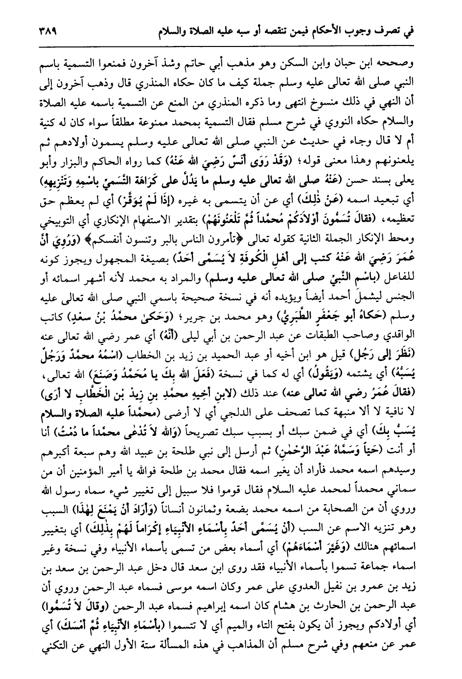وصححه ابن حبان وابن السكن وهو مذهب أبي حاتم وشذ آخرون فمنعوا التسمية باسم النبي صلى الله تعالى عليه وسلم جملة كيف ما كان حكاه المنذري قال وذهب آخرون إلى أن النهي في ذلك منسوخ انتهى وما ذكره المنذري من المنع عن التسمية باسمه عليه الصلاة والسلام حكاه النووي في شرح مسلم فقال التسمية بمحمد ممنوعة مطلقا سواء كان له كنية أم لا قال وجاء في حديث عن النبي صلى الله تعالى عليه وسلم يسمون أولادهم ثم يلعنونهم وهذا معنى قوله؛ (وقد روى أنس رضي الله عنه) كما رواه الحاكم والبزار وأبو يعلى بسند حسن (عنه صلى الله تعالى عَلَيْهِ وَسَلَّمَ مَا يَدُلُّ عَلَى كَرَاهَةِ التَّسَمِّي باسمه وتنزيهه) أي تبعيد اسمه (عن ذلك) أي عن أن يتسمى به غيره (إذا لم يوقّر) أي لم يعظم حق تعظيمه، (فقال تسمّون أولادكم محمّدا ثمّ تلعنونهم) بتقدير الاستفهام الإنكاري أي التوبيخي ومحط الإنكار الجملة الثانية كقوله تعالى تَأْمُرُونَ النَّاسَ بِالْبِرِّ وَتَنْسَوْنَ أَنْفُسَكُمْ (وَرُوِيَ أَنَّ عُمَرَ رَضِيَ اللَّهُ عَنْهُ كَتَبَ إلى أهل الكوفة لا يسمّى أحد) بصيغة المجهول ويجوز كونه للفاعل (باسم النّبيّ صلى الله تعالى عليه وسلم) والمراد به محمد لأنه أشهر اسمائه أو الجنس ليشمل أحمد أيضا ويؤيده أنه في نسخة صحيحة باسمي النبي صلى الله تعالى عليه وسلم (حكاه أبو جعفر الطّبريّ) وهو محمد بن جرير؛ (وحكى محمّد بن سعد) كاتب الواقدي وصاحب الطبقات عن عبد الرحمن بن أبي ليلى (أنّه) أي عمر رضي الله تعالى عنه (نظر إلى رجل) قيل هو ابن أخيه أو عبد الحميد بن زيد بن الخطاب (اسمه محمّد ورجل يسبّه) أي يشتمه (ويقول) أي له كما في نسخة (فعل الله بك يا محمّد وصنع) الله تعالى، (فقال عمر رضي الله تعالى عنه) عند ذلك (لِابْنِ أَخِيهِ مُحَمَّدِ بْنِ زَيْدِ بْنِ الْخَطَّابِ لا أرى) لا نافية لا ألا منبهة كما تصحف على الدلجي أي لا أرضى (محمّدا عليه الصلاة والسلام يسبّ بك) أي في ضمن سبك أو بسبب سبك تصريحا (والله لا تدعى محمّدا ما دمت) أنا أو أنت (حيّا وسمّاه عبد الرحمن) ثم أرسل إلى نبي طلحة بن عبيد الله وهم سبعة أكبرهم وسيدهم اسمه محمد فأراد أن يغير اسمه فقال محمد بن طلحة فو الله يا أمير المؤمنين أن من سماني محمدا لمحمد عليه السلام فقال قوموا فلا سبيل إلى تغيير شيء سماه رسول الله وروي أن من الصحابة من اسمه محمد بضعة وثمانون أنسانا (وأراد أن يمنع لهذا) السبب وهو تنزيه الاسم عن السب (أَنْ يُسَمَّى أَحَدٌ بِأَسْمَاءِ الْأَنْبِيَاءِ إِكْرَامًا لَهُمْ بذلك) أي بتغيير اسمائهم هنالك (وغيّر أسماءهم) أي أسماء بعض من تسمى بأسماء الأنبياء وفي نسخة وغير اسماء جماعة تسموا بأسماء الأنبياء فقد روى ابن سعد قال دخل عبد الرحمن بن سعد بن زيد بن عمرو بن نفيل العدوي على عمر وكان اسمه موسى فسماه عبد الرحمن وروي أن عبد الرحمن بن الحارث بن هشام كان اسمه إبراهيم فسماه عبد الرحمن (وقال لا تسمّوا) أي أولادكم ويجوز أن يكون بفتح التاء والميم أي لا تتسموا (بأسماء الأنبياء ثمّ أمسك) أي عمر عن منعهم وفي شرح مسلم أن المذاهب في هذه المسألة ستة الأول النهي عن التكني