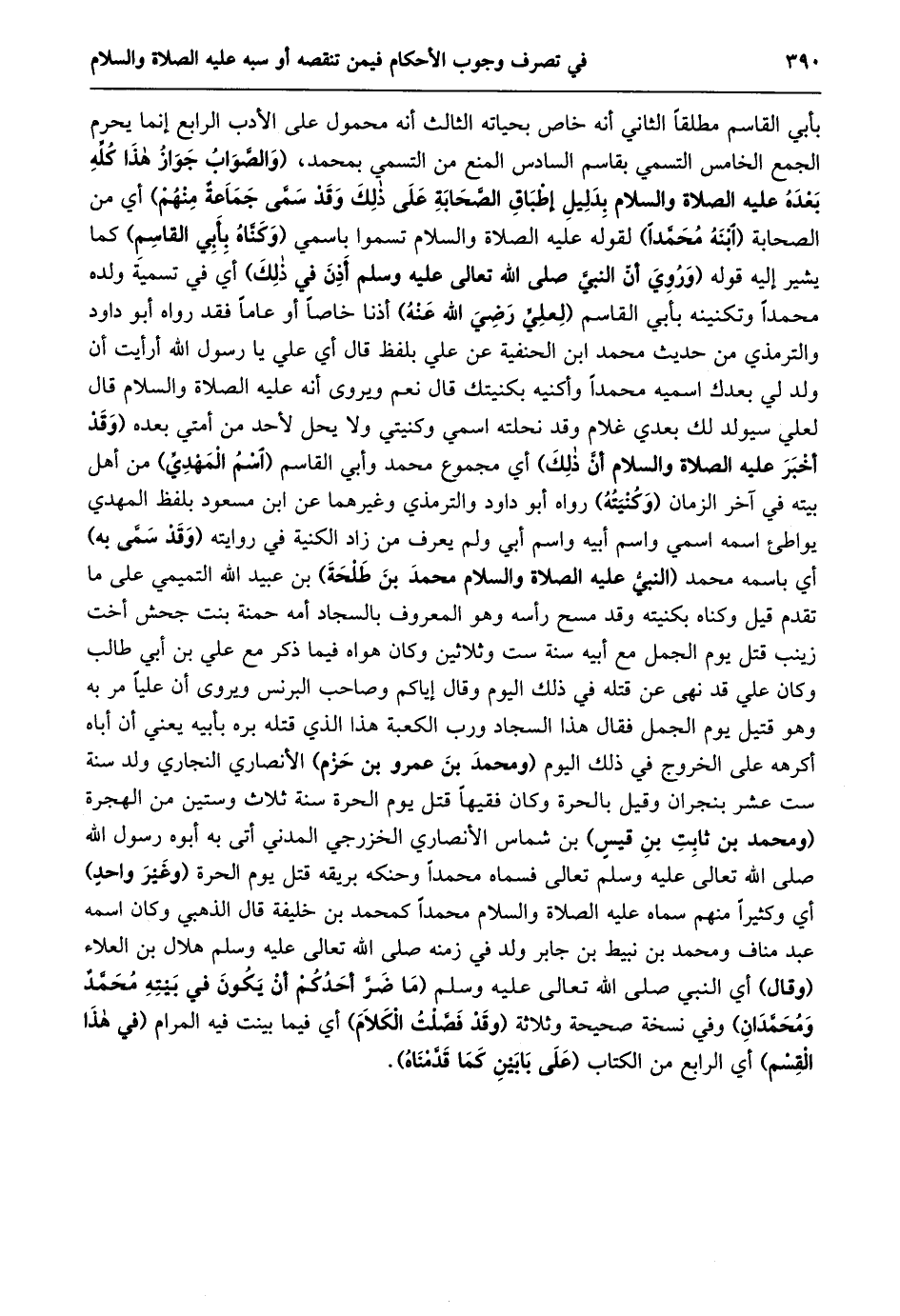 بأبي القاسم مطلقا الثاني أنه خاص بحياته الثالث أنه محمول على الأدب الرابع إنما يحرم الجمع الخامس التسمي بقاسم السادس المنع من التسمي بمحمد، (والصّواب جواز هذا كلّه بعده عليه الصلاة والسلام بِدَلِيلِ إِطْبَاقِ الصَّحَابَةِ عَلَى ذَلِكَ وَقَدْ سَمَّى جماعة منهم) أي من الصحابة (ابنه محمّدا) لقوله عليه الصلاة والسلام تسموا باسمي (وكنّاه بأبي القاسم) كما يشير إليه قوله (وروي أنّ النبيّ صلى الله تعالى عليه وسلم أذن في ذلك) أي في تسمية ولده محمدا وتكنينه بأبي القاسم (لعليّ رضي الله عنه) أذنا خاصا أو عاما فقد رواه أبو داود والترمذي من حديث محمد ابن الحنفية عن علي بلفظ قال أي علي يا رسول الله أرأيت أن ولد لي بعدك اسميه محمدا وأكنيه بكنيتك قال نعم ويروى أنه عليه الصلاة والسلام قال لعلي سيولد لك بعدي غلام وقد نحلته اسمي وكنيتي ولا يحل لأحد من أمتي بعده (وقد أخبر عليه الصلاة والسلام أنّ ذلك) أي مجموع محمد وأبي القاسم (اسم المهديّ) من أهل بيته في آخر الزمان (وكنيته) رواه أبو داود والترمذي وغيرهما عن ابن مسعود بلفظ المهدي يواطئ اسمه اسمي واسم أبيه واسم أبي ولم يعرف من زاد الكنية في روايته (وقد سمّى به) أي باسمه محمد (النبيّ عليه الصلاة والسلام محمد بن طلحة) بن عبيد الله التميمي على ما تقدم قيل وكناه بكنيته وقد مسح رأسه وهو المعروف بالسجاد أمه حمنة بنت جحش أخت زينب قتل يوم الجمل مع أبيه سنة ست وثلاثين وكان هواه فيما ذكر مع علي بن أبي طالب وكان علي قد نهى عن قتله في ذلك اليوم وقال إياكم وصاحب البرنس ويروى أن عليا مر به وهو قتيل يوم الجمل فقال هذا السجاد ورب الكعبة هذا الذي قتله بره بأبيه يعني أن أباه أكرهه على الخروج في ذلك اليوم (ومحمد بن عمرو بن حزم) الأنصاري النجاري ولد سنة ست عشر بنجران وقيل بالحرة وكان فقيها قتل يوم الحرة سنة ثلاث وستين من الهجرة (ومحمد بن ثابت بن قيس) بن شماس الأنصاري الخزرجي المدني أتى به أبوه رسول الله صلى الله تعالى عليه وسلم تعالى فسماه محمدا وحنكه بريقه قتل يوم الحرة (وغير واحد) أي وكثيرا منهم سماه عليه الصلاة والسلام محمدا كمحمد بن خليفة قال الذهبي وكان اسمه عبد مناف ومحمد بن نبيط بن جابر ولد في زمنه صلى الله تعالى عليه وسلم هلال بن العلاء (وقال) أي النبي صلى الله تعالى عَلَيْهِ وَسَلَّمَ (مَا ضَرَّ أَحَدَكُمْ أَنْ يَكُونَ في بيته محمّد ومحمّدان) وفي نسخة صحيحة وثلاثة (وقد فصّلت الكلام) أي فيما بينت فيه المرام (في هذا القسم) أي الرابع من الكتاب (عَلَى بَابَيْنِ كَمَا قَدَّمْنَاهُ) .