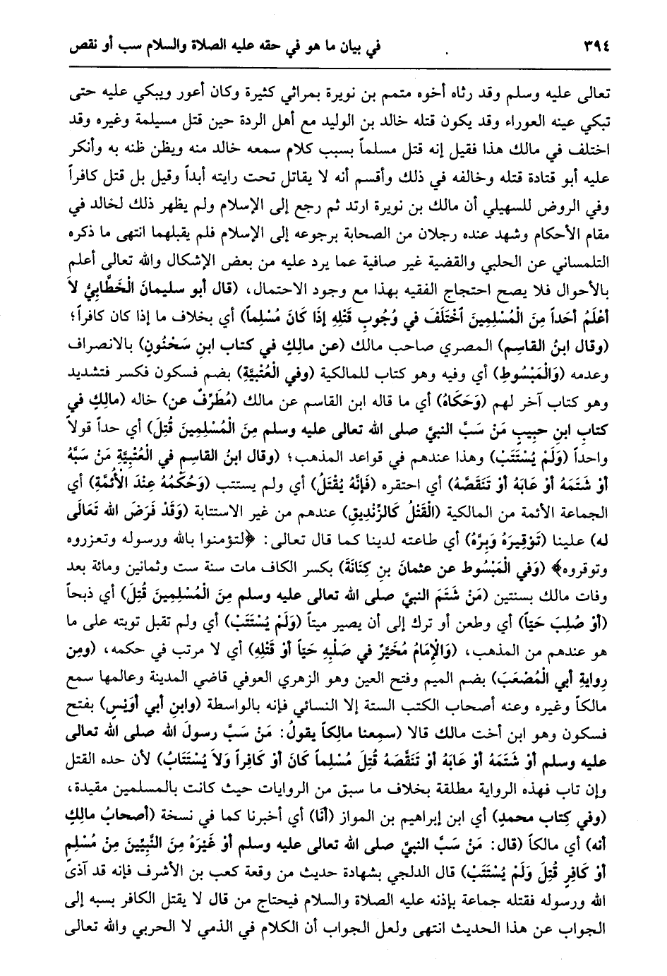 تعالى عليه وسلم وقد رثاه أخوه متمم بن نويرة بمراثي كثيرة وكان أعور ويبكي عليه حتى تبكي عينه العوراء وقد يكون قتله خالد بن الوليد مع أهل الردة حين قتل مسيلمة وغيره وقد اختلف في مالك هذا فقيل إنه قتل مسلما بسبب كلام سمعه خالد منه ويظن ظنه به وأنكر عليه أبو قتادة قتله وخالفه في ذلك وأقسم أنه لا يقاتل تحت رايته أبدا وقيل بل قتل كافرا وفي الروض للسهيلي أن مالك بن نويرة ارتد ثم رجع إلى الإسلام ولم يظهر ذلك لخالد في مقام الأحكام وشهد عنده رجلان من الصحابة برجوعه إلى الإسلام فلم يقبلهما انتهى ما ذكره التلمساني عن الحلبي والقضية غير صافية عما يرد عليه من بعض الإشكال والله تعالى أعلم بالأحوال فلا يصح احتجاج الفقيه بهذا مع وجود الاحتمال، (قال أَبُو سُلَيْمَانَ الْخَطَّابِيُّ لَا أَعْلَمُ أَحَدًا مِنَ الْمُسْلِمِينَ اخْتَلَفَ فِي وُجُوبِ قَتْلِهِ إِذَا كَانَ مسلما) أي بخلاف ما إذا كان كافرا؛ (وقال ابن القاسم) المصري صاحب مالك (عن مالك في كتاب ابن سحنون) بالانصراف وعدمه (والمبسوط) أي وفيه وهو كتاب للمالكية (وفي العتبيّة) بضم فسكون فكسر فتشديد وهو كتاب آخر لهم (وحكاه) أي ما قاله ابن القاسم عن مالك (مطرّف عن) خاله (مَالِكٍ فِي كِتَابِ ابْنِ حَبِيبٍ مَنْ سَبَّ النبيّ صلى الله تعالى عليه وسلم من المسلمين قتل) أي حدا قولا واحدا (ولم يستتب) وهذا عندهم في قواعد المذهب؛ (وقال ابْنُ الْقَاسِمِ فِي الْعُتْبِيَّةِ مَنْ سَبَّهُ أَوْ شتمه أو عابه أو تنقصّه) أي احتقره (فإنّه يقتل) أي ولم يستتب (وحكمه عند الأئمّة) أي الجماعة الأئمة من المالكية (القتل كالزّنديق) عندهم من غير الاستتابة (وقد فرض الله تعالى له) علينا (توقيره وبرّه) أي طاعته لدينا كما قال تعالى: لِتُؤْمِنُوا بِاللَّهِ وَرَسُولِهِ وَتُعَزِّرُوهُ وَتُوَقِّرُوهُ (وفي المبسوط عن عثمان بن كنانة) بكسر الكاف مات سنة ست وثمانين ومائة بعد وفات مالك بسنتين (من شتم النبيّ صلى الله تعالى عليه وسلم من المسلمين قتل) أي ذبحا (أو صلب حيّا) أي وطعن أو ترك إلى أن يصير ميتا (ولم يستتب) أي ولم تقبل توبته على ما هو عندهم من المذهب، (وَالْإِمَامُ مُخَيَّرٌ فِي صَلْبِهِ حَيًّا أَوْ قَتْلِهِ) أي لا مرتب في حكمه، (ومن رواية أبي المصعب) بضم الميم وفتح العين وهو الزهري العوفي قاضي المدينة وعالمها سمع مالكا وغيره وعنه أصحاب الكتب الستة إلا النسائي فإنه بالواسطة (وابن أبي أويس) بفتح فسكون وهو ابن أخت مالك قالا (سَمِعْنَا مَالِكًا يَقُولُ: مَنْ سَبَّ رَسُولَ اللَّهِ صلى الله تعالى عَلَيْهِ وَسَلَّمَ أَوْ شَتَمَهُ أَوْ عَابَهُ أَوْ تَنَقَّصَهُ قُتِلَ مُسْلِمًا كَانَ أَوْ كَافِرًا وَلَا يستتاب) لأن حده القتل وإن تاب فهذه الرواية مطلقة بخلاف ما سبق من الروايات حيث كانت بالمسلمين مقيدة، (وفي كتاب محمد) أي ابن إبراهيم بن المواز (أنا) أي أخبرنا كما في نسخة (أصحاب مالك أنه) أي مالكا (قال: من سبّ النبيّ صلى الله تعالى عَلَيْهِ وَسَلَّمَ أَوْ غَيْرَهُ مِنَ النَّبِيِّينَ مِنْ مسلم أو كافر قتل ولم يستتب) قال الدلجي بشهادة حديث من وقعة كعب بن الأشرف فإنه قد آذىّ الله ورسوله فقتله جماعة بإذنه عليه الصلاة والسلام فيحتاج من قال لا يقتل الكافر بسبه إلى الجواب عن هذا الحديث انتهى ولعل الجواب أن الكلام في الذمي لا الحربي والله تعالى