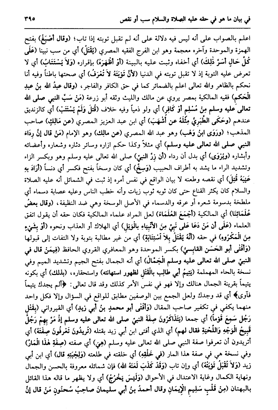 اعلم بالصواب على أنه ليس فيه دلالة على أنه لم تقبل توبته إذا تاب؛ (وقال أصبغ) بفتح الهمزة والموحدة وآخره معجمة وهو ابن الفرج الفقيه المصري (يقتل) أي من سب نبينا (على كلّ حال أسرّ ذلك) أي أخفاه وثبت عليه بالبينة (أو أظهره) بإقراره (ولا يستتاب) أي لا تعرض عليه التوبة إذ لا تقبل توبته في الدنيا (لأنّ توبته لا تعرف) أي صحتها باطنا وفيه أنا نحكم بالظاهر والله تعالى اعلم بالضمائر كما في حق الكافر والفاجر، (وقال عبد الله بن عبد الحكم) فقيه المالكية بمصر يروي عن مالك والليث وثقه أبو زرعة (من سبّ النبي صلى الله تعالى عليه وسلم من مسلم أو كافر) أي ولو ذميا وفيه خلاف (قتل ولم يستتب) أي كالزنديق عندهم (وحكى الطّبريّ مثله عن أشهب) أي ابن عبد العزيز المصري (عن مالك) صاحب المذهب؛ (وروى ابن وهب) وهو عبد الله المصري (عن مالك) وهو الإمام (مَنْ قَالَ إِنَّ رِدَاءَ النَّبِيِّ صَلَّى اللَّهُ تعالى عليه وسلم) أي مثلا وكذا حكم ازاره وسائر دثاره وشعاره وأعضائه وأبشاره (ويروى) أي بدل أن رداء (أن زرّ النبيّ) صلى الله تعالى عليه وسلم وهو وبكسر الزاء وتشديد الراء ما يشد به أطراف الحبيب (وسخّ) أي كان وسخا بفتح فكسر أي دنسا (أراد به عيبه قتل) أي نقصه وطعنه لا بيان الواقع في نفس أمره إذ ثبت في الشمائل أنه عليه الصلاة والسلام كان يكثر القناع حتى كان ثوبه ثوب زيات وأنه خطب الناس وعليه عصابة دسماء أي ملطخة بدسمومة شعره أو عرقه والدسماء في الأصل الوسخة وهي ضد النظيفة، (وقال بعض علمائنا) أي المالكية (أجمع العلماء) لعل المراد علماء المالكية فكان حقه أن يقول اتفق الْعُلَمَاءُ (عَلَى أَنَّ مَنْ دَعَا عَلَى نَبِيٍّ من الأنبياء بالويل) أي الهلاك أو العذاب ونحوه (أو بشيء من المكروه) في حقه (أنّه يقتل بلا استتابة) أي من غير مطالبة بتوبة ولا التفات إلى قبولها (وأفتى أبو الحسن القابسيّ) بكسر الموحدة وهو المعافري القروي الحافظ (فيمن قال في النبيّ صلى الله تعالى عليه وسلم الجمّال) أي أنه الجمال بفتح الجيم وتشديد الميم وفي نسخة بالحاء المهملمة (يتيم أبي طالب بالقتل لظهور استهانته) واستحقاره، (بذلك) أي بكونه يتيما بقرينة الجمال هنالك وإلا فهو في نفس الأمر كذلك وقد قال تعالى: أَلَمْ يَجِدْكَ يَتِيماً فَآوى أي قد وجدك ولعل الجمع بين الوصفين مطابق للواقع في السؤال وإلا فكل واحد منهما يكفي في تكفير صاحب المقال (وأفتى أبو محمد بن أبي زيد) أي القيرواني (بقتل رجل سمع قوما) أي جمعا (يتذاكرون صفة النبيّ صلى الله تعالى عَلَيْهِ وَسَلَّمَ إِذْ مَرَّ بِهِمْ رَجُلٌ قَبِيحُ الوجه واللّحية فقال لهم) أي الذي أفتى ابن أبي زيد بقتله (تريدون تعرفون صفته) أي أتريدون أن تعرفوا صفة النبي صلى الله تعالى عليه وسلم (هي) أي صفته (صفة هذا المارّ) وفي نسخة هِيَ فِي صِفَةِ هَذَا الْمَارِّ (فِي خَلْقِهِ) أي خلقته في طلعته (ولجبته قال) أي ابن أبي زيد (ولا تقبل توبته) أي وإن تاب (وقد كذب لعنه الله) فإن شمائله معروفة بالحسن والجمال ونهاية الكمال وغاية الاعتدال في الأحوال (وليس يخرج) أي ولا يظهر ما قاله هذا القائل بالبهتان (مِنْ قَلْبٍ سَلِيمِ الْإِيمَانِ وَقَالَ أَحْمَدُ بْنُ أَبِي سُلَيْمَانَ صَاحِبُ سُحْنُونٍ مَنْ قَالَ إِنَّ