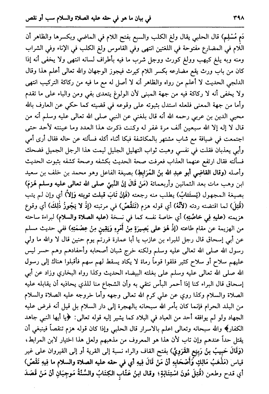 دم مسلم) قال الحلبي يقال ولغ الكلب والسبع بفتح اللام في الماضي وبكسرها والظاهر أن اللام في المضارع مفتوحة في اللغتين انتهى وفي القاموس ولغ الكلب في الإناء وفي الشراب ومنه وبه يلغ كيهب وولغ كورث ووجل شرب ما فيه بأطراف لسانه انتهى ولا يخفى أنه إذا كان من باب ورث يقع مضارعه بكسر اللام كيرث فيجوز الوجهان والله تعالى أعلم هذا وقال الدلجي الحديث لا أعلم من رواه والظاهر أنه لا أصل له مع ما فيه من ركاكة التركيب انتهى ولا يخفى أنه لا ركاكة فيه من جهة المبنى لأن الولوغ يتعدى بفي ومن والباء على ما تقدم وأما من جهة المعنى فلعله استدل بثبوته على وقوعه في قضيته كما حكي عن العارف بالله محيي الدين بن عربي رحمه الله أنه قال بلغني عن النبي صلى الله تعالى عليه وسلم أنه من قال لا إله إلا الله سبعين ألف مرة غفر له وكنت ذكرت هذا العدد وما عينته لأحد حتى اجتمعت في ضيافة مع شاب مشتهر بالمكاشفة فبكا أثناء أكله فسألته عن حاله فقال أرى أمي وأبي يعذبان فقلت في نفسي وهبت ثواب التهليل الجليل ليمت هذا الرجل الجميل فضحك فسألته فقال ارتفع عنهما العذاب فعرفت صحة الحديث بكشفه وصحة كشفه بثبوت الحديث وأصله (وَقَالَ الْقَاضِي أَبُو عَبْدِ اللَّهِ بْنُ الْمُرَابِطِ) بصيغة الفاعل وهو محمد بن خلف بن سعيد ابن وهب مات بعد الثمانين وأربعمائة (من قال إنّ النّبيّ صلى الله تعالى عليه وسلم هزم) بصيغة المجهول (يستتاب) يطلب منه رجعته (فإن تاب قبلت توبته وإلّا) أي وإن لم يتب (قتل) لما اقتضته ردته (لأنّه) أي قوله هزم (تنقّص) في مرتبته (إذ لا يجوز ذلك) أي وقوع هزيمته (عليه في خاصّته) أي خاصة نفسه كما في نسخة (عليه الصلاة والسلام) لبراءة ساحته من الهزيمة عن مقام طاعته (إِذْ هُوَ عَلَى بَصِيرَةٍ مِنْ أَمْرِهِ وَيَقِينٍ من عصمته) ففي حديث مسلم عن أبي إسحاق قال رجل للبراء بن عازب يا أبا عمارة فررتم يوم حنين قال لا والله ما ولي رسول الله صلى الله تعالى عليه وسلم ولكنه خرج شبان أصحابه وأحفادهم وهم حسر ليس عليهم سلاح أو سلاح كثير فلقوا قوما رماة لا يكاد يسقط لهم سهم فأقبلوا هناك إلى رسول الله صلى الله تعالى عليه وسلم على بغلته البيضاء الحديث وكذا رواه البخاري وزاد عن أبي إسحاق قال البراء كنا إذا أحمر البأس نتقي به وأن الشجاع منا للذي يحاذيه أن يقابله عليه الصلاة والسلام وكذا روي عن علي كرم الله تعالى وجهه وأما خروجه عليه الصلاة والسلام من البلد الحرام فإنما كان بأمر الله سبحانه بالهجرة إلى دار السلام بل قيل أنه فرض عليه الجهاد ولو لم يوافقه أحد من العباد في البلاد كما يشير إليه قوله تعالى: يا أَيُّهَا النَّبِيُّ جاهِدِ الْكُفَّارَ والله سبحانه وتعالى اعلم بالاسرار قال الحلبي وإذا كان قوله هزم تنقصا فينبغي أن يقتل حدا عندهم وإن تاب لأن هذا هو المعروف من مذهبهم ولعل هذا اختيار لابن المرابط، (وقال حبيب بن ربيع القرويّ) بفتح القاف والراء نسبة إلى القرية أو إلى القيروان على غير قياس (مَذْهَبُ مَالِكٍ وَأَصْحَابِهِ أَنَّ مَنْ قَالَ فِيهِ أي في حقه عليه الصلاة والسلام ما فيه نقص) أي قدح وطعن (قُتِلَ دُونَ اسْتِتَابَةٍ؛ وَقَالَ ابْنُ عَتَّابٍ الْكِتَابُ وَالسُّنَّةُ مُوجِبَانِ أَنَّ مَنْ قَصَدَ