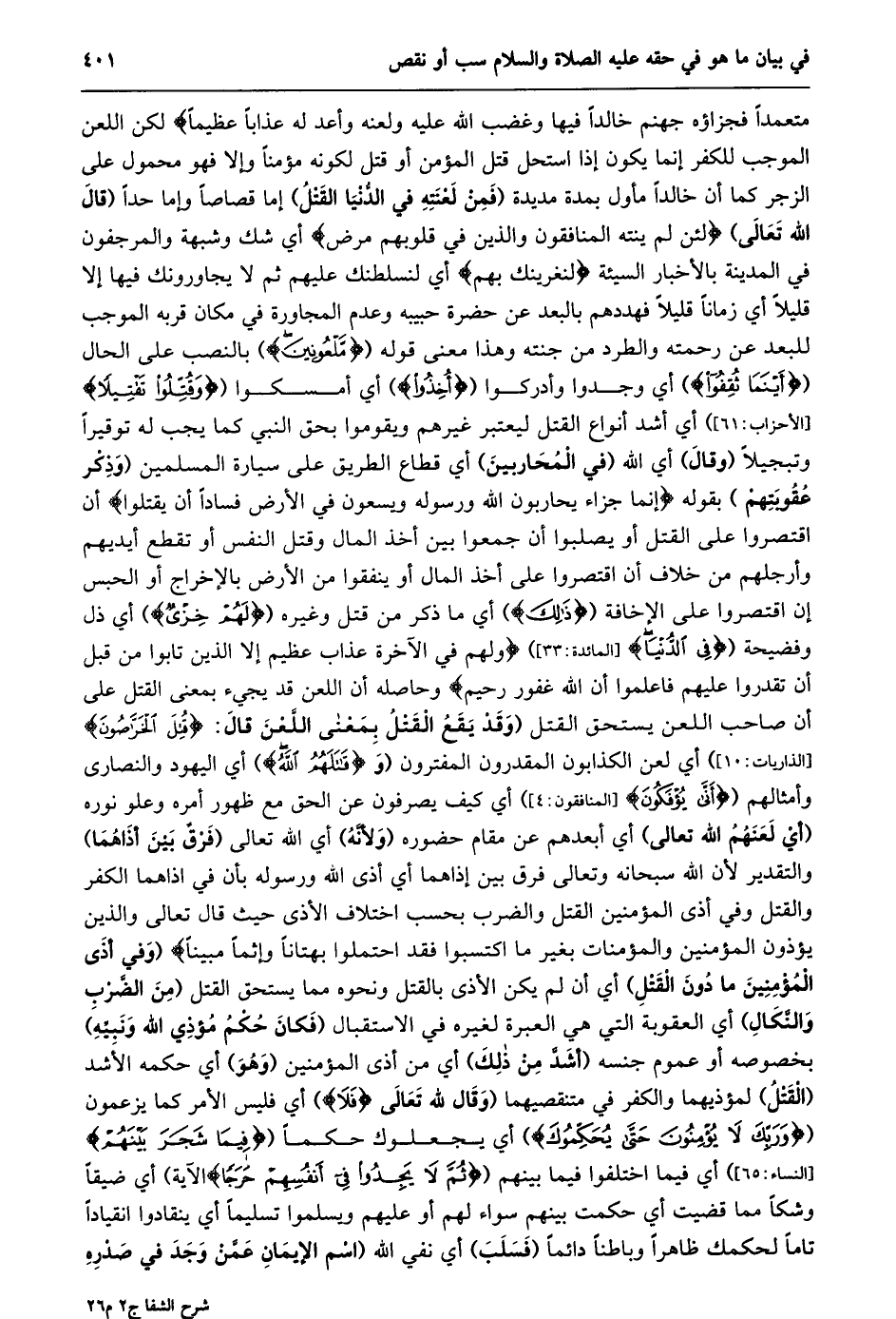 مُتَعَمِّداً فَجَزاؤُهُ جَهَنَّمُ خالِداً فِيها وَغَضِبَ اللَّهُ عَلَيْهِ وَلَعَنَهُ وَأَعَدَّ لَهُ عَذاباً عَظِيماً لكن اللعن الموجب للكفر إنما يكون إذا استحل قتل المؤمن أو قتل لكونه مؤمنا وإلا فهو محمول على الزجر كما أن خالدا مأول بمدة مديدة (فمن لعنته في الدّنيا القتل) إما قصاصا وإما حدا (قال الله تَعَالَى) لَئِنْ لَمْ يَنْتَهِ الْمُنافِقُونَ وَالَّذِينَ فِي قُلُوبِهِمْ مَرَضٌ أي شك وشبهة والمرجفون في المدينة بالأخبار السيئة لَنُغْرِيَنَّكَ بِهِمْ أي لنسلطنك عليهم ثم لا يجاورونك فيها إلا قليلا أي زمانا قليلا فهددهم بالبعد عن حضرة حبيبه وعدم المجاورة في مكان قربه الموجب للبعد عن رحمته والطرد من جنته وهذا معنى قوله (مَلْعُونِينَ) بالنصب على الحال (أَيْنَما ثُقِفُوا) أي وجدوا وأدركوا (أُخِذُوا) أي أمسكوا (وَقُتِّلُوا تَقْتِيلًا [الأحزاب: 61] ) أي أشد أنواع القتل ليعتبر غيرهم ويقوموا بحق النبي كما يجب له توقيرا وتبجيلا (وقال) أي الله (في المحاربين) أي قطاع الطريق على سيارة المسلمين (وذكر عقوبتهم) بقوله إِنَّما جَزاءُ الَّذِينَ يُحارِبُونَ اللَّهَ وَرَسُولَهُ وَيَسْعَوْنَ فِي الْأَرْضِ فَساداً أَنْ يُقَتَّلُوا أن اقتصروا على القتل أو يصلبوا أن جمعوا بين أخذ المال وقتل النفس أو تقطع أيديهم وأرجلهم من خلاف أن اقتصروا على أخذ المال أو ينفقوا من الأرض بالإخراج أو الحبس إن اقتصروا على الإخافة (ذلِكَ) أي ما ذكر من قتل وغيره (لَهُمْ خِزْيٌ) أي ذل وفضيحة (فِي الدُّنْيا [المائدة: 33] ) وَلَهُمْ فِي الْآخِرَةِ عَذابٌ عَظِيمٌ إِلَّا الَّذِينَ تابُوا مِنْ قَبْلِ أَنْ تَقْدِرُوا عَلَيْهِمْ فَاعْلَمُوا أَنَّ اللَّهَ غَفُورٌ رَحِيمٌ وحاصله أن اللعن قد يجيء بمعنى القتل على أن صاحب اللعن يستحق القتل (وقد يقع القتل بمعنى اللّعن قال: قُتِلَ الْخَرَّاصُونَ [الذاريات: 10] ) أي لعن الكذابون المقدرون المفترون (وقاتَلَهُمُ اللَّهُ) أي اليهود والنصارى وأمثالهم (أَنَّى يُؤْفَكُونَ [المنافقون: 4] ) أي كيف يصرفون عن الحق مع ظهور أمره وعلو نوره (أي لعنهم الله تعالى) أي أبعدهم عن مقام حضوره (ولأنّه) أي الله تعالى (فرق بين أذاهما) والتقدير لأن الله سبحانه وتعالى فرق بين إذاهما أي أذى الله ورسوله بأن في اذاهما الكفر والقتل وفي أذى المؤمنين القتل والضرب بحسب اختلاف الأذى حيث قال تعالى وَالَّذِينَ يُؤْذُونَ الْمُؤْمِنِينَ وَالْمُؤْمِناتِ بِغَيْرِ مَا اكْتَسَبُوا فَقَدِ احْتَمَلُوا بُهْتاناً وَإِثْماً مُبِيناً (وفي أذى المؤمنين ما دون القتل) أي أن لم يكن الأذى بالقتل ونحوه مما يستحق القتل (من الضّرب والنّكال) أي العقوبة التي هي العبرة لغيره في الاستقبال (فكان حكم مؤذي الله ونبيّه) بخصوصه أو عموم جنسه (أشدّ من ذلك) أي من أذى المؤمنين (وهو) أي حكمه الأشد (القتل) لمؤذيهما والكفر في متنقصيهما (وقال لله تعالى فَلا أي فليس الأمر كما يزعمون (وَرَبِّكَ لا يُؤْمِنُونَ حَتَّى يُحَكِّمُوكَ) أي يجعلوك حكما (فِيما شَجَرَ بَيْنَهُمْ [النساء: 65] ) أي فيما اختلفوا فيما بَيْنَهُمْ (ثُمَّ لَا يَجِدُوا فِي أَنْفُسِهِمْ حَرَجاً الآية) أي ضيقا وشكا مما قضيت أي حكمت بينهم سواء لهم أو عليهم ويسلموا تسليما أي ينقادوا انقيادا تاما لحكمك ظاهرا وباطنا دائما (فسلب) أي نفي الله (اسْمَ الْإِيمَانِ عَمَّنْ وُجِدَ فِي صَدْرِهِ