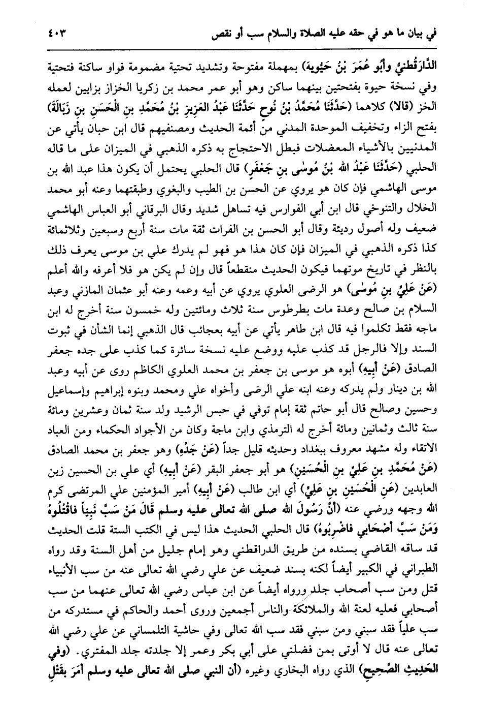 الدّارقطنيّ وأبو عمر بن حيّويه) بمهملة مفتوحة وتشديد تحتية مضمومة فواو ساكنة فتحتية وفي نسخة حيوة بفتحتين بينهما ساكن وهو أبو عمر محمد بن زكريا الخزاز بزايين لعمله الخز (قالا) كلاهما (حَدَّثَنَا مُحَمَّدُ بْنُ نُوحٍ حَدَّثَنَا عَبْدُ الْعَزِيزِ بن محمّد بن الحسن بن زبالة) بفتح الزاء وتخفيف الموحدة المدني من أئمة الحديث ومصنفيهم قال ابن حبان يأتي عن المدنيين بالأشياء المعضلات فبطل الاحتجاج به ذكره الذهبي في الميزان على ما قاله الحلبي (حَدَّثَنَا عَبْدُ اللَّهِ بْنُ مُوسَى بْنِ جَعْفَرٍ) قال الحلبي يحتمل أن يكون هذا عبد الله بن موسى الهاشمي فإن كان هو يروي عن الحسن بن الطيب والبغوي وطبقتهما وعنه أبو محمد الخلال والتنوخي قال ابن أبي الفوارس فيه تساهل شديد وقال البرقاني أبو العباس الهاشمي ضعيف وله أصول رديئة وقال أبو الحسن بن الفرات ثقة مات سنة أربع وسبعين وثلاثمائة كذا ذكره الذهبي في الميزان فإن كان هذا هو فهو لم يدرك علي بن موسى يعرف ذلك بالنظر في تاريخ موتهما فيكون الحديث منقطعا قال وإن لم يكن هو فلا أعرفه والله أعلم (عن عليّ بن موسى) هو الرضى العلوي يروي عن أبيه وعمه وعنه أبو عثمان المازني وعبد السلام بن صالح وعدة مات بطرطوس سنة ثلاث ومائتين وله خمسون سنة أخرج له ابن ماجه فقط تكلموا فيه قال ابن طاهر يأتي عن أبيه بعجائب قال الذهبي إنما الشأن في ثبوت السند وإلا فالرجل قد كذب عليه ووضع عليه نسخة سائرة كما كذب على جده جعفر الصادق (عن أبيه) أبوه هو موسى بن جعفر بن محمد العلوي الكاظم روى عن أبيه وعبد الله بن دينار ولم يدركه وعنه ابنه علي الرضى وأخواه علي ومحمد وبنوه إبراهيم وإسماعيل وحسين وصالح قال أبو حاتم ثقة إمام توفي في حبس الرشيد ولد سنة ثمان وعشرين ومائة سنة ثالث وثمانين ومائة أخرج له الترمذي وابن ماجة وكان من الأجواد الحكماء ومن العباد الاتقاء وله مشهد معروف ببغداد وحديثه قليل جدا (عن جدّه) وهو جعفر بن محمد الصادق (عن محمّد بن عليّ بن الحسين) هو أبو جعفر البقر (عن أبيه) أي علي بن الحسين زين العابدين (عن الحسين بن عليّ) أي ابن طالب (عن أبيه) أمير المؤمنين علي المرتضى كرم الله وجهه ورضي عنه (أنّ رسول الله صلى الله تعالى عَلَيْهِ وَسَلَّمَ قَالَ مَنْ سَبَّ نَبِيًّا فَاقْتُلُوهُ ومن سبّ أصحابي فاضربوه) قال الحلبي الحديث هذا ليس في الكتب الستة قلت الحديث قد ساقه القاضي بسنده من طريق الدراقطني وهو إمام جليل من أهل السنة وقد رواه الطبراني في الكبير أيضا لكنه بسند ضعيف عن علي رضي الله تعالى عنه من سب الأنبياء قتل ومن سب أصحاب جلد ورواه أيضا عن ابن عباس رضي الله تعالى عنهما مَنْ سَبَّ أَصْحَابِي فَعَلَيْهِ لَعْنَةُ اللَّهِ وَالْمَلَائِكَةِ والناس أجمعين وروى أحمد والحاكم في مستدركه من سب عليا فقد سبني ومن سبني فقد سب الله تعالى وفي حاشية التلمساني عن علي رضي الله تعالى عنه قال لا أوتى بمن فضلني على أبي بكر وعمر إلا جلدته جلد المفتري. (وفي الحديث الصّحيح) الذي رواه البخاري وغيره (أن النبي صلى الله تعالى عليه وسلم أمر بقتل