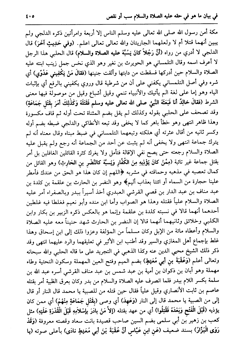 مكة أمن رسول الله صلى الله تعالى عليه وسلم الناس إلا أربعة وامرأتين ذكره الدلجي ولم يبين أنهما قتلا أم لا ولعلهما الجاريتان والله تعالى تعالى اعلم. (وفي حديث آخر) قال الدلجي لا أدري من رواه (أنّ رجلا كان يسبّه عليه الصلاة والسلام) قال الحلبي هذا الرجل لا أعرف اسمه وقال التلمساني هو الحويرث بن نغير وهو الذي نخس جمل زينب ابنته عليه الصلاة والسلام حين أدركها فسقطت من دابتها وألقت جنينها (فقال من يكفيني عدوّي) أي شره وفي أصل التلمساني يكفني على أن من شرطية قال وروي يكفيني بالرفع أي بإثبات الياء وهو إما على لغة الم يأتيك والأنبياء تنمي وقيل أشباع وقيل من موصولة فيها معنى الشرط (فَقَالَ خَالِدٌ أَنَا فَبَعَثَهُ النَّبِيُّ صَلَّى اللَّهُ تعالى عَلَيْهِ وَسَلَّمَ فَقَتَلَهُ وَكَذَلِكَ أَمَرَ بِقَتْلِ جَمَاعَةٍ) وقد تصحف على الحلبي بقوله وكذلك لم يقل بضم المثناه تحت أوله ثم قاف مكسورة وهذا ظاهر انتهى وهو خطأ باهر كما لا يخفى وقد تبعه الأنطاكي والدلجي ضبطه بضم أوله وكسر ثانيه من أقال عثرته أي هلكته وتبعهما التلمساني في ضبط مبناه وقال معناه أنه لم يترك جماعة انتهى ولا يخفى أنه لم يثبت عن أحد من الجماعة أنه رجع ولم يقبل عليه الصلاة والسلام رجعته حتى يصح نفي الإقالة فتأمل ولا يغرك كثرة القائلين الغافلين بل أمر بقتل جماعة غير تائبة (مِمَّنْ كَانَ يُؤْذِيهِ مِنَ الْكُفَّارِ وَيَسُبُّهُ كَالنَّضْرِ بن الحارث) وهو القائل من كمال تعصبه في مذهبه وحماقته في مشربه اللَّهُمَّ إِنْ كانَ هذا هُوَ الْحَقَّ مِنْ عِنْدِكَ فَأَمْطِرْ عَلَيْنا حِجارَةً مِنَ السَّماءِ أَوِ ائْتِنا بِعَذابٍ أَلِيمٍ وهو النضر بن الحارث بن علقمة بن كلدة بن عبد مناف بن عبد الدار بن قصي القرشي العبدري أخذ أسيرا ببدر وبالصفراء أمر عليه الصلاة والسلام عليا فقتله وهذا هو الصواب وأما ابن منده وأبو نعيم فغلطا فيه غلطين أحدهما أنهما قالا في نسبته كلدة بن علقمة وإنما هو بالعكس ذكره الزبير بن بكار وابن الكلبي وخلائق وثانيهما أنهما قالا إن النضر بن الحارث شهد حنينا معه عليه الصلاة والسلام وأعطاه مائة من الإبل وكان مسلما من المؤلفة وعزوا ذلك إلى ابن إسحاق وهذا غلط بإجماع أهل المغازي والسير وقد أطنب ابن الأثير في تعليقهما والرد عليهما انتهى وقد ذكر ذلك الشيخ محيي الدين عنه وكذا الذهبي في التجريد على ما قاله الحلبي والله سبحانه وتعالى أعلم (وعقبة بن أبي معيط) بضم الميم وفتح العين المهملة وسكون التحتية وطاء مهملة وهو أبان بن ذكوان بن أمية بن عبد شمس بن عبد مناف القرشي أسره عبد الله بن سلمة بكسر اللام ببدر فلما انصرف عليه الصلاة والسلام من بدر وكان بعرق الظبية أمر بقتله عاصم بن ثابت الأنصاري وقيل عليا فقال حين قتله من للصبية يا محمد قال النار أو قال إلى من الصبية يا محمد قال إلى النار (وعهد) أي وصى (بقتل جماعة منهم) أي ممن كان يؤذيه (قبل الفتح وبعده فقتلوا) أي من عهد بقتله (إِلَّا مَنْ بَادَرَ بِإِسْلَامِهِ قَبْلَ الْقُدْرَةِ عَلَيْهِ) مثل كعب بن زهير بن أبي سلمى بضم السين صاحب قصيدة بانت سعاد وقصته معروفة (وقد روى البزّار) بسند ضعيف (عَنِ ابْنِ عَبَّاسٍ أَنَّ عُقْبَةَ بْنَ أَبِي معيط نادى) بأعلى صوته (يا