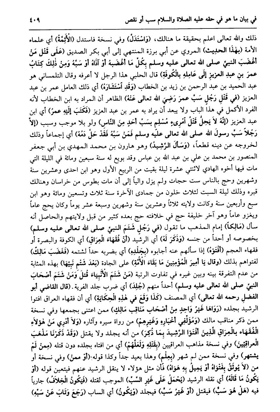ذلك والله تعالى اعلم بحقيقة ما هنالك، (واستدلّ) وفي نسخة فاستدل (الأئمة) أي علماء الأمة (بهذا الحديث) المروي عن أبي برزة المنتهي إلى أبي بكر الصديق (عَلَى قَتْلِ مَنْ أَغْضَبَ النَّبِيَّ صَلَّى اللَّهُ تعالى عَلَيْهِ وَسَلَّمَ بِكُلِّ مَا أَغْضَبَهُ أَوْ أَذَاهُ أَوْ سَبَّهُ وَمِنْ ذَلِكَ كِتَابُ عُمَرَ بْنِ عبد العزيز إلى عامله بالكوفة) قال الحلبي هذا الرجل لا أعرفه وقال التلمساني هو عبد الحميد بن عبد الرحمن بن زيد بن الخطاب (وقد استشاره) أي ذلك العامل عمر بن عبد العزيز (فِي قَتْلِ رَجُلٍ سَبَّ عُمَرَ رَضِيَ اللَّهُ تعالى عنه) الظاهر أن المراد به ابن الخطاب لأنه الفرد الأكمل في هذا الباب ولا يبعد أن يراد به عمر بن عبد العزيز (فكتب إليه عمر) أي ابن عبد العزيز (إنّه لا يحلّ قتل امرىء مسلم بسبّ أحد من النّاس) ولو بلا موجب وسبب (إِلَّا رَجُلًا سَبَّ رَسُولَ اللَّهِ صَلَّى اللَّهُ تعالى عَلَيْهِ وَسَلَّمَ فَمَنْ سَبَّهُ فَقَدْ حَلَّ دَمُهُ) أي إجماعا وذلك لخروجه عن دينه قطعا، (وسأل الرّشيد) وهو هارون بن محمد المهدي بن أبي جعفر المنصور بن محمد بن علي بن عبد الله بن عباس وقد بويع له سنة سبعين ومائة في الليلة التي مات فيها أخوه الهادي لاثنتي عشرة ليلة بقيت من الربيع الأول وهو ابن احدى وعشرين سنة وشهرين وحج بالناس ست حجات ولم يزل واليا إلى أن مات بطوس من خراسان وهنالك قبره وذلك ليلة السبت لثلاث خلون من جمادى الآخرة سنة ثلاث وتسعين ومائة وهو ابن سبع وأربعين سنة وكانت ولايته ثلاثا وعشرين سنة وشهرين وسبعة عشر يوما وكان يحج عاما ويغزو عاما وهو آخر خليفة حج في خلافته حج بعده كثير من قبل ولايتهم والحاصل أنه سأل (مالكا) إمام المذهب ما تقول (في رجل شتم النبيّ صلى الله تعالى عليه وسلم) بخصوصه أو أحدا من جنسه (وذكر له) أي الرشيد (أنّ فقهاء العراق) أي الكوفة والبصرة أو فقهاء العجم (أفتوه) إذا سألهم عنه أجابوه (بجلده) أي بضربه حدا لشتمه (فغضب مالك) لفتواهم بذلك (وَقَالَ يَا أَمِيرَ الْمُؤْمِنِينَ مَا بَقَاءُ الْأُمَّةِ) على الجادة (بعد شتم نبيّها) بهذه المثابة من عدم التفرقة بينه وبين غيره في تفاوت الرتبة (مَنْ شَتَمَ الْأَنْبِيَاءَ قُتِلَ وَمَنْ شَتَمَ أَصْحَابَ النبيّ صلى الله تعالى عليه وسلم) أحدا منهم (جلد) أي ضرب جلد الفرية. (قال القاضي أبو الفضل رحمه الله تعالى) أي المصنف (كذا وقع في هذه الحكاية) أي أن فقهاء العراق افتوا الرشيد بجلده (رَوَاهَا غَيْرُ وَاحِدٍ مِنْ أَصْحَابِ مَنَاقِبِ مَالِكٍ) ممن اعتنى بجمعها وفي نسخة ممن ذكر مناقب مالك (ومؤلّفي أخباره وغيرهم) من رواة سيره وآثاره (وَلَا أَدْرِي مَنْ هَؤُلَاءِ الْفُقَهَاءُ بِالْعِرَاقِ الَّذِينَ أفتوا الرّشيد بما ذكر) من أنه يجلد ولا يقتل (وقد ذكرنا مذهب العراقيّين) وفي نسخة مذاهب العراقيين (بقتله ولعلّهم) أي من افتاه بجلده دون قتله (ممن لم يشتهر) وفي نسخة ممن لم شهر (بعلم) وهذا بعيد جدا وكذا قوله (أو ممن) وفي نسخة أَوْ مَنْ (لَا يُوثَقُ بِفَتْوَاهُ أَوْ يَمِيلُ به هواه) فأن مثل هؤلاء لا ينقل الرشيد عنهم فيتعين قوله (أو يكون ما قاله) أي نقله الرشيد (يحمل على غير السّبّ) الموجب لقتله (فيكون الخلاف) جاريا فيه (هل هو سبّ) فيقتل (أو غير سبّ) فيجلد (ويكون) أي الساب (رجع وتاب عن سبّه)