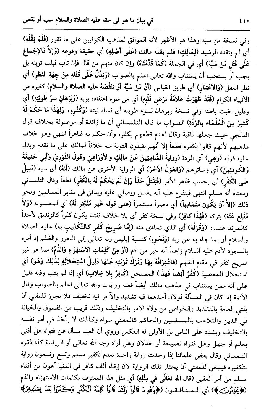 وفي نسخة من سبه وهذا هو الأظهر لأنه الموافق لمذهب الكوفيين على ما تقرر (فلم يقله) أي لم ينقله الرشيد (لمالك) فلم يقله مالك (على أصله) أي حقيقة وقوعه (وإلّا فالإجماع على قتل من سبّه) أي في الجملة (كما قدّمناه) وإن كان منهم من قال فإن تاب قبلت توبته بل يجب أو يستحب أن يستتاب والله تعالى اعلم بالصواب (ويدلّ على قتله من جهة النّظر) أي نظر العقل (والاعتبار) أي طريق القياس (أنّ من سبّه أو تنقّصه عليه الصلاة والسلام) كغيره من الأنبياء الكرام (فقد ظهرت علامة مرض قلبه) أي من سوء اعتقاده بربه (وبرهان سرّ طويّته) أي ودليل خبث باطنه وفي نسخة وبرهان لسوء طويته أي فساد نيته (وَكُفْرِهِ، وَلِهَذَا مَا حَكَمَ لَهُ كَثِيرٌ مِنَ العلماء بالرّدّة) الصواب ما قاله التلمساني أن ما زائدة أو موصولة بخلاف قول الدلجي حيث جعلها ناقية وقال لعدم قطعهم بكفره وأن حكم به ظاهرا انتهى وهو خلاف مذهبهم لأنهم قالوا بكفره قطعا إلا أنهم يقبلون التوبة منه خلافا لمالك على ما تقدم ويدل عليه قوله (وهي) أي الردة (رِوَايَةُ الشَّامِيِّينَ عَنْ مَالِكٍ وَالْأَوْزَاعِيِّ وَقَوْلُ الثَّوْرِيِّ وأبي حنيفة والكوفيّين) أي وسائرهم (والقول الآخر) أي الرواية الأخرى عن مالك (أنه) أي سبه (دليل على الكفر) أي بحسب ظاهر الأمر (فَيُقْتَلُ حَدًّا وَإِنْ لَمْ يُحْكَمْ لَهُ بِالْكُفْرِ) قطعا وقال التلمساني ومعناه أنه مسلم انتهى فيتفرع عليه أنه يغسل ويصلي عليه ويدفن في مقابر المسلمين ونحو ذلك (إلّا أن يكون متماديا) أي مصرا مستمرا (على قوله غير منكر له) أي لمضمونه (ولا مقلع عنه) بتركه (فهذا كافر) وفي نسخة كفر أي بلا خلاف فقتله يكون كفرا كالزنديق لأحدا كالمرتد عنده، (وقوله) أي الذي تمادى منه (إمّا صريح كفر كالتّكذيب به) عليه الصلاة والسلام أو بما جاء به عن ربه (ونحوه) كنسبة إبليس ربه تعالى إلى الجور والظلم إذ أمره بالسجود لآدم عليه السلام زاعما أنه خير من آدم (أو من كلمات الاستهزاء والذّمّ) مما هو غير صريح كفر في مقام الفهم (فَاعْتِرَافُهُ بِهَا وَتَرْكُ تَوْبَتِهِ عَنْهَا دَلِيلُ اسْتِحْلَالِهِ لذلك وهو) أي استحلال المعصية (كفر أيضا فهذا) المستحل (كافر بلا خلاف) أي إذا لم يتب وفيه دليل على أنه ممن يستتاب في مذهب مالك أيضا فعنه روايات والله تعالى اعلم بالصواب وقال الأئمة إذا كان في المسألة قولان أحدهما فيه تشديد والآخر فيه تخفيف فلا يجوز للمفتي أن يفتي العامة بالتشديد والخواص من ولاة الأمر بالتخفيف وذلك قريب من الفسوق والخيانة في الدين والتلاعب بالمسلمين والحاكم كالمفتي سواء وكذلك لا يأخذ في أمر نفسه بالتخفيف ويشدد على الناس بل الأولى له العكس وروي أن العبد يسأل عن فتواه هل أفتى بعلم أو جهل وهل فتواه نصيحة أو خذلان وهل أراد وجه الله تعالى أو الرياسة كذا ذكره التلمساني وقال بعض علمائنا إذا وجدت رواية واحدة بعدم تكفير مسلم وتسع وتسعون رواية بتكفيره فينبغي للمفتي أن يختار تلك الرواية لأن إبقاء ألف كافر في الدنيا أهون من أفناء مسلم من أمر العقبى (قال الله تعالى في مثله) أي مثل هذا المعترف بكلمات الاستهزاء والذم (يَحْلِفُونَ) أي المنافقون (بِاللَّهِ مَا قالُوا وَلَقَدْ قالُوا كَلِمَةَ الْكُفْرِ وَكَفَرُوا بَعْدَ إِسْلامِهِمْ