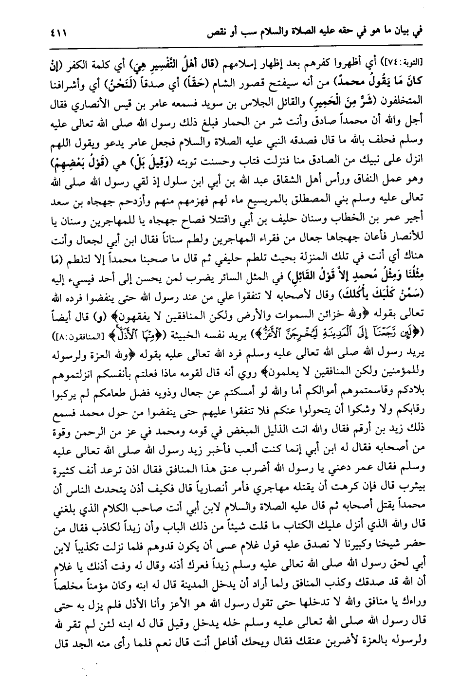 [التوبة: 74] ) أي أظهروا كفرهم بعد إظهار إسلامهم (قال أهل التّفسير هي) أي كلمة الكفر (إن كان ما يقول محمد) من أنه سيفتح قصور الشام (حقّا) أي صدقا (لنحن) أي وأشرافنا المتخلفون (شرّ من الحمير) والقائل الجلاس بن سويد فسمعه عامر بن قيس الأنصاري فقال أجل والله أن محمدا صادق وأنت شر من الحمار فبلغ ذلك رسول الله صلى الله تعالى عليه وسلم فحلف بالله ما قال فصدقه النبي عليه الصلاة والسلام فجعل عامر يدعو ويقول اللهم انزل على نبيك من الصادق منا فنزلت فتاب وحسنت توبته (وقيل بل) هي (قول بعضهم) وهو عمل النفاق ورأس أهل الشقاق عبد الله بن أبي ابن سلول إذ لقي رسول الله صلى الله تعالى عليه وسلم بني المصطلق بالمريسيع ماء لهم فهزمهم منهم وأزدحم جهجاه بن سعد أجير عمر بن الخطاب وسنان حليف بن أبي واقتتلا فصاح جهجاه يا للمهاجرين وسنان يا للأنصار فأعان جهجاها جعال من فقراء المهاجرين ولطم سنانا فقال ابن أبي لجعال وأنت هناك أي أنت في تلك المنزلة بحيث تلطم حليفي ثم قال ما صحبنا محمدا إلا لتلطم (مَا مِثْلُنَا وَمِثْلُ مُحَمَّدٍ إِلَّا قَوْلُ الْقَائِلِ) في المثل السائر يضرب لمن يحسن إلى أحد فيسيء إليه (سمّن كلبك يأكلك) وقال لأصحابه لا تنفقوا علي من عند رسول الله حتى ينفضوا فرده الله تعالى بقوله وَلِلَّهِ خَزائِنُ السَّماواتِ وَالْأَرْضِ وَلكِنَّ الْمُنافِقِينَ لا يَفْقَهُونَ (و) قال أيضا (لَئِنْ رَجَعْنا إِلَى الْمَدِينَةِ لَيُخْرِجَنَّ الْأَعَزُّ) يريد نفسه الخبيثة (مِنْهَا الْأَذَلَّ [المنافقون: 8] ) يريد رسول الله صلى الله تعالى عليه وسلم فرد الله تعالى عليه بقوله وَلِلَّهِ الْعِزَّةُ وَلِرَسُولِهِ وَلِلْمُؤْمِنِينَ وَلكِنَّ الْمُنافِقِينَ لا يَعْلَمُونَ روي أنه قال لقومه ماذا فعلتم بأنفسكم انزلتموهم بلادكم وقاسمتموهم أموالكم أما والله لو أمسكتم عن جعال وذويه فضل طعامكم لم يركبوا رقابكم ولا وشكوا أن يتحولوا عنكم فلا تنفقوا عليهم حتى ينفضوا من حول محمد فسمع ذلك زيد بن أرقم فقال والله انت الذليل المبغض في قومه ومحمد في عز من الرحمن وقوة من أصحابه فقال له ابن أبي إنما كنت ألعب فأخبر زيد رسول الله صلى الله تعالى عليه وسلم فقال عمر دعني يا رسول الله أضرب عنق هذا المنافق فقال اذن ترعد أنف كثيرة بيثرب قال فإن كرهت أن يقتله مهاجري فأمر أنصاريا قال فكيف أذن يتحدث الناس أن محمدا يقتل أصحابه ثم قال عليه الصلاة والسلام لابن أبي أنت صاحب الكلام الذي بلغني قال والله الذي أنزل عليك الكتاب ما قلت شيئا من ذلك الباب وأن زيدا لكاذب فقال من حضر شيخنا وكبيرنا لا نصدق عليه قول غلام عسى أن يكون قدوهم فلما نزلت تكذيبا لابن أبي لحق رسول الله صلى الله تعالى عليه وسلم زيدا فعرك أذنه وقال له وفت أذنك يا غلام أن الله قد صدقك وكذب المنافق ولما أراد أن يدخل المدينة قال له ابنه وكان مؤمنا مخلصا وراءك يا منافق والله لا تدخلها حتى تقول رسول الله هو الأعز وأنا الأذل فلم يزل به حتى قال رسول الله صلى الله تعالى عليه وسلم خله يدخل وقيل قال له ابنه لئن لم تقر لله ولرسوله بالعزة لأضربن عنقك فقال ويحك أفاعل أنت قال نعم فلما رأى منه الجد قال