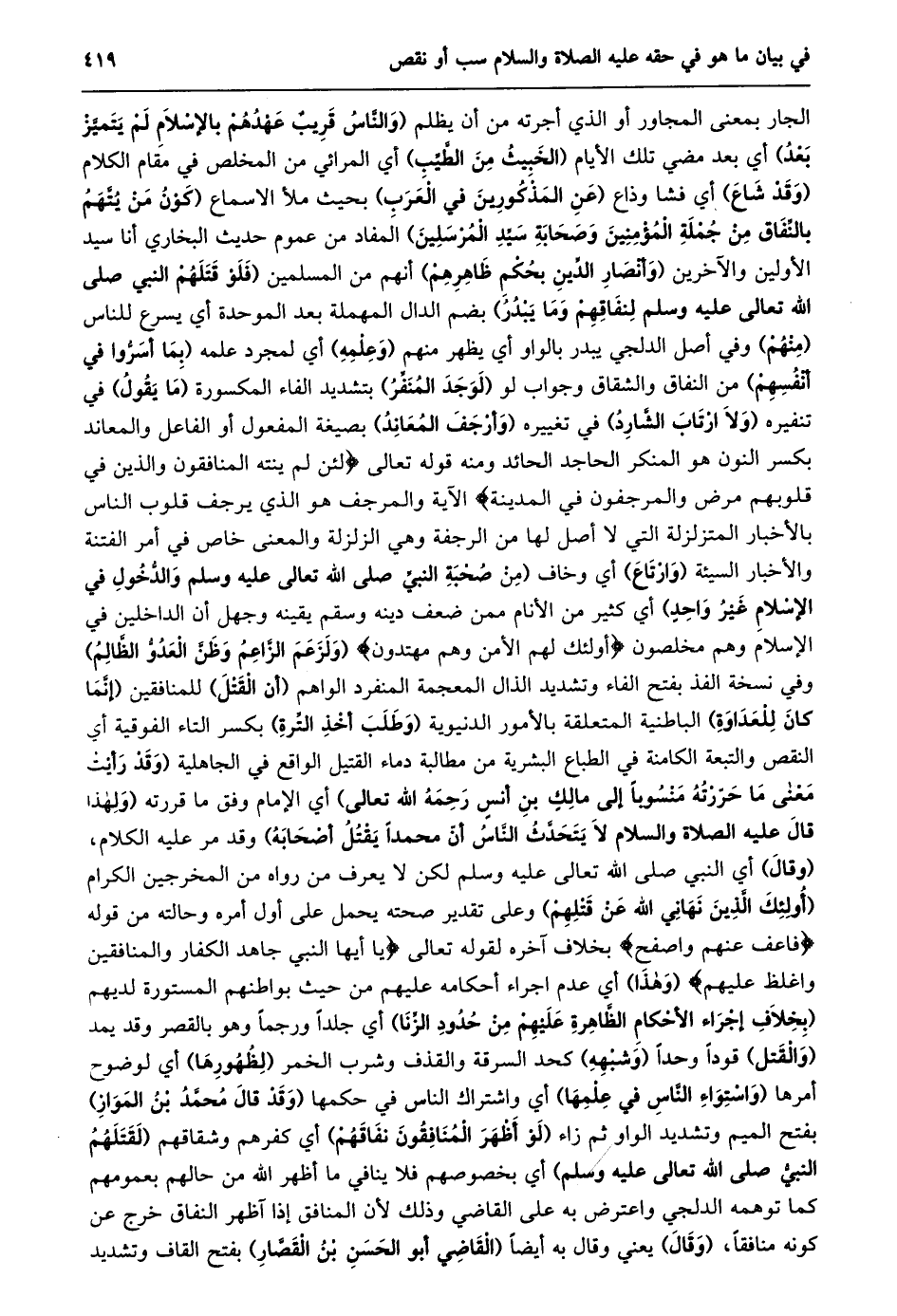 الجار بمعنى المجاور أو الذي أجرته من أن يظلم (والنّاس قريب عهدهم بالإسلام لم يتميّز بعد) أي بعد مضي تلك الأيام (الخبيث من الطّيب) أي المرائي من المخلص في مقام الكلام (وقد شاع) أي فشا وذاع (عن المذكورين في العرب) بحيث ملأ الاسماع (كَوْنُ مَنْ يُتَّهَمُ بِالنِّفَاقِ مِنْ جُمْلَةِ الْمُؤْمِنِينَ وصحابة سيّد المرسلين) المفاد من عموم حديث البخاري أنا سيد الأولين والآخرين (وأنصار الدّين بحكم ظاهرهم) أنهم من المسلمين (فلو قتلهم النبي صلى الله تعالى عليه وسلم لنفاقهم وما يبدر) بضم الدال المهملة بعد الموحدة أي يسرع للناس (منهم) وفي أصل الدلجي يبدر بالواو أي يظهر منهم (وعلمه) أي لمجرد علمه (بما أسرّوا في أنفسهم) من النفاق والشقاق وجواب لو (لوجد المنفّر) بتشديد الفاء المسكورة (ما يقول) في تنفيره (ولا ارتاب الشّارد) في تغييره (وأرجف المعاند) بصيغة المفعول أو الفاعل والمعاند بكسر النون هو المنكر الحاجد الحائد ومنه قَوْلِهِ تَعَالَى لَئِنْ لَمْ يَنْتَهِ الْمُنافِقُونَ وَالَّذِينَ فِي قُلُوبِهِمْ مَرَضٌ وَالْمُرْجِفُونَ فِي الْمَدِينَةِ الآية والمرجف هو الذي يرجف قلوب الناس بالأخبار المتزلزلة التي لا أصل لها من الرجفة وهي الزلزلة والمعنى خاص في أمر الفتنة والأخبار السيئة (وارتاع) أي وخاف (من صحبة النبيّ صلى الله تعالى عَلَيْهِ وَسَلَّمَ وَالدُّخُولِ فِي الْإِسْلَامِ غَيْرُ وَاحِدٍ) أي كثير من الأنام ممن ضعف دينه وسقم يقينه وجهل أن الداخلين في الإسلام وهم مخلصون أُولئِكَ لَهُمُ الْأَمْنُ وَهُمْ مُهْتَدُونَ (ولزعم الزّاعم وظنّ العدوّ الظّالم) وفي نسخة الفذ بفتح الفاء وتشديد الذال المعجمة المنفرد الواهم (أن القتل) للمنافقين (إنّما كان للعداوة) الباطنية المتعلقة بالأمور الدنيوية (وطلب أخذ التّرة) بكسر التاء الفوقية أي النقص والتبعة الكامنة في الطباع البشرية من مطالبة دماء القتيل الواقع في الجاهلية (وَقَدْ رَأَيْتُ مَعْنَى مَا حَرَّرْتُهُ مَنْسُوبًا إِلَى مالك بن أنس رحمه الله تعالى) أي الإمام وفق ما قررته (ولهذا قال عليه الصلاة والسلام لا يتحدث الناس أن محمدا يقتل أصحابه) وقد مر عليه الكلام، (وقال) أي النبي صلى الله تعالى عليه وسلم لكن لا يعرف من رواه من المخرجين الكرام (أولئك الّذين نهاني الله عن قتلهم) وعلى تقدير صحته يحمل على أول أمره وحالته من قوله فَاعْفُ عَنْهُمْ وَاصْفَحْ بخلاف آخره لقوله تعالى يا أَيُّهَا النَّبِيُّ جاهِدِ الْكُفَّارَ وَالْمُنافِقِينَ وَاغْلُظْ عَلَيْهِمْ (وهذا) أي عدم اجراء أحكامه عليهم من حيث بواطنهم المستورة لديهم (بِخِلَافِ إِجْرَاءِ الْأَحْكَامِ الظَّاهِرَةِ عَلَيْهِمْ مِنْ حُدُودِ الزّنا) أي جلدا ورجما وهو بالقصر وقد يمد (والقتل) قودا وحدا (وشبهه) كحد السرقة والقذف وشرب الخمر (لظهورها) أي لوضوح أمرها (واستواء النّاس في علمها) أي واشتراك الناس في حكمها (وقد قال محمّد بن المواز) بفتح الميم وتشديد الواو ثم زاء (لو أظهر المنافقون نفاقهم) أي كفرهم وشقاقهم (لقتلهم النبيّ صلى الله تعالى عليه وسلم) أي بخصوصهم فلا ينافي ما أظهر الله من حالهم بعمومهم كما توهمه الدلجي واعترض به على القاضي وذلك لأن المنافق إذا آظهر النفاق خرج عن كونه منافقا، (وقال) يعني وقال به أيضا (القاضي أبو الحسن بن القصّار) بفتح القاف وتشديد
