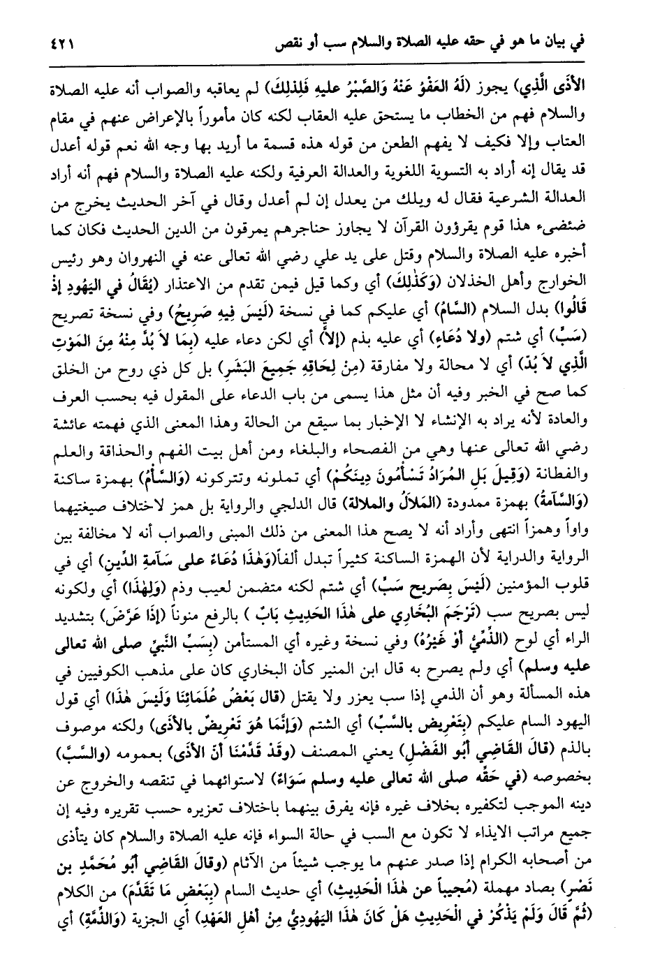 الأذى الّذي) يجوز (لَهُ الْعَفْوُ عَنْهُ وَالصَّبْرُ عَلَيْهِ فَلِذَلِكَ) لَمْ يعاقبه والصواب أنه عليه الصلاة والسلام فهم من الخطاب ما يستحق عليه العقاب لكنه كان مأمورا بالإعراض عنهم في مقام العتاب وإلا فكيف لا يفهم الطعن من قوله هذه قسمة ما أريد بها وجه الله نعم قوله أعدل قد يقال إنه أراد به التسوية اللغوية والعدالة العرفية ولكنه عليه الصلاة والسلام فهم أنه أراد العدالة الشرعية فقال له ويلك من يعدل إن لم أعدل وقال في آخر الحديث يخرج من ضئضىء هذا قوم يقرؤون القرآن لا يجاوز حناجرهم يمرقون من الدين الحديث فكان كما أخبره عليه الصلاة والسلام وقتل على يد علي رضي الله تعالى عنه في النهروان وهو رئيس الخوارج وأهل الخذلان (وكذلك) أي وكما قيل فيمن تقدم من الاعتذار (يقال في اليهود إذ قالوا) بدل السلام (السّام) أي عليكم كما في نسخة (ليس فيه صريح) وفي نسخة تصريح (سبّ) أي شتم (ولا دعاء) أي عليه بذم (إلّا) أي لكن دعاء عليه (بِمَا لَا بُدَّ مِنْهُ مِنَ الْمَوْتِ الَّذِي لا بدّ) أي لا محالة ولا مفارقة (من لحاقه جميع البشر) بل كل ذي روح من الخلق كما صح في الخبر وفيه أن مثل هذا يسمى من باب الدعاء على المقول فيه بحسب العرف والعادة لأنه يراد به الإنشاء لا الإخبار بما سيقع من الحالة وهذا المعنى الذي فهمته عائشة رضي الله تعالى عنها وهي من الفصحاء والبلغاء ومن أهل بيت الفهم والحذاقة والعلم والفطانة (وقيل بل المراد تسأمون دينكم) أي تملونه وتتركونه (والسّأم) بهمزة ساكنة (والسّامة) بهمزة ممدودة (الملال والملالة) قال الدلجي والرواية بل همز لاختلاف صيغتيهما واوا وهمزا انتهى وأراد أنه لا يصح هذا المعنى من ذلك المبنى والصواب أنه لا مخالفة بين الرواية والدراية لأن الهمزة الساكنة كثيرا تبدل ألفا (وهذا دعاء على سآمة الدّين) أي في قلوب المؤمنين (ليس بصريح سبّ) أي شتم لكنه متضمن لعيب وذم (ولهذا) أي ولكونه ليس بصريح سب (ترجم البخاري على هذا الحديث باب) بالرفع منونا (إذا عرّض) بتشديد الراء أي لوح (الذّميّ أو غيره) وفي نسخة وغيره أي المستأمن (بسببّ النّبيّ صلى الله تعالى عليه وسلم) أي ولم يصرح به قال ابن المنير كأن البخاري كان على مذهب الكوفيين في هذه المسألة وهو أن الذمي إذا سب يعزر ولا يقتل (قال بعض علمائنا وليس هذا) أي قول اليهود السام عليكم (بتعريض بالسّبّ) أي الشتم (وإنّما هو تعريض بالأذى) ولكنه موصوف بالذم (قال القاضي أبو الفضل) يعني المنصف (وقد قدّمنا أنّ الأذى) بعمومه (والسّبّ) بخصوصه (في حقّه صلى الله تعالى عليه وسلم سواء) لاستوائهما في تنقصه والخروج عن دينه الموجب لتكفيره بخلاف غيره فإنه يفرق بينهما باختلاف تعزيره حسب تقريره وفيه إن جميع مراتب الايذاء لا تكون مع السب في حالة السواء فإنه عليه الصلاة والسلام كان يتأذى من أصحابه الكرام إذا صدر عنهم ما يوجب شيئا من الآثام (وقال القاضي أبو محمّد بن نصر) بصاد مهملة (مجيبا عن هذا الحديث) أي حديث السام (ببعض ما تقدّم) من الكلام (ثُمَّ قَالَ وَلَمْ يَذْكُرْ فِي الْحَدِيثِ هَلْ كان هذا اليهوديّ من أهل العهد) أي الجزية (والذّمّة) أي