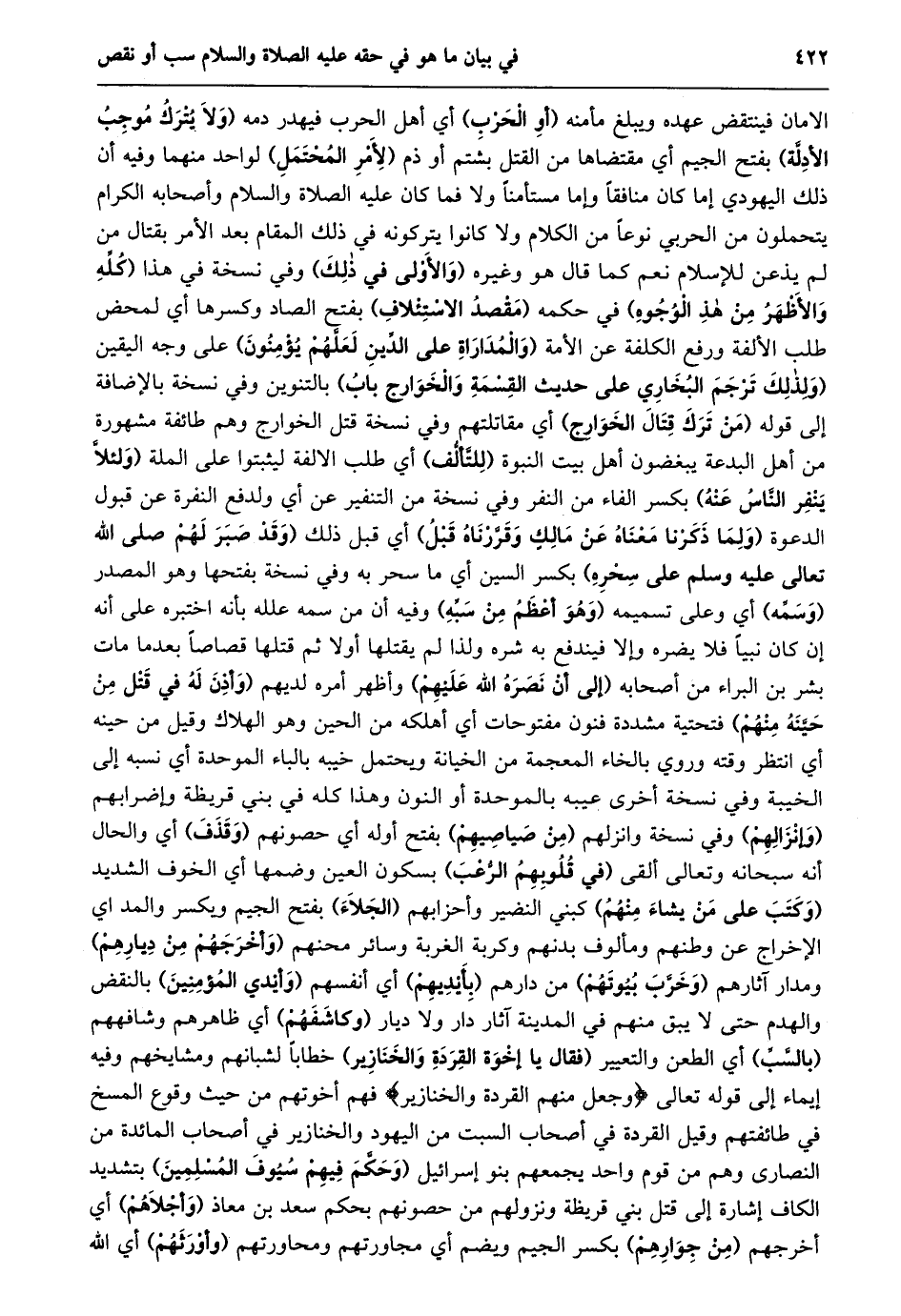 الامان فينتقض عهده ويبلغ مأمنه (أو الحرب) أي أهل الحرب فيهدر دمه (ولا يترك موجب الأدلة) بفتح الجيم أي مقتضاها من القتل بشتم أو ذم (لأمر المحتمل) لواحد منهما وفيه أن ذلك اليهودي إما كان منافقا وإما مستأمنا ولا فما كان عليه الصلاة والسلام وأصحابه الكرام يتحملون من الحربي نوعا من الكلام ولا كانوا يتركونه في ذلك المقام بعد الأمر بقتال من لم يذعن للإسلام نعم كما قال هو وغيره (والأولى في ذلك) وفي نسخة في هذا (كلّه والأظهر من هذه الوجوه) في حكمه (مقصد الاستئلاف) بفتح الصاد وكسرها أي لمحض طلب الألفة ورفع الكلفة عن الأمة (والمداراة على الدّين لعلّهم يؤمنون) على وجه اليقين (وَلِذَلِكَ تَرْجَمَ الْبُخَارِيُّ عَلَى حَدِيثِ الْقِسْمَةِ وَالْخَوَارِجِ باب) بالتنوين وفي نسخة بالإضافة إلى قوله (من ترك قتال الخوارج) أي مقاتلتهم وفي نسخة قتل الخوارج وهم طائفة مشهورة من أهل البدعة يبغضون أهل بيت النبوة (للتّألّف) أي طلب الالفة ليثبتوا على الملة (ولئلّا ينفر النّاس عنه) بكسر الفاء من النفر وفي نسخة من التنفير عن أي ولدفع النفرة عن قبول الدعوة (وَلِمَا ذَكَرْنَا مَعْنَاهُ عَنْ مَالِكٍ وَقَرَّرْنَاهُ قَبْلُ) أي قبل ذلك (وقد صبر لهم صلى الله تعالى عليه وسلم على سحره) بكسر السين أي ما سحر به وفي نسخة بفتحها وهو المصدر (وسمّه) أي وعلى تسميمه (وهو أعظم من سبّه) وفيه أن من سمه علله بأنه اختبره على أنه إن كان نبيا فلا يضره وإلا فيندفع به شره ولذا لم يقتلها أولا ثم قتلها قصاصا بعد ما مات بشر بن البراء من أصحابه (إلى أن نصره الله عليهم) وأظهر أمره لديهم (وَأَذِنَ لَهُ فِي قَتْلِ مَنْ حَيَّنَهُ مِنْهُمْ) فتحتية مشددة فنون مفتوحات أي أهلكه من الحين وهو الهلاك وقيل من حينه أي انتظر وقته وروي بالخاء المعجمة من الخيانة ويحتمل خيبه بالباء الموحدة أي نسبه إلى الخيبة وفي نسخة أخرى عيبه بالموحدة أو النون وهذا كله في بني قريظة وإضرابهم (وإنزالهم) وفي نسخة وانزلهم (من صياصيهم) بفتح أوله أي حصونهم (وقذف) أي والحال أنه سبحانه وتعالى ألقى (في قلوبهم الرّعب) بسكون العين وضمها أي الخوف الشديد (وكتب على من يشاء منهم) كبني النضير وأحزابهم (الجلاء) بفتح الجيم ويكسر والمد اي الإخراج عن وطنهم ومألوف بدنهم وكربة الغربة وسائر محنهم (وأخرجهم من ديارهم) ومدار آثارهم (وخرّب بيوتهم) من دارهم (بأيديهم) أي أنفسهم (وأيدي المؤمنين) بالنقض والهدم حتى لا يبق منهم في المدينة آثار دار ولا ديار (وكاشفهم) أي ظاهرهم وشافههم (بالسّبّ) أي الطعن والتعيير (فقال يا إخوة القردة والخنازير) خطابا لشبانهم ومشايخهم وفيه إيماء إلى قوله تعالى وَجَعَلَ مِنْهُمُ الْقِرَدَةَ وَالْخَنازِيرَ فهم أخوتهم من حيث وقوع المسخ في طائفتهم وقيل القردة في أصحاب السبت من اليهود والخنازير في أصحاب المائدة من النصارى وهم من قوم واحد يجمعهم بنو إسرائيل (وحكّم فيهم سيوف المسلمين) بتشديد الكاف إشارة إلى قتل بني قريظة ونزولهم من حصونهم بحكم سعد بن معاذ (وأجلاهم) أي أخرجهم (من جوارهم) بكسر الجيم ويضم أي مجاورتهم ومحاورتهم (وأورثهم) أي الله