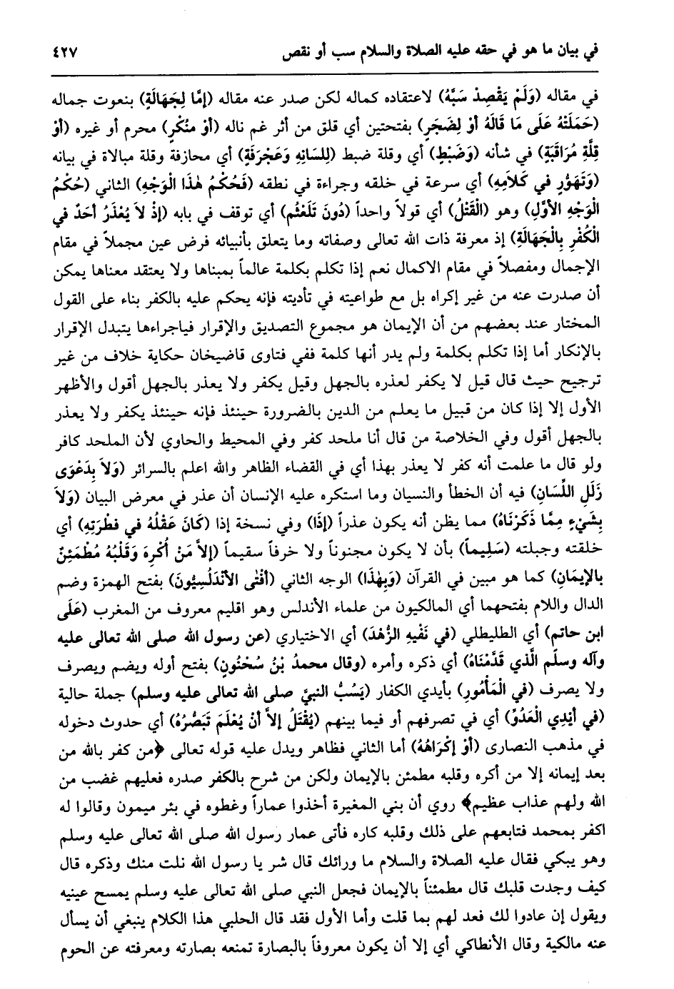 في مقاله (ولم يقصد سبّه) لاعتقاده كماله لكن صدر عنه مقاله (إمّا لجهالة) بنعوت جماله (حملته على ما قاله أو لضجر) بفتحتين أي قلق من أثر غم ناله (أو منكر) محرم أو غيره (أو قلّة مراقبة) في شأنه (وضبط) أي وقلة ضبط (للسانه وعجرفة) أي محازفة وقلة مبالاة في بيانه (وتهوّر في كلامه) أي سرعة في خلقه وجراءة في نطقه (فحكم هذا الوجه) الثاني (حكم الوجه الأوّل) وهو (القتل) أي قولا واحدا (دون تلعثم) أي توقف في بابه (إِذْ لَا يُعْذَرُ أَحَدٌ فِي الْكُفْرِ بِالْجَهَالَةِ) إذا معرفة ذات الله تعالى وصفاته وما يتعلق بأنبيائه فرض عين مجملا في مقام الإجمال ومفصلا في مقام الاكمال نعم إذا تكلم بكلمة عالما بمبناها ولا يعتقد معناها يمكن أن صدرت عنه من غير إكراه بل مع طواعيته في تأديته فإنه يحكم عليه بالكفر بناء على القول المختار عند بعضهم من أن الإيمان هو مجموع التصديق والإقرار فياجراءها يتبدل الإقرار بالإنكار أما إذا تكلم بكلمة ولم يدر أنها كلمة ففي فتاوى قاضيخان حكاية خلاف من غير ترجيح حيث قال قيل لا يكفر لعذره بالجهل وقيل يكفر ولا يعذر بالجهل أقول والأظهر الأول إلا إذا كان من قبيل ما يعلم من الدين بالضرورة حينئذ فإنه حينئذ يكفر ولا يعذر بالجهل أقول وفي الخلاصة من قال أنا ملحد كفر وفي المحيط والحاوي لأن الملحد كافر ولو قال ما علمت أنه كفر لا يعذر بهذا أي في القضاء الظاهر والله اعلم بالسرائر (ولا بدعوى زلل اللّسان) فيه أن الخطأ والنسيان وما استكره عليه الإنسان أن عذر في معرض البيان (ولا بشيء ممّا ذكرناه) مما يظن أنه يكون عذرا (إذا) وفي نسخة إذا (كان عقله في فطرته) أي خلقته وجبلته (سليما) بأن لا يكون مجنونا ولا خرفا سقيما (إلّا من أكره وقلبه مطمئن بالإيمان) كما هو مبين في القرآن (وبهذا) الوجه الثاني (أفتى الأندلسيّون) بفتح الهمزة وضم الدال واللام بفتحهما أي المالكيون من علماء الأندلس وهو اقليم معروف من المغرب (على ابن حاتم) أي الطليطلي (في نفيه الزّهد) أي الاختياري (عَنْ رَسُولِ اللَّهِ صَلَّى اللَّهُ تَعَالَى عَلَيْهِ وآله وسلّم الّذي قدّمناه) أي ذكره وأمره (وقال محمد بن سحنون) بفتح أوله ويضم ويصرف ولا يصرف (في المأمور) بأيدي الكفار (يسبّ النبيّ صلى الله تعالى عليه وسلم) جملة حالية (في أيدي العدوّ) أي في تصرفهم أو فيما بينهم (يقتل إلّا أن يعلم تبصّره) أي حدوث دخوله في مذهب النصارى (أو إكراهه) أما الثاني فظاهر ويدل عليه قوله تعالى مَنْ كَفَرَ بِاللَّهِ مِنْ بَعْدِ إِيمانِهِ إِلَّا مَنْ أُكْرِهَ وَقَلْبُهُ مُطْمَئِنٌّ بِالْإِيمانِ وَلكِنْ مَنْ شَرَحَ بِالْكُفْرِ صَدْراً فَعَلَيْهِمْ غَضَبٌ مِنَ اللَّهِ وَلَهُمْ عَذابٌ عَظِيمٌ روي أن بني المغيرة أخذوا عمارا وغطوه في بئر ميمون وقالوا له اكفر بمحمد فتابعهم على ذلك وقلبه كاره فأتى عمار رسول الله صلى الله تعالى عليه وسلم وهو يبكي فقال عليه الصلاة والسلام ما ورائك قال شر يا رسول الله نلت منك وذكره قال كيف وجدت قلبك قال مطمئنا بالإيمان فجعل النبي صلى الله تعالى عليه وسلم يمسح عينيه ويقول إن عادوا لك فعد لهم بما قلت وأما الأول فقد قال الحلبي هذا الكلام ينبغي أن يسأل عنه مالكية وقال الأنطاكي أي إلا أن يكون معروفا بالبصارة تمنعه بصارته ومعرفته عن الحوم