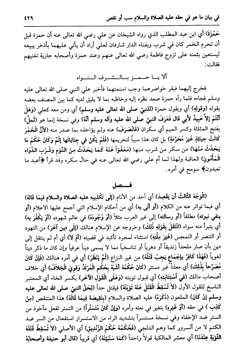 ألا يا حمز بالشرف النواء فخرج إليهما فبقر خواصرهما وجب اسنمتهما فأخبر علي النبي صلى الله تعالى عليه وسلم فجاءه فلما رآه حمزة صعد نظره إليه وخاطبه بما لا يليق لديه كما بين المصنف بعضه بقوله (وقوله) أي وبقول حمزة (للنبيّ صلى الله تعالى عليه وسلم) أي ومن معه كعلي (وَهَلْ أَنْتُمْ إِلَّا عَبِيدٌ لِأَبِي قَالَ فَعَرَفَ النبيّ صلى الله عليه وآله وسلم أنّه) وفي نسخة إنما هو (ثمل) بفتح المثلثة وكسر الميم أي سكران (فانصرف) عنه ولم يؤاخذه بما صدر منه (لأنّ الخمر كانت حينئذ غير محرّمة) بل كان هذا سببا لتحريمها (فَلَمْ يَكُنْ فِي جِنَايَاتِهَا إِثْمٌ وَكَانَ حُكْمُ ما يحدث منها) من سكر من شرب منها (مَعْفُوًّا عَنْهُ كَمَا يَحْدُثُ مِنَ النَّوْمِ وَشُرْبِ الدّواء المأمون) العاقبة ولهذا لما أم علي رضي الله تعالى عنه في حال سكره وقد قرأ أَعْبُدُ ما تَعْبُدُونَ سومح في أمره.