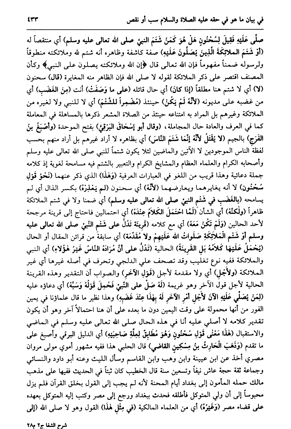 صَلَّى عَلَيْهِ فَقِيلَ لِسُحْنُونٍ هَلْ هُوَ كَمَنْ شتم النبيّ صلى الله تعالى عليه وسلم) أي منتقصا له (أو شتم الملائكة الّذين يصلّون عليه) صفة كاشفة وظاهره أنه شتم لله وملائكته منطوقا ولرسوله ضمنا مفهوما فإن الله تعالى قَالَ إِنَّ اللَّهَ وَمَلائِكَتَهُ يُصَلُّونَ عَلَى النَّبِيِّ وكأن المصنف اقتصر على ذكر الملائكة لقوله لا صلى الله فإن الظاهر منه المغايرة (قال) سحنون (لا) أي لا شتم هنا مطلقا (إذا كان) أي حال قائله (على ما وصفت) أنت (من الغضب) أي من غضبه على مديونه (لأنّه لم يكن) حينئذ (مضمرا للشّتم) أي لا للنبي ولا لغيره من الملائكة وغيرهم بل المراد به امتناعه حينئذ من الصلاة المشعر ذكرها بالمساهلة في المعاملة كما في العرف والعادة حال المجاملة، (وقال أبو إسحاق البرقيّ) بفتح الموحدة (وأصبغ بن الفرج) بالجيم (لا يقتل لأنّه إنّما شتم النّاس) أي بظاهره لا أراد غيرهم بل أراد منهم بحسب لفظة الناس الموجودين لا الآتين والماضين لئلا يكون شتما للنبي صلى الله تعالى عليه وسلم وأصحابه الكرام والعلماء العظام والمشايخ الكرام والتعبير بالشتم فيه مسامحة لغوية إذ كلامه جملة دعائية وهذا قريب من اللغو في العبارات العرفية (وهذا) الذي ذكر عنهما (نحو قول سحنون) لا أنه يغايرهما ويعارضهما (لأنّه) أي سحنون (لم يعذره) بكسر الذال أي لم يسامحه (بالغضب في شتم النبيّ صلى الله تعالى عليه وسلم) أي ضمنا ولا في شتم الملائكة ظاهرا (ولكنّه) أي الشأن (لمّا احتمل الكلام عنده) أي احتمالين فاحتاج إلى قرينة مرجحة لأحد الحالين (ولم تكن معه) أي مع كلامه (قَرِينَةٌ تَدُلُّ عَلَى شَتْمِ النَّبِيِّ صَلَّى اللَّهُ تعالى عَلَيْهِ وَسَلَّمَ أَوْ شَتْمِ الْمَلَائِكَةِ صَلَوَاتُ اللَّهِ عليهم ولا مقدّمة) أي سابقة من قرائن المقال أو الحال (يحمل عليها كلامه بل القرينة) الحالية (تَدُلُّ عَلَى أَنَّ مُرَادَهُ النَّاسُ غَيْرُ هَؤُلَاءِ) أي النبي والملائكة ففيه نوع تغليب وقد تصحف علي الدلجي وتحرف في أصله غيرها أي غير الملائكة (ولأجل) أي ولا مقدمة لأجل (قول الآخر) والصواب أن التقدير وهذه القرينة الحالية لأجل قول الآخر وهو غريمة (لَهُ صَلِّ عَلَى النَّبِيِّ فَحُمِلَ قَوْلُهُ وَسَبُّهُ) أي دعاؤه عليه (لِمَنْ يُصَلِّي عَلَيْهِ الْآنَ لِأَجْلِ أَمْرِ الْآخَرِ له بهذا عند غضبه) وهذا نظير ما قال علماؤنا في يمين الفور من أنها محمولة على وقت اليمين دون ما بعده على أن هنا احتمالا آخر وهو أن يكون تقدير كلامه لا أصلي عليه أنا في هذه الحال صلى الله تعالى عليه وسلم في الماضي والاستقبال (هَذَا مَعْنَى قَوْلِ سُحْنُونٍ وَهُوَ مُطَابِقٌ لِعِلَّةِ صاحبيه) أي الدليل البرقي وأصبغ على ما تقدم (وذهب الحارث بن مسكين القاضي) قال الحلبي هذا ففيه مشهور أموي مولى مروان مصري أخذ عن ابن عيينة وابن وهب وابن القاسم وسأل الليث وعنه أبو داود والنسائي وجماعة ثقة حجة عاش نيفا وتسعين سنة قال الخطيب كان ثبتا في الحديث ففيها على مذهب مالك حمله المأمون إلى بغداد أيام المحنة لأنه لم يجب إلى القول بخلق القرآن فلم يزل محبوسا إلى أن ولي المتوكل فأطلقه فحدث ببغداد ورجع إلى مصر وكتب إليه المتوكل بعهده على قضاء مصر (وغيره) أي من العلماء المالكية (في مثل هذا) القول وهو لا صلى الله (إلى