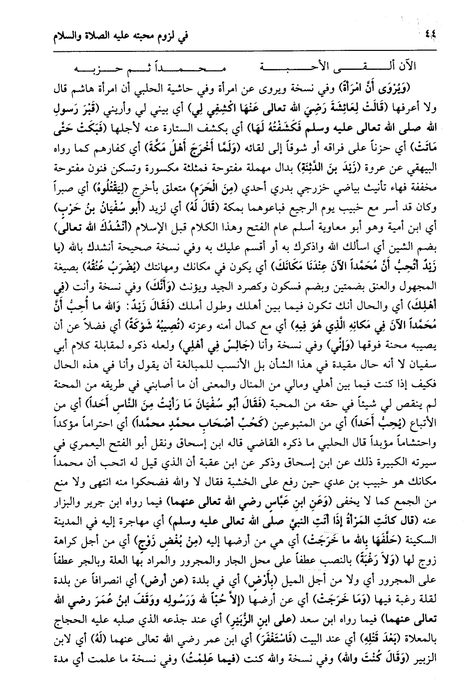 (ويروى أنّ امرأة) وفي نسخة ويروى عن امرأة وفي حاشية الحلبي أن امرأة هاشم قال ولا أعرفها (قالت لعائشة رضي الله تعالى عنها اكشفي لي) أي بيني لي وأريني (قبر رسول الله صلى الله تعالى عليه وسلم فكشفته لها) أي بكشف الستارة عنه لأجلها (فبكت حتّى ماتت) أي حزنا على فراقه أو شوقا إلى لقائه (ولمّا أخرج أهل مكّة) أي كفارهم كما رواه البيهقي عن عروة (زيد بن الدّثنة) بدال مهملة مفتوحة فمثلثة مكسورة وتسكن فنون مفتوحة مخففة فهاء تأنيث بياضي خزرجي بدري أحدي (من الحرم) متعلق بأخرج (ليقتلوه) أي صبرا وكان قد أسر مع خبيب يوم الرجيع فباعوهما بمكة (قال له) أي لزيد (أبو سفيان بن حرب) أي ابن أمية وهو أبو معاوية أسلم عام الفتح وهذا الكلام قبل الإسلام (أنشدك الله تعالى) بضم الشين أي اسألك الله واذكرك به أو أقسم عليك به وفي نسخة صحيحة أنشدك بالله (يَا زَيْدُ أَتُحِبُّ أَنَّ مُحَمَّدًا الْآنَ عِنْدَنَا مكانك) أي يكون في مكانك ومهانتك (يضرب عنقه) بصيغة المجهول والعنق بضمتين وبضم فسكون وكصرد الجيد ويؤنث (وأنّك) وفي نسخة وأنت (في أهلك) أي والحال أنك تكون فيما بين أهلك وطول أملك (فَقَالَ زَيْدٌ: وَاللَّهِ مَا أُحِبُّ أَنَّ مُحَمَّدًا الآن في مكانه الّذي هو فيه) أي مع كمال أمنه وعزته (تصيبه شوكة) أي فضلا عن أن يصيبه محنة فوقها (وإنّي) وفي نسخة وأنا (جالس في أهلي) ولعله ذكره لمقابلة كلام أبي سفيان لا أنه حال مقيدة في هذا الشأن بل الأنسب للمبالغة أن يقول وأنا في هذه الحال فكيف إذا كنت فيما بين أهلي ومالي من المنال والمعنى أن ما أصابني في طريقه من المحنة لم ينقص لي شيئا في حقه من المحبة (فَقَالَ أَبُو سُفْيَانَ مَا رَأَيْتُ مِنَ النَّاسِ أحدا) أي من الأتباع (يحبّ أحدا) أي من المتبوعين (كحبّ أصحاب محمّد محمّدا) أي احتراما مؤكدا واحتشاما مؤبدا قال الحلبي ما ذكره القاضي قاله ابن إسحاق ونقل أبو الفتح اليعمري في سيرته الكبيرة ذلك عن ابن إسحاق وذكر عن ابن عقبة أن الذي قيل له اتحب أن محمدا مكانك هو خبيب بن عدي حين رفع على الخشبة فقال لا والله فضحكوا منه انتهى ولا منع من الجمع كما لا يخفى (وعن ابن عبّاس رضي الله تعالى عنهما) فيما رواه ابن جرير والبزار عنه (قال كَانَتِ الْمَرْأَةُ إِذَا أَتَتِ النَّبِيَّ صَلَّى اللَّهُ تعالى عليه وسلم) أي مهاجرة إليه في المدينة السكينة (حلّفها بالله ما خرجت) أي هي من أرضها إليه (من بغض زوج) أي من أجل كراهة زوج لها (ولا رغبة) بالنصب عطفا على محل الجار والمجرور والمراد بها العلة وبالجر عطفا على المجرور أي ولا من أجل الميل (بأرض) أي في بلدة (عن أرض) أي انصرافا عن بلدة لقلة رغبة فيها (وما خرجت) أي عن أرضها (إِلَّا حُبًّا لِلَّهِ وَرَسُولِهِ وَوَقَفَ ابْنُ عُمَرَ رضي الله تعالى عنهما) فيما رواه ابن سعد (على ابن الزّبير) أي عند جذعه الذي صلبه عليه الحجاج بالمعلاة (بعد قتله) أي عند البيت (فاستغفر) أي ابن عمر رضي الله تعالى عنهما (له) أي لابن الزبير (وقال كنت والله) وفي نسخة والله كنت (فيما علمت) وفي نسخة ما علمت أي مدة