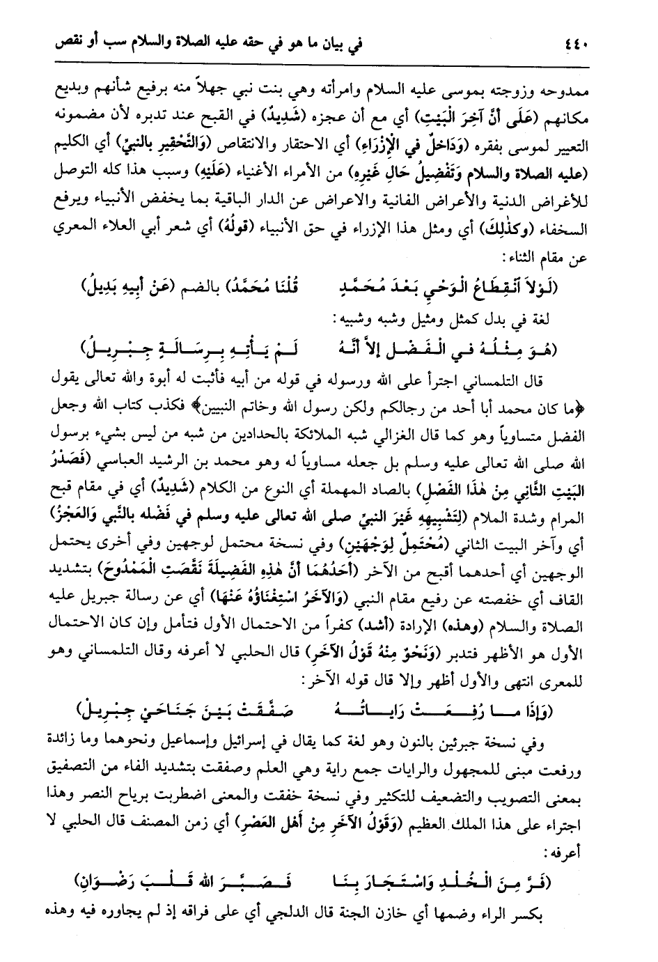 ممدوحه وزوجته بموسى عليه السلام وامرأته وهي بنت نبي جهلا منه برفيع شأنهم وبديع مكانهم (على أنّ آخر البيت) أي مع أن عجزه (شديد) في القبح عند تدبره لأن مضمونه التعيير لموسى بفقره (وداخل في الإزراء) أي الاحتقار والانتقاص (والتّحقير بالنبيّ) أي الكليم (عليه الصلاة والسلام وتفضيل حال غيره) من الأمراء الأغنياء (عليه) وسبب هذا كله التوصل للأغراض الدنية والأعراض الفانية والاعراض عن الدار الباقية بما يخفض الأنبياء ويرفع السخفاء (وكذلك) أي ومثل هذا الإزراء في حق الأنبياء (قوله) أي شعر أبي العلاء المعري عن مقام الثناء: