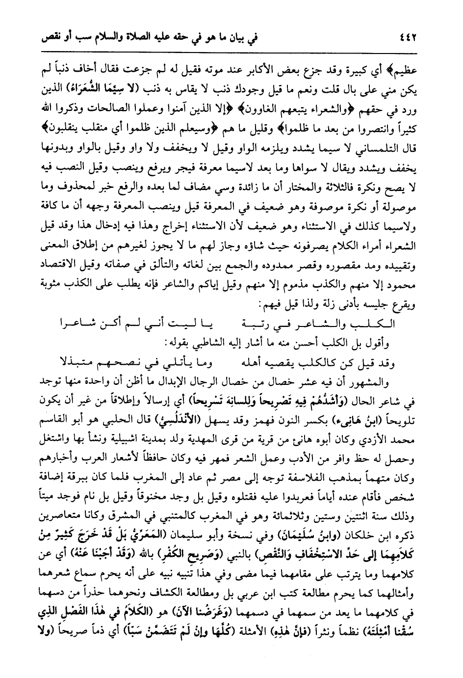 والمشهور أن فيه عشر خصال من خصال الرجال الإبدال ما أظن أن واحدة منها توجد في شاعر الحال (وأشدّهم فيه تصريحا وللسانه تسريحا) أي إرسالا وإطلاقا من غير أن يكون تلويحا (ابن هانىء) بكسر النون فهمز وقد يسهل (الأندلسيّ) قال الحلبي هو أبو القاسم محمد الأزدي وكان أبوه هانئ من قرية من قرى المهدية ولد بمدينة اشبيلية ونشأ بها واشتغل وحصل له حظ وافر من الأدب وعمل الشعر فهمر فيه وكان حافظا لأشعار العرب وأخبارهم وكان متهما بمذهب الفلاسفة توجه إلى مصر ثم عاد إلى المغرب فلما كان ببرقة إضافة شخص فأقام عنده أياما فعربدوا عليه فقتلوه وقيل بل وجد مخنوقا وقيل بل نام فوجد ميتا وذلك سنة اثنتين وستين وثلاثمائة وهو في المغرب كالمتنبي في المشرق وكانا متعاصرين ذكره ابن خلكان (وابن سليمان) وفي نسخة وأبو سُلَيْمَانَ (الْمَعَرِّيُّ بَلْ قَدْ خَرَجَ كَثِيرٌ مِنْ كلامهما إلى حدّ الاستخفاف والنّقص) بالنبي (وصريح الكفر) بالله (وقد أجبنا عنه) أي عن كلامهما وما يترتب على مقامهما فيما مضى وفي هذا تنبيه نبيه على أنه يحرم سماع شعرهما وأمثالهما كما يحرم مطالعة كتب ابن عربي بل ومطالعة الكشاف ونحوهما حذرا من دسهما في كلامهما ما يعد من سمهما في دسمهما (وغرضنا الآن) هو (الكلام في هذا الفصل الذي سقنا أمثلته) نظما ونثرا (فإنّ هذه) الأمثلة (كلّها وإن لم تتضمّن سبّا) أي ذما صريحا (ولا