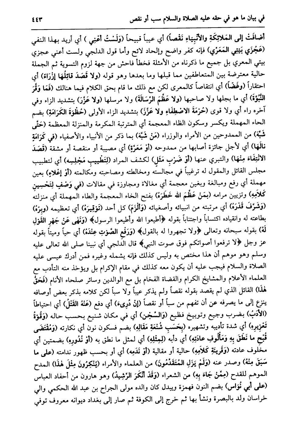 أضافت إلى الملائكة والأنبياء نقصا) أي عيبا قبيحا (ولست أعني) أي أريد بهذا النفي (عجزي بيتي المعرّي) فإنه كفر واضح وإلحاد لائح وأما قول الدلجي ولست أعني عجزي بيتي المعري بل جميع ما ذكرناه من الأمثلة فخطأ فاحش من جهة لزوم التسوية ثم الجملة حالية معترضة بين المتعاطفين مما قبلها وما بعدها وهو قوله (ولا قصد قائلها إزراء) أي احتقارا (وغضا) أي انتقاصا كالمعرى لكن مع ذلك ما قام بحق الكلام فيما هنالك (فما وقّر النّبوّة) أي ما بجلها ولا صاحبها (ولا عظّم الرّسالة) ولا مرسلها (ولا عزّر) بتشديد الزاء وفي آخره راء أي ولا قوى (حرمة الاصطفاء ولا عزّز) بتشديد الزاء الأولى (حظوة الكرامة) بضم الحاء المهملة ويكسر وسكون الظاء المعجمة أي المترتبة المكرمة والمنزلة المعظمة (حتّى شبّه) من الممدوحين من الأمراء والوزراء (من شبّه) بما ذكر من الأنبياء والأصفياء (في كرامة نالها) أي لأجل جائزة أصابها من ممدوحه (أو معرّة) أي مصيبة أو منقصة أو مشقة (قصد الانتفاء منها) والتبري عنها (أو ضرب مثل) لكشف المراد (لتطييب مجلسه) أي لتطبيب مجلس القائل والمقول له ترغيبا في مجالسته ومخالطته ومصاحبته ومكالمته (أو إعلاء) بعين مهملة أي رفع ومبالغة وبغين معجمة أي مغالاة ومجاوزة في مقالات (في وصف لتحسين كلامه) وتزيين مرامه (بمن عظّم الله خطره) بفتح الخاء المعجمة والطاء المهملة أي منزلته (وشرّف قدره) أي مرتبته من انبيائه وأصغيائه (وألزم) كل أحد (توقيره) أي تعظيمه (وبرّه) بطاعته له وانقياده اكتسابا واجتنابا بقوله أَطِيعُوا اللَّهَ وَأَطِيعُوا الرَّسُولَ (ونهى عن جهر القول له) بقوله سبحانه وتعالى وَلا تَجْهَرُوا لَهُ بِالْقَوْلِ (ورفع الصّوت عنده) أي حيا وميتا بقوله عز وجل لا تَرْفَعُوا أَصْواتَكُمْ فَوْقَ صَوْتِ النَّبِيِّ قال الدلجي أي نبينا صلى الله تعالى عليه وسلم وهو موهم أن هذا مختص به وليس كذلك فإنه يشمله وغيره فمن أدرك عيسى عليه الصلاة والسلام فيجب عليه أن يكون معه كذلك في مقام الإكرام بل ويؤخذ منه التأدب مع العلماء الأعلام والمشايخ الكرام والقضاة الفخام بل مع الوالدين وسائر صلحاء الأنام (فحقّ هذا) القائل الذي لم يقصد بقوله نقصا ولم يذكر عيبا ولا سبا لكن كلامه بذكر بعض أوصافه ينزع إلى ما يصرفه عن أن تفهم من سبا أو نقصا (إن درىء) أي دفع (عنه القتل) أي احتياطا (الأدب) بضرب وجيع وتوبيخ فظيع (والسّجن) أي في مكان شنيع بحسب حاله (وقوّة تعزيره) أي شدة تأديبه وتشهيره (بحسب شنعة مقاله) بضم فسكون نون أي نكارته (وَمُقْتَضَى قُبْحِ مَا نَطَقَ بِهِ وَمَأْلُوفِ عَادَتِهِ) أي دأبه (لمثله) أي لمثل ما نطق به (أو ندوره) بضمتين أي مخلوف عادته (وقرينة كلامه) حالية أو مقالية (أو ندمه) أي أو بحسب ظهور ندامته (على ما سبق منه) وصدر عنه (ولم يزل المتقدّمون) من العلماء والأمراء (ينكرون مثل هذا) المدح الموهم للقدح (ممّن جاء به) من الشعراء (وقد أنكر الرّشيد) وهو هارون من أحفاد العباس (على أبي نواس) بضم النون فهمزة ويبدل كان والده مولى الجراح بن عبد الله الحكمي والي خراسان ولد بالبصرة ونشأ بها ثم خرج إلى الكوفة ثم صار إلى بغداد ديوانه معروف توفي