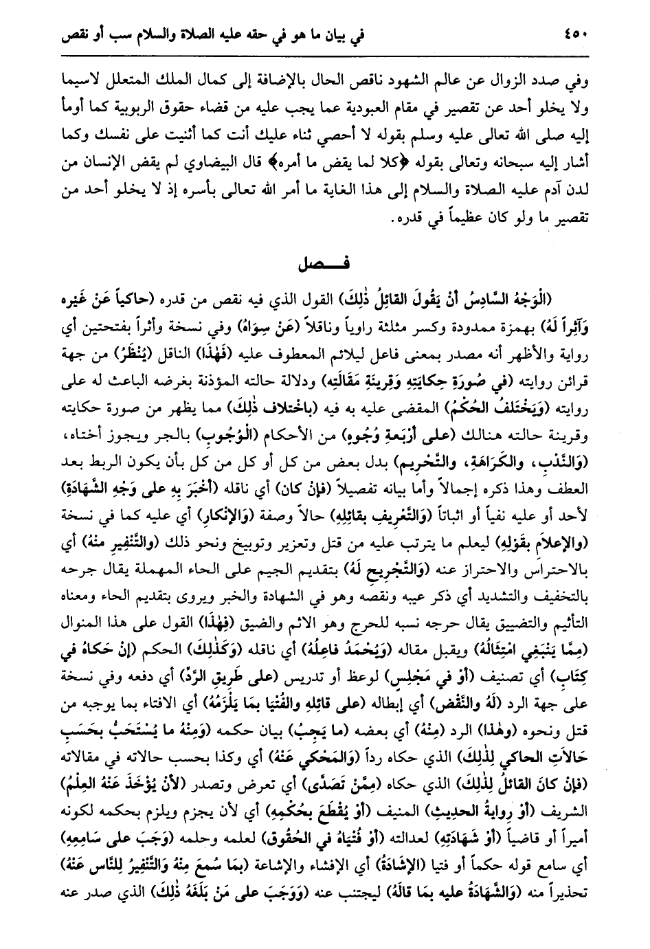 (الوجه السّادس أن يقول القائل ذلك) القول الذي فيه نقص من قدره (حاكيا عن غيره وآثرا له) بهمزة ممدودة وكسر مثلثة راويا وناقلا (عن سواه) وفي نسخة وأثرا بفتحتين أي رواية والأظهر أنه مصدر بمعنى فاعل ليلائم المعطوف عليه (فهذا) الناقل (ينظر) من جهة قرائن روايته (في صورة حكايته وقرينة مقالته) ودلالة حالته المؤذنة بغرضه الباعث له على روايته (ويختلف الحكم) المقضى عليه به فيه (باختلاف ذلك) مما يظهر من صورة حكايته وقرينة حالته هنالك (على أربعة وجوه) من الأحكام (الوجوب) بالجر ويجوز أختاه، (والنّدب، والكراهة، والتّحريم) بدل بعض من كل أو كل من كل بأن يكون الربط بعد العطف وهذا ذكره إجمالا وأما بيانه تفصيلا (فإن كان) أي ناقله (أخبر به على وجه الشّهادة) لأحد أو عليه نفيا أو اثباتا (والتّعريف بقائله) حالا وصفة (والإنكار) أي عليه كما في نسخة (والإعلام بقوله) ليعلم ما يترتب عليه من قتل وتعزير وتوبيخ ونحو ذلك (والتّنفير منه) أي بالاحتراس والاحتراز عنه (والتّجريح له) بتقديم الجيم على الحاء المهملة يقال جرحه بالتخفيف والتشديد أي ذكر عيبه ونقصه وهو في الشهادة والخبر ويروى بتقديم الحاء ومعناه التأثيم والتضييق يقال حرجه نسبه للحرج وهو الاثم والضيق (فهذا) القول على هذا المنوال (ممّا ينبغي امتثاله) ويقبل مقاله (ويحمد فاعله) أي ناقله (وكذلك) الحكم (إن حكاه في كتاب) أي تصنيف (أو في مجلس) لوعظ أو تدريس (على طريق الرّدّ) أي دفعه وفي نسخة على جهة الرد (له والنّقض) أي إبطاله (على قائله والفتيا بما يلزمه) أي الافتاء بما يوجبه من قتل ونحوه (وهذا) الرد (منه) أي بعضه (ما يجب) بيان حكمه (وَمِنْهُ مَا يُسْتَحَبُّ بِحَسَبِ حَالَاتِ الْحَاكِي لِذَلِكَ) الذي حكاه ردا (والمحكي عنه) أي وكذا بحسب حالاته في مقالاته (فإن كان القائل لذلك) الذي حكاه (ممّن تصدّى) أي تعرض وتصدر (لأن يؤخذ عنه العلم) الشريف (أو رواية الحديث) المنيف (أو يقطع بحكمه) أي لأن يجزم ويلزم بحكمه لكونه أميرا أو قاضيا (أو شهادته) لعدالته (أو فتياه في الحقوق) لعلمه وحلمه (وجب على سامعه) أي سامع قوله حكما أو فتيا (الإشادة) أي الإفشاء والإشاعة (بما سمع منه والتّنفير للنّاس عنه) تحذيرا منه (والشّهادة عليه بما قاله) ليجتنب عنه (ووجب على من بلغه ذلك) الذي صدر عنه
