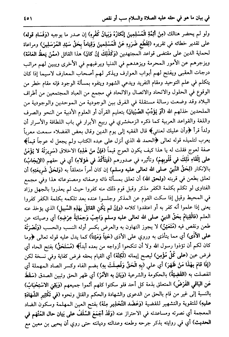 ولو لم يحضر هنالك (من أئمّة المسلمين إنكاره وبيان كفره) إن صدر ما يوجبه (وفساد قوله) على تقدير خطائه في تقريره (لِقَطْعِ ضَرَرِهِ عَنِ الْمُسْلِمِينَ وَقِيَامًا بِحَقِّ سَيِّدِ المرسلين) ومراعاة لحماية الدين على مقتضى قواعد المجتهدين (وكذلك إن كان) هذا القائل (ممّن يعظ العامّة) ويزجرهم عن الأمور المحرمة ويزهدهم في الدنيا ويرغبهم في الأخرى ويبين لهم مراتب درجات العقبى ويفتح لهم أبواب العوارف ويذكر لهم أصحاب المعارف لا سيما إذا كان يتكلم في علم التوحيد ومقام التفريد ويدعي الشهود ويتفوه بمسألة الوجود فإنه مقام خطر من الوقوع في الحلول والاتحاد والاتصال والالحاد في مجمع من العباد المجتمعين من أطراف البلاد وقد وضعت رسالة مستقلة في الفرق بين الوجودية من الموحدين والوجودية من الملحدين خذلهم الله (أو يؤدّب الصّبيان) بتعليم القرآن أو العلوم الأدبية من النحو والصرف واللغة والقواعد العربية كما ذكره الزمخشري في ربيع الأبرار في باب اللطافة والأسرار أن ولدا قرأ وَإِنَّ عَلَيْكَ لَعْنَتِي قال الفقيه إلى يوم الدين وقال بعض الفضلاء سمعت معربا يعرب لتلميذه قوله تعالى الْحَمْدُ لِلَّهِ الَّذِي أَنْزَلَ عَلى عَبْدِهِ الْكِتابَ وَلَمْ يَجْعَلْ لَهُ عِوَجاً قَيِّماً صفة لعوج فقلت له يا هذا كيف يكون العوج قيما (فإنّ من هذه) الاخلاق (سَرِيرَتُهُ لَا يُؤْمَنُ عَلَى إِلْقَاءِ ذَلِكَ فِي قلوبهم) وتأثيره في صدورهم (فيتأكّد في هؤلاء) أي في حقهم (الإيجاب) بالإنكار (لحقّ النّبيّ صلى الله تعالى عليه وسلم) إن كان أمرا متعلقا به (ولحقّ شريعته) أن تعلق بطعن في قربته (ولحق الله) أن تعلق بمسألة ذاته وصفاته ومصنوعاته هذا وفي مجمع الفتاوى لو تكلم بكلمة الكفر مذكر وقبل قوم ذلك منه كفروا حيث لم يعذروا بالجهل وزاد في المحيط وقيل إذا سكت القوم عن المذكر وجلسوا عنده بعد تلكمه بكلمة الكفر كفروا يعنى إذا علموا أنه كفر به أو اعتقدوا كلامه (وإن لم يكن القائل بهذه السّبيل) الذي يؤخذ عنه العلم (فالقيام بحقّ النبيّ صلى الله تعالى عليه وسلم واجب وحماية عرضه) أي وصيانته عن طعن ونقص فيه (متعيّن) لا يجوز التهاون به والعرض بكسر أوله النسب والحسب (ونصرته على الأذى) أي مما يتأذى به وروي على الأذى (حيّا وميّتا) كما يدل عليه قوله تَعَالَى وَما كانَ لَكُمْ أَنْ تُؤْذُوا رَسُولَ اللَّهِ وَلا أَنْ تَنْكِحُوا أَزْواجَهُ مِنْ بَعْدِهِ أَبَداً (مستحقّ) بفتح الحاء أي فرض عين (على كلّ مؤمن) ليصح إيمانه (لكنّه) أي القيام بحقه فرض كفاية وفي نسخة لكن (إذا قام بهذا من ظهر) أي علي (به الحقّ وفصلت به) بضم الفاء وكسر الصاد المهملة أي انفصلت به (القضيّة) بالحكومة والشرعية (وبان به الأمر) أي ظهر الحق وتبين الصدق (سقط عن الباقي الفرض) المتعلق بذمة كل أحد فلو سكتوا كلهم أثموا جميعهم (وبقي الاستحباب) بالنسبة إلى غير من قام بالحق من الدعوى والشهادة والحكم والقتل ونحوه (في تكثير الشّهادة عليه) للتقوية والتشهير للقضية (وعضد التّحذير منه) بفتح العين المهملة وسكون الضاد المعجمة أي نصرته ومساعدته في الاحتراز عنه (وَقَدْ أَجْمَعَ السَّلَفُ عَلَى بَيَانِ حَالِ الْمُتَّهَمِ في الحديث) أي في روايته بذكر جرحه وطعنه وعدالته وديانته حتى روي أن يحيى بن معين مع