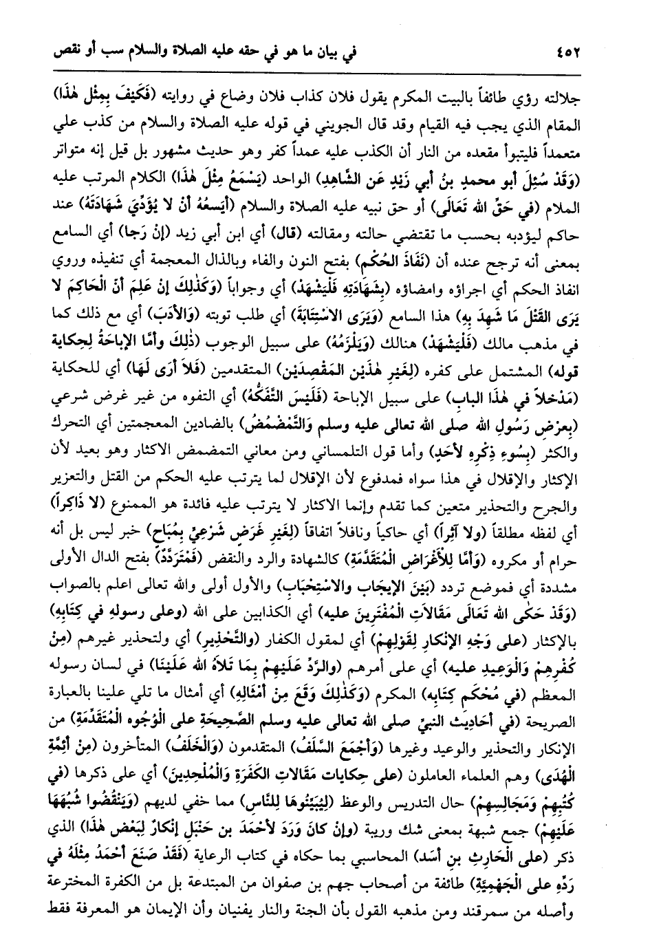 جلالته رؤي طائفا بالبيت المكرم يقول فلان كذاب فلان وضاع في روايته (فكيف بمثل هذا) المقام الذي يجب فيه القيام وقد قال الجويني في قوله عليه الصلاة والسلام من كذب علي متعمدا فليتبوأ مقعده من النار أن الكذب عليه عمدا كفر وهو حديث مشهور بل قيل إنه متواتر (وَقَدْ سُئِلَ أَبُو مُحَمَّدِ بْنُ أَبِي زَيْدٍ عن الشّاهد) الواحد (يسمع مثل هذا) الكلام المرتب عليه الملام (في حقّ الله تعالى) أو حق نبيه عليه الصلاة والسلام (أيسعه أن لا يؤدّي شهادته) عند حاكم ليؤدبه بحسب ما تقتضي حالته ومقالته (قال) أي ابن أبي زيد (إن رجا) أي السامع بمعنى أنه ترجح عنده أن (نفاذ الحكم) بفتح النون والفاء وبالذال المعجمة أي تنفيذه وروي انفاذ الحكم أي اجراؤه وامضاؤه (بشهادته فليشهد) أي وجوابا (وَكَذَلِكَ إِنْ عَلِمَ أَنَّ الْحَاكِمَ لَا يَرَى القتل ما شهد به) هذا السامع (ويرى الاستتابة) أي طلب توبته (والأدب) أي مع ذلك كما في مذهب مالك (فليشهد) هنالك (ويلزمه) على سبيل الوجوب (ذلك وأمّا الإباحة لحكاية قوله) المشتمل على كفره (لغير هذين المقصدين) المتقدمين (فلا أرى لها) أي للحكاية (مدخلا في هذا الباب) على سبيل الإباحة (فليس التّفكّه) أي التفوه من غير غرض شرعي (بعرض رسول الله صلى الله تعالى عليه وسلم والتّمضمض) بالضادين المعجمتين أي التحرك والكثر (بسوء ذكره لأحد) وأما قول التلمساني ومن معاني التمضمض الاكثار وهو بعيد لأن الإكثار والإقلال في هذا سواه فمدفوع لأن الإقلال لما يترتب عليه الحكم من القتل والتعزير والجرح والتحذير متعين كما تقدم وإنما الاكثار لا يترتب عليه فائدة هو الممنوع (لا ذاكرا) أي لفظه مطلقا (ولا آثرا) أي حاكيا ونافلا اتفاقا (لغير غرض شرعيّ بمباح) خبر ليس بل أنه حرام أو مكروه (وأمّا للأغراض المتقدّمة) كالشهادة والرد والنقض (فمتردّد) بفتح الدال الأولى مشددة أي فموضع تردد (بين الإيجاب والاستحباب) والأول أولى والله تعالى اعلم بالصواب (وَقَدْ حَكَى اللَّهُ تَعَالَى مَقَالَاتِ الْمُفْتَرِينَ عَلَيْهِ) أي الكذابين على الله (وعلى رسوله في كتابه) بالإكثار (على وجه الإنكار لقولهم) أي لمقول الكفار (والتّحذير) أي ولتحذير غيرهم (من كفرهم والوعيد عليه) أي على أمرهم (وَالرَّدِّ عَلَيْهِمْ بِمَا تَلَاهُ اللَّهُ عَلَيْنَا) فِي لسان رسوله المعظم (في محكم كتابه) المكرم (وكذلك وقع من أمثاله) أي أمثال ما تلي علينا بالعبارة الصريحة (في أحاديث النبيّ صلى الله تعالى عليه وسلم الصّحيحة على الوجوه المتقدّمة) من الإنكار والتحذير والوعيد وغيرها (وأجمع السّلف) المتقدمون (والخلف) المتأخرون (من أئمّة الهدى) وهم العلماء العاملون (على حكايات مقالات الكفرة والملحدين) أي على ذكرها (في كتبهم ومجالسهم) حال التدريس والوعظ (ليبيّنوها للنّاس) مما خفي لديهم (وينقضوا شبهها عليهم) جمع شبهة بمعنى شك وريبة (وَإِنْ كَانَ وَرَدَ لِأَحْمَدَ بْنِ حَنْبَلٍ إِنْكَارٌ لبعض هذا) الذي ذكر (على الحارث بن أسد) المحاسبي بما حكاه في كتاب الرعاية (فَقَدْ صَنَعَ أَحْمَدُ مِثْلَهُ فِي رَدِّهِ عَلَى الجهميّة) طائفة من أصحاب جهم بن صفوان من المبتدعة بل من الكفرة المخترعة وأصله من سمرقند ومن مذهبه القول بأن الجنة والنار يفنيان وأن الإيمان هو المعرفة فقط