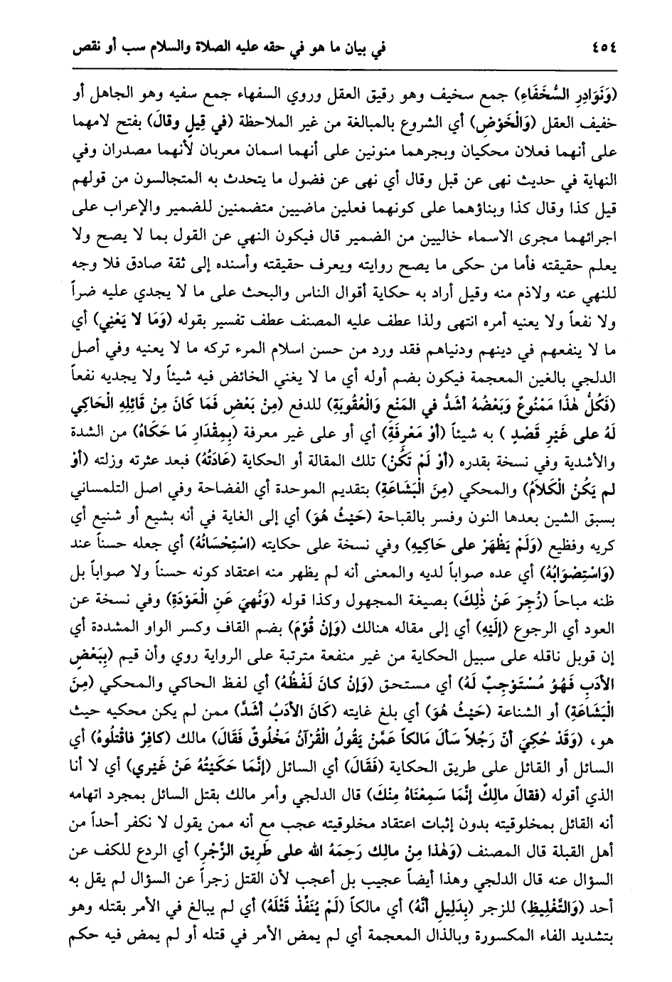 (ونوادر السّخفاء) جمع سخيف وهو رقيق العقل وروي السفهاء جمع سفيه وهو الجاهل أو خفيف العقل (والخوض) أي الشروع بالمبالغة من غير الملاحظة (في قيل وقال) بفتح لامهما على أنهما فعلان محكيان وبجرهما منونين على أنهما اسمان معربان لأنهما مصدران وفي النهاية في حديث نهى عن قبل وقال أي نهى عن فضول ما يتحدث به المتجالسون من قولهم قيل كذا وقال كذا وبناؤهما على كونهما فعلين ماضيين متضمنين للضمير والإعراب على اجرائهما مجرى الاسماء خاليين من الضمير قال فيكون النهي عن القول بما لا يصح ولا يعلم حقيقته فأما من حكى ما يصح روايته ويعرف حقيقته وأسنده إلى ثقة صادق فلا وجه للنهي عنه ولاذم منه وقيل أراد به حكاية أقوال الناس والبحث على ما لا يجدي عليه ضرا ولا نفعا ولا يعنيه أمره انتهى ولذا عطف عليه المصنف عطف تفسير بقوله (وما لا يعني) أي ما لا ينفعهم في دينهم ودنياهم فقد ورد من حسن اسلام المرء تركه ما لا يعنيه وفي أصل الدلجي بالغين المعجمة فيكون بضم أوله أي ما لا يغني الخائض فيه شيئا ولا يجديه نفعا (فَكُلُّ هَذَا مَمْنُوعٌ وَبَعْضُهُ أَشَدُّ فِي الْمَنْعِ والعقوبة) للدفع (مِنْ بَعْضٍ فَمَا كَانَ مِنْ قَائِلِهِ الْحَاكِي له على غير قصد) به شيئا (أو معرفة) أي أو على غير معرفة (بمقدار ما حكاه) من الشدة والأشدية وفي نسخة بقدره (أو لم تكن) تلك المقالة أو الحكاية (عادته) فبعد عثرته وزلته (أو لم يكن الكلام) والمحكي (من البشاعة) بتقديم الموحدة أي الفضاحة وفي اصل التلمساني بسبق الشين بعدها النون وفسر بالقباحة (حيث هو) أي إلى الغاية في أنه بشيع أو شنيع أي كريه وفظيع (ولم يظهر على حاكيه) وفي نسخة على حكايته (استحسانه) أي جعله حسنا عند (واستصوابه) أي عده صوابا لديه والمعنى أنه لم يظهر منه اعتقاد كونه حسنا ولا صوابا بل ظنه مباحا (زجر عن ذلك) بصيغة المجهول وكذا قوله (ونهي عن العودة) وفي نسخة عن العود أي الرجوع (إليه) أي إلى مقاله هنالك (وإن قوّم) بضم القاف وكسر الواو المشددة أي إن قوبل ناقله على سبيل الحكاية من غير منفعة مترتبة على الرواية روي وأن قيم (ببعض الأدب فهو مستوجب له) أي مستحق (وإن كان لفظه) أي لفظ الحاكي والمحكي (من البشاعة) أو الشناعة (حيث هو) أي بلغ غايته (كان الأدب أشدّ) ممن لم يكن محكيه حيث هو، (وَقَدْ حُكِيَ أَنَّ رَجُلًا سَأَلَ مَالِكًا عَمَّنْ يَقُولُ الْقُرْآنُ مَخْلُوقٌ فَقَالَ) مَالِكٌ (كَافِرٌ فَاقْتُلُوهُ) أي السائل أو القائل على طريق الحكاية (فقال) أي السائل (إنّما حكيته عن غيري) أي لا أنا الذي أقوله (فقال مالك إنّما سمعناه منك) قال الدلجي وأمر مالك بقتل السائل بمجرد اتهامه أنه القائل بمخلوقيته بدون إثبات اعتقاد مخلوقيته عجب مع أنه ممن يقول لا نكفر أحدا من أهل القبلة قال المصنف (وهذا من مالك رحمه الله على طريق الزّجر) أي الردع للكف عن السؤال عنه قال الدلجي وهذا أيضا عجيب بل أعجب لأن القتل زجرا عن السؤال لم يقل به أحد (والتّغليظ) للزجر (بدليل أنّه) أي مالكا (لم ينفّذ قتله) أي لم يبالغ في الأمر بقتله وهو بتشديد الفاء المسكورة وبالذال المعجمة أي لم يمض الأمر في قتله أو لم يمض فيه حكم