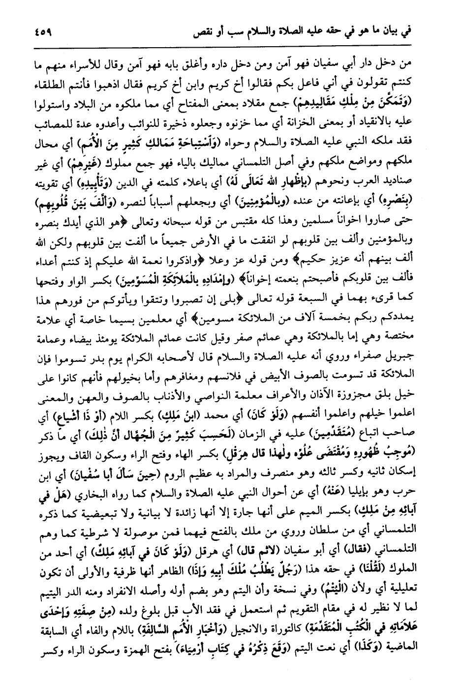 من دخل دار أبي سفيان فهو آمن ومن دخل داره وأغلق بابه فهو آمن وقال للأسراء منهم ما كنتم تقولون في أني فاعل بكم فقالوا أخ كريم وابن أخ كريم فقال اذهبوا فأنتم الطلقاء (وتمكّن من ملك مقاليدهم) جمع مقلاد بمعنى المفتاح أي مما ملكوه من البلاد واستولوا عليه بالانقياد أو بمعنى الخزانة أي مما خزنوه وجعلوه ذخيرة للنوائب وأعدوه عدة للمصائب فقد ملكه النبي عليه الصلاة والسلام وحواه (واستباحة ممالك كثير من الأمم) أي محال ملكهم ومواضع ملكهم وفي أصل التلمساني مماليك بالياء فهو جمع مملوك (غيرهم) أي غير صناديد العرب ونحوهم (بإظهار الله تعالى له) أي باعلاء كلمته في الدين (وتأييده) أي تقويته (بنصره) أي بإعانته من عنده (وبالمؤمنين) أي وبجعلهم أسبابا لنصره (وألّف بين قلوبهم) حتى صاروا اخوانا مسلمين وهذا كله مقتبس من قوله سبحانه وتعالى هُوَ الَّذِي أَيَّدَكَ بِنَصْرِهِ وَبِالْمُؤْمِنِينَ وَأَلَّفَ بَيْنَ قُلُوبِهِمْ لَوْ أَنْفَقْتَ ما فِي الْأَرْضِ جَمِيعاً ما أَلَّفْتَ بَيْنَ قُلُوبِهِمْ وَلكِنَّ اللَّهَ أَلَّفَ بَيْنَهُمْ إِنَّهُ عَزِيزٌ حَكِيمٌ ومن قوله عز وعلا وَاذْكُرُوا نِعْمَتَ اللَّهِ عَلَيْكُمْ إِذْ كُنْتُمْ أَعْداءً فَأَلَّفَ بَيْنَ قُلُوبِكُمْ فَأَصْبَحْتُمْ بِنِعْمَتِهِ إِخْواناً (وإمداده بالملائكة المسوّمين) بكسر الواو وفتحها كما قرىء بهما في السبعة قوله تعالى بَلى إِنْ تَصْبِرُوا وَتَتَّقُوا وَيَأْتُوكُمْ مِنْ فَوْرِهِمْ هذا يُمْدِدْكُمْ رَبُّكُمْ بِخَمْسَةِ آلافٍ مِنَ الْمَلائِكَةِ مُسَوِّمِينَ أي معلمين بسيما خاصة أي علامة مختصة وهي إما بالملائكة وهي عمائم صفر وقيل كانت عمائم الملائكة يومئذ بيضاء وعمامة جبريل صفراء وروي أنه عليه الصلاة والسلام قال لأصحابه الكرام يوم بدر تسوموا فإن الملائكة قد تسومت بالصوف الأبيض في فلانسهم ومغافرهم وأما بخيولهم فأنهم كانوا على خيل بلق مجزوزة الآذان والأعراف معلمة النواصي والأذناب بالصوف والعهن والمعنى اعلموا خيلهم واعلموا أنفسهم (ولو كان) أي محمد (ابن ملك) بكسر اللام (أو ذا أشياع) أي صاحب اتباع (متقدّمين) عليه في الزمان (لحسب كثير من الجهّال أنّ ذلك) أي ما ذكر (مُوجِبُ ظُهُورِهِ وَمُقْتَضَى عُلُوِّهِ وَلِهَذَا قَالَ هِرَقْلُ) بكسر الهاء وفتح الراء وسكون القاف ويجوز إسكان ثانيه وكسر ثالثه وهو منصرف والمراد به عظيم الروم (حين سأل أبا سفيان) أي ابن حرب وهو بإيليا (عنه) أي عن أحوال النبي عليه الصلاة والسلام كما رواه البخاري (هل في آبائه من ملك) بكسر الميم على أنها جارة إلا أنها زائدة لا بيانية ولا تبعيضية كما ذكره التلمساني أي من سلطان وروي من ملك بالفتح فيهما فمن موصولة لا شرطية كما وهم التلمساني (فقال) أي أبو سفيان (لاثم قال) أي هرقل (ولو كان في آبائه ملك) أي أحد من الملوك (لقلنا) في حقه هذا (رجل يطلب ملك أبيه وإذا) الظاهر أنها ظرفية والأولى أن تكون تعليلية أي ولأن (اليتم) وفي نسخة وأن اليتم وهو بضم أوله وأصله الانفراد ومنه الدر اليتيم لما لا نظير له في مقام التقويم ثم استعمل في فقد الأب قبل بلوغ ولده (مِنْ صِفَتِهِ وَإِحْدَى عَلَامَاتِهِ فِي الْكُتُبِ الْمُتَقَدِّمَةِ) كالتوراة والانجيل (وأخبار الأمم السّالفة) باللام والفاء أي السابقة الماضية (وكذا) أي نعت اليتم (وقع ذكره في كتاب أرمياء) بفتح الهمزة وسكون الراء وكسر