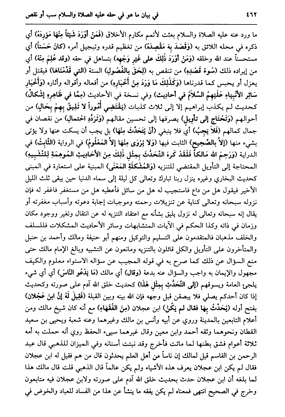 ما ورد عنه عليه الصلاة والسلام بعثت لأتمم مكارم الأخلاق (فمن أورد شيئا منها مورده) أي ذكره في محله اللائق به (وقصد به مقصده) من تعظيم قدره وتبجيل أمره (كان حسنا) أي مستحسنا عند الله وخلقه (ومن أورد ذلك على غير وجهه) بتساهل في حقه (وقد علم منه) أي من إيراده ذلك (سوء قصده) من تنقص به (لحق بالفصول) الستة (التي قدّمناها) فيقتل أو يعزل أو يحبس كما قدرناها (وكذلك ما ورد من أخباره) من أفعاله وأقواله وأثاره (وأخبار سائر الأنبياء عليهم السّلام في أحاديث) وفي نسخة في الأحاديث (ممّا في ظاهره إشكال) كحديث لم يكذب إبراهيم إلا إلى ثلاث كذبات (يقتضي أمورا لا تليق بهم بحال) من أحوالهم (وتحتاج إلى تأويل) يصرفها إلى تحسين مقالهم (وتردّد احتمال) من نقصان في جمال كمالهم (فلا يجب) أي فلا ينبغي (أن يتحدّث منها) بل يجب أن يسكت عنها ولا يؤتى بشيء منها (إلّا بالصّحيح) الثابت فيها (ولا يروى منها إلّا المعلوم) في الرواية (الثّابت) في الدراية (وَرَحِمَ اللَّهُ مَالِكًا فَلَقَدْ كَرِهَ التَّحَدُّثَ بِمِثْلِ ذلك من الأحاديث الموهمة للتّشبيه) المحتاجة إلى التأويل المقتضي للتنزيه (والمشكلة المعنى) المبنية على استعارة في المبنى كحديث البخاري وغيره ينزل ربنا تبارك وتعالى كل ليلة إلى سماء الدنيا حين يبقى ثلث الليل الأخير فيقول هل من داع فاستجيب له هل من سائل فأعطيه هل من مستغفر فاغفر له فإن نزوله سبحانه وتعالى كناية عن تنزيلات رحمته وموجبات إجابة دعوته وأسباب مغفرته أو يقال إنه سبحانه وتعالى له نزول يليق بشأنه مع اعتقاد التنزيه له عن انتقال وتغير ووجود مكان وزمان في ذاته وكذا الحكم في الآيات المتشابهات وسائر الأحاديث المشكلات فللسلف والخلف مذهبان فالمتقدمون على التسليم والتوكيل ومنهم أبو حنيفة ومالك وأحمد بن حنبل والمتأخرون على التأويل والكل قائلون بالتنزيه ومانعون عن التشبيه وبالغ الإمام مالك حتى منع السؤال عن ذلك كما صرح به في قوله المجيب عن سؤاله الاستواء معلوم والكيف مجهول والإيمان به واجب والسؤال عنه بدعة (وقال) أي مالك (ما يدعو النّاس) أي أي شيء يلجئ العامة ويسوقهم (إلى التّحدّث بمثل هذا) كحديث خلق الله آدم على صورته وكحديث إذا كان أحدكم يصلي فلا يبصقن قبل وجهه فإن الله بينه وبين القبلة (فقيل له إنّ ابن عجلان) بفتح أوله (يحدّث بها فقال لم يكن) ابن عجلان (من الفقهاء) مع أنه كان شيخ مالك ومن أعلام التابعين بالمدينة وروي عن أبيه وأنس بن مالك وغيرهما وعنه شعبة ويحيى بن سعيد القطان ونحوهما وثقه أحمد وابن معين وقال غيرهما سيىء الحفظ روي أنه حملت به أمه ثلاثة أعوام فشق بطنها لما ماتت فأخرج وقد نبتت أسنانه وفي الميزان للذهبي قال عبد الرحمن بن القاسم قيل لمالك إن ناسا من أهل العلم يحدثون قال من هم فقيل له ابن عجلان فقال لم يكن ابن عجلان يعرف هذه الأشياء ولم يكن عالما قال الذهبي قلت قال مالك هذا لما بلغه أن ابن عجلان حدث بحديث خلق الله آدم على صورته ولابن عجلان فيه متابعون وخرج في الصحيح انتهى فمعناه لم يكن يفقه ما ينشأ عن هذا من الفساد للعباد والخوض في