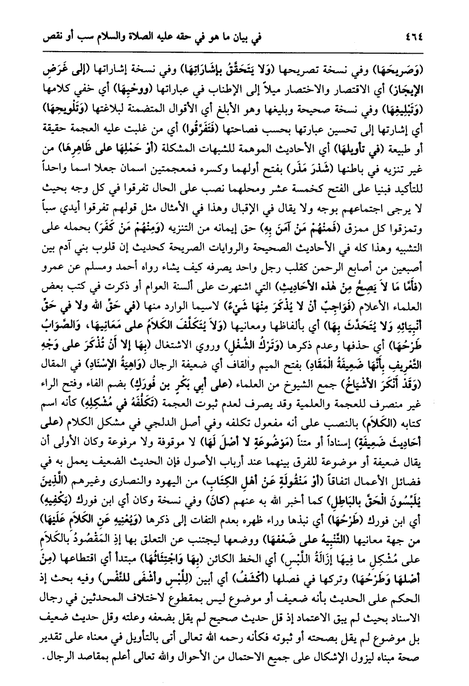 (وصريحها) وفي نسخة تصريحها (ولا يتحقّق بإشاراتها) وفي نسخة إشاراتها (إلى غرض الإيجاز) أي الاقتصار والاختصار ميلا إلى الإطناب في عباراتها (ووحيها) أي خفي كلامها (وتبليغها) وفي نسخة صحيحة وبليغها وهو الأبلغ أي الأقوال المتضمنة لبلاغتها (وتلويحها) أي إشارتها إلى تحسين عبارتها بحسب فصاحتها (فتفرّقوا) أي من غلبت عليه العجمة حقيقة أو طبيعة (في تأويلها) أي الأحاديث الموهمة للشبهات المشكلة (أو حملها على ظاهرها) من غير تنزيه في باطنها (شذر مذر) بفتح أولهما وكسره فمعجمتين اسمان جعلا اسما واحدا للتأكيد فبنيا على الفتح كخمسة عشر ومحلهما نصب على الحال تفرقوا في كل وجه بحيث لا يرجى اجتماعهم بوجه ولا يقال في الإقبال وهذا في الأمثال مثل قولهم تفرقوا أيدي سبا وتمزقوا كل ممزق (فمنهم من آمن به) حق إيمانه من التنزيه (ومنهم من كفر) بحمله على التشبيه وهذا كله في الأحاديث الصحيحة والروايات الصريحة كحديث إن قلوب بني آدم بين أصبعين من أصابع الرحمن كقلب رجل واحد يصرفه كيف يشاء رواه أحمد ومسلم عن عمرو (فَأَمَّا مَا لَا يَصِحُّ مِنْ هَذِهِ الْأَحَادِيثِ) التي اشتهرت على ألسنة العوام أو ذكرت في كتب بعض العلماء الأعلام (فواجب أن لا يذكر منها شيء) لا سيما الوارد منها (فِي حَقِّ اللَّهِ وَلَا فِي حَقِّ أَنْبِيَائِهِ ولا يتحدّث بها) أي بألفاظها ومعانيها (وَلَا يُتَكَلَّفُ الْكَلَامُ عَلَى مَعَانِيهَا، وَالصَّوَابُ طَرْحُهَا) أي حذفها وعدم ذكرها (وترك الشّغل) وروي الاشتغال (بِهَا إِلَّا أَنْ تُذْكَرَ عَلَى وَجْهِ التَّعْرِيفِ بأنّها ضعيفة المقاد) بفتح الميم والقاف أي ضعيفة الرجال (واهية الإسناد) في المقال (وقد أنكر الأشياخ) جمع الشيوخ من العلماء (على أبي بكر بن فورك) بضم الفاء وفتح الراء غير منصرف للعجمة والعلمية وقد يصرف لعدم ثبوت العجمة (تكلّفه في مشكله) كأنه اسم كتابه (الكلام) بالنصب على أنه مفعول تكلفه وفي أصل الدلجي في مشكل الكلام (على أحاديث ضعيفة) إسنادا أو متنا (موضوعة لا أصل لها) لا موقوفة ولا مرفوعة وكان الأولى أن يقال ضعيفة أو موضوعة للفرق بينهما عند أرباب الأصول فإن الحديث الضعيف يعمل به في فضائل الأعمال اتفاقا (أو منقولة عن أهل الكتاب) من اليهود والنصارى وغيرهم (الّذين يلبّسون الحقّ بالباطل) كما أخبر الله به عنهم (كان) وفي نسخة وكان أي ابن فورك (يكفيه) أي ابن فورك (طرحها) أي نبذها وراء ظهره بعدم التفات إلى ذكرها (ويعنيه عن الكلام عليها) من جهة معانيها (التّنبيه على ضعفها) ووضعها ليجتنب عن التعلق بها إِذِ الْمَقْصُودُ بِالْكَلَامِ عَلَى مُشْكِلِ مَا فِيهَا إزالة اللّبس) أي الخط الكائن (بها واجتثاثها) مبتدأ أي اقتطاعها (من أصلها وطرحها) وتركها في فصلها (أكشف) أي أبين (للّبس وأشفى للنّفس) وفيه بحث إذ الحكم على الحديث بأنه ضعيف أو موضوع ليس بمقطوع لاختلاف المحدثين في رجال الاسناد بحيث لم يبق الاعتماد إذ قل حديث صحيح لم يقل بضعفه وعلته وقل حديث ضعيف بل موضوع لم يقل بصحته أو ثبوته فكأنه رحمه الله تعالى أتى بالتأويل في معناه على تقدير صحة مبناه ليزول الإشكال على جميع الاحتمال من الأحوال والله تعالى أعلم بمقاصد الرجال.