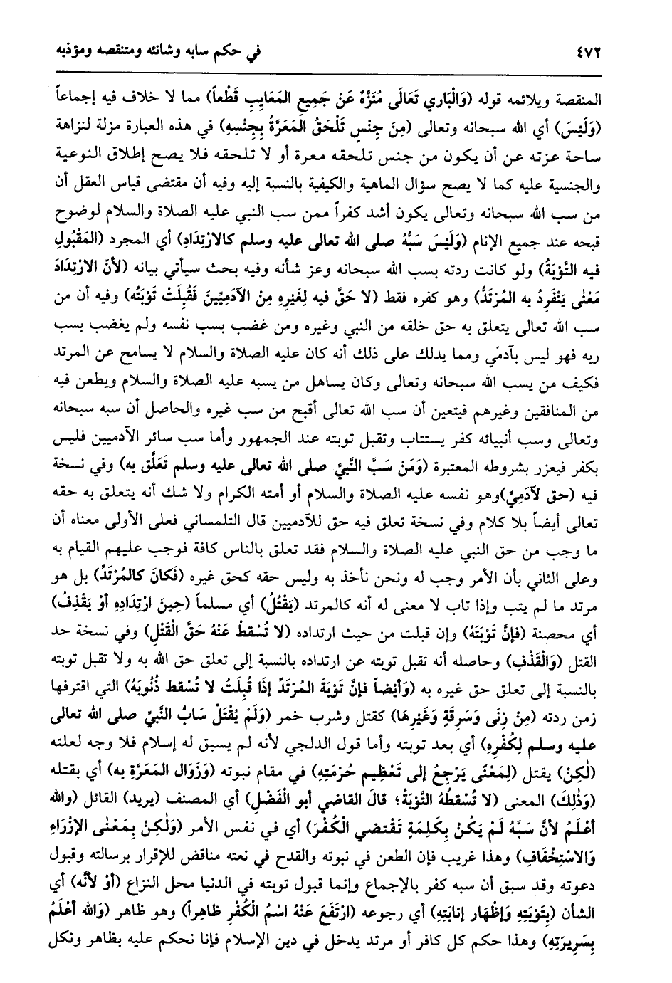 المنقصة ويلائمه قوله (والباري تعالى منزّه عن جميع المعايب قطعا) مما لا خلاف فيه إجماعا (وليس) أي الله سبحانه وتعالى (من جنس تلحق المعرّة بجنسه) في هذه العبارة مزلة لنزاهة ساحة عزته عن أن يكون من جنس تلحقه معرة أو لا تلحقه فلا يصح إطلاق النوعية والجنسية عليه كما لا يصح سؤال الماهية والكيفية بالنسبة إليه وفيه أن مقتضى قياس العقل أن من سب الله سبحانه وتعالى يكون أشد كفرا ممن سب النبي عليه الصلاة والسلام لوضوح قبحه عند جميع الإنام (وليس سبّه صلى الله تعالى عليه وسلم كالارتداد) أي المجرد (المقبول فيه التّوبة) ولو كانت ردته بسب الله سبحانه وعز شأنه وفيه بحث سيأتي بيانه (لأنّ الارتداد معنى ينفرد به المرتدّ) وهو كفره فقط (لَا حَقَّ فِيهِ لِغَيْرِهِ مِنَ الْآدَمِيِّينَ فَقُبِلَتْ توبته) وفيه أن من سب الله تعالى يتعلق به حق خلقه من النبي وغيره ومن غضب بسب نفسه ولم يغضب بسب ربه فهو ليس بآدمي ومما يدلك على ذلك أنه كان عليه الصلاة والسلام لا يسامح عن المرتد فكيف من يسب الله سبحانه وتعالى وكان يساهل من يسبه عليه الصلاة والسلام ويطعن فيه من المنافقين وغيرهم فيتعين أن سب الله تعالى أقبح من سب غيره والحاصل أن سبه سبحانه وتعالى وسب أنبيائه كفر يستتاب وتقبل توبته عند الجمهور وأما سب سائر الآدميين فليس بكفر فيعزر بشروطه المعتبرة (ومن سبّ النّبيّ صلى الله تعالى عليه وسلم تعلّق به) وفي نسخة فيه (حق لآدميّ) وهو نفسه عليه الصلاة والسلام أو أمته الكرام ولا شك أنه يتعلق به حقه تعالى أيضا بلا كلام وفي نسخة تعلق فيه حق للآدميين قال التلمساني فعلى الأولى معناه أن ما وجب من حق النبي عليه الصلاة والسلام فقد تعلق بالناس كافة فوجب عليهم القيام به وعلى الثاني بأن الأمر وجب له ونحن نأخذ به وليس حقه كحق غيره (فكان كالمرتدّ) بل هو مرتد ما لم يتب وإذا تاب لا معنى له أنه كالمرتد (يقتل) أي مسلما (حين ارتداده أو يقذف) أي محصنة (فإنّ توبته) وإن قبلت من حيث ارتداده (لا تسقط عنه حقّ القتل) وفي نسخة حد القتل (والقذف) وحاصله أنه تقبل توبته عن ارتداده بالنسبة إلى تعلق حق الله به ولا تقبل توبته بالنسبة إلى تعلق حق غيره به (وَأَيْضًا فَإِنَّ تَوْبَةَ الْمُرْتَدِّ إِذَا قُبِلَتْ لَا تسقط ذنوبه) التي اقترفها زمن ردته (من زنى وسرقة وغيرها) كقتل وشرب خمر (ولم يقتل سابّ النّبيّ صلى الله تعالى عليه وسلم لكفره) أي بعد توبته وأما قول الدلجي لأنه لم يسبق له إسلام فلا وجه لعلته (لكن) يقتل (لمعنى يرجع إلى تعظيم حرمته) في مقام نبوته (وزوال المعرّة به) أي بقتله (وذلك) المعنى (لَا تُسْقِطُهُ التَّوْبَةُ؛ قَالَ الْقَاضِي أَبُو الْفَضْلِ) أي المصنف (يريد) القائل (وَاللَّهُ أَعْلَمُ لِأَنَّ سَبَّهُ لَمْ يَكُنْ بِكَلِمَةٍ تقتضي الكفر) أي في نفس الأمر (ولكن بمعنى الإزراء والاستخفاف) وهذا غريب فإن الطعن في نبوته والقدح في نعته مناقض للإقرار برسالته وقبول دعوته وقد سبق أن سبه كفر بالإجماع وإنما قبول توبته في الدنيا محل النزاع (أو لأنّه) أي الشأن (بتوبته وإظهار إنابته) أي رجوعه (ارتفع عنه اسم الكفر ظاهرا) وهو ظاهر (والله أعلم بسريرته) وهذا حكم كل كافر أو مرتد يدخل في دين الإسلام فإنا نحكم عليه بظاهر ونكل