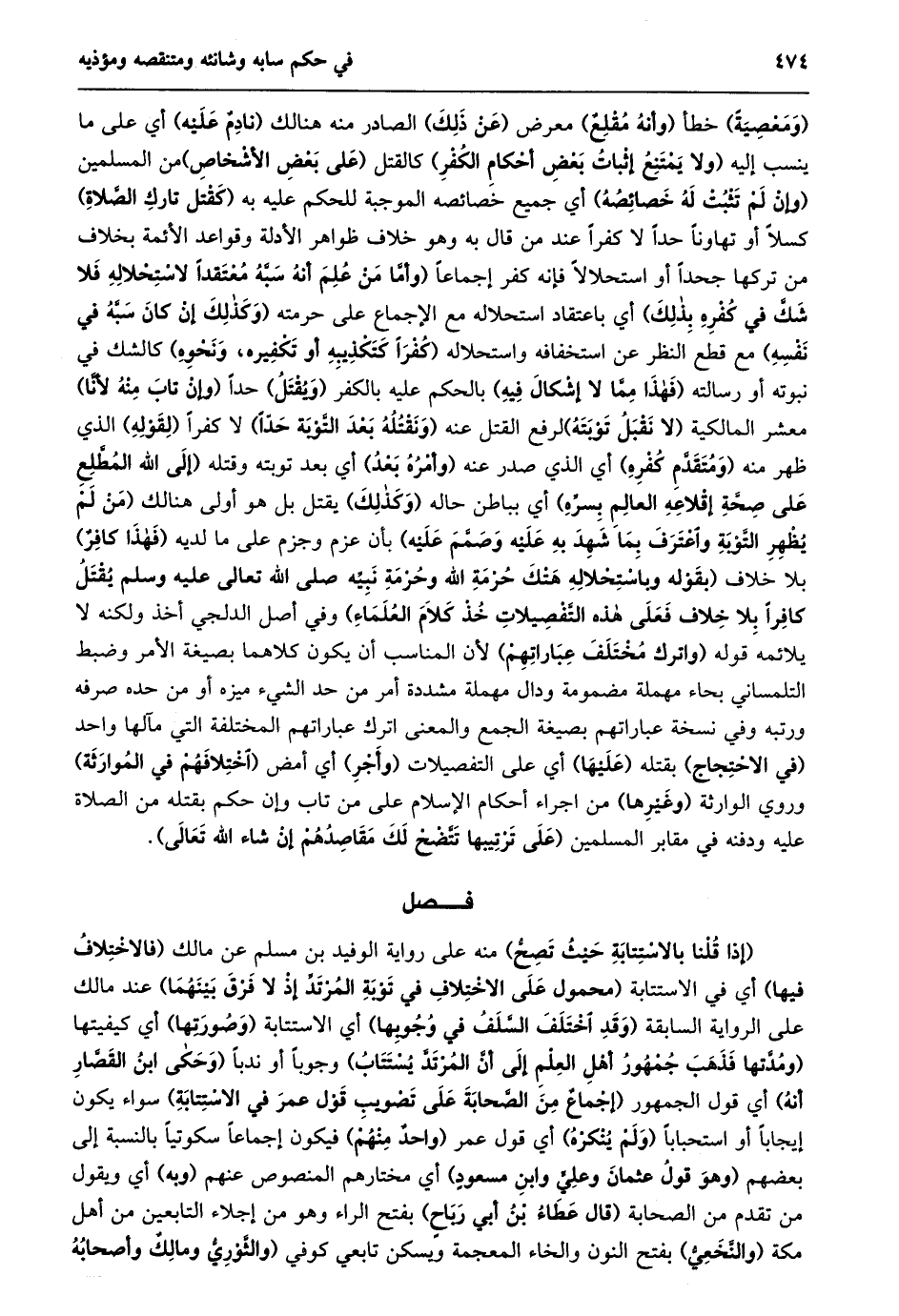 (ومعصية) خطأ (وأنه مقلع) معرض (عن ذلك) الصادر منه هنالك (نادم عليه) أي على ما ينسب إليه (ولا يمتنع إثبات بعض أحكام الكفر) كالقتل (على بعض الأشخاص) من المسلمين (وإن لم تثبت له خصائصه) أي جميع خصائصه الموجبة للحكم عليه به (كقتل تارك الصّلاة) كسلا أو تهاونا حدا لا كفرا عند من قال به وهو خلاف ظواهر الأدلة وقواعد الأئمة بخلاف من تركها جحدا أو استحلالا فإنه كفر إجماعا (وأمّا من علم أنه سبّه معتقدا لاستحلاله فلا شكّ في كفره بذلك) أي باعتقاد استحلاله مع الإجماع على حرمته (وكذلك إن كان سبّه في نفسه) مع قطع النظر عن استخفافه واستحلاله (كفرا كتكذيبه أو تكفيره، ونحوه) كالشك في نبوته أو رسالته (فهذا ممّا لا إشكال فيه) بالحكم عليه بالكفر (ويقتل) حدا (وإن تاب منه لأنّا) معشر المالكية (لا نقبل توبته) لرفع القتل عنه (ونقتله بعد التّوبة حدّا) لا كفرا (لقوله) الذي ظهر منه (ومتقدّم كفره) أي الذي صدر عنه (وأمره بعد) أي بعد توبته وقتله (إِلَى اللَّهِ الْمُطَّلِعِ عَلَى صِحَّةِ إِقْلَاعِهِ الْعَالِمِ بسرّه) أي بباطن حاله (وكذلك) يقتل بل هو أولى هنالك (مَنْ لَمْ يُظْهِرِ التَّوْبَةَ وَاعْتَرَفَ بِمَا شُهِدَ به عليه وصمّم عليه) بأن عزم وجزم على ما لديه (فهذا كافر) بلا خلاف (بِقَوْلِهِ وَبِاسْتِحْلَالِهِ هَتْكَ حُرْمَةِ اللَّهِ وَحُرْمَةِ نَبِيِّهِ صلى الله تعالى عَلَيْهِ وَسَلَّمَ يُقْتَلُ كَافِرًا بِلَا خِلَافٍ فَعَلَى هذه التّفصيلات خذ كلام العلماء) وفي أصل الدلجي أخذ ولكنه لا يلائمه قوله (واترك مختلف عباراتهم) لأن المناسب أن يكون كلاهما بصيغة الأمر وضبط التلمساني بحاء مهملة مضمومة ودال مهملة مشددة أمر من حد الشيء ميزه أو من حده صرفه ورتبه وفي نسخة عباراتهم بصيغة الجمع والمعنى اترك عباراتهم المختلفة التي مآلها واحد (في الاحتجاج) بقتله (عليها) أي على التفصيلات (وأجر) أي أمض (اختلافهم في الموارثة) وروي الوارثة (وغيرها) من اجراء أحكام الإسلام على من تاب وإن حكم بقتله من الصلاة عليه ودفنه في مقابر المسلمين (عَلَى تَرْتِيبِهَا تَتَّضِحُ لَكَ مَقَاصِدُهُمْ إِنْ شَاءَ الله تعالى) .